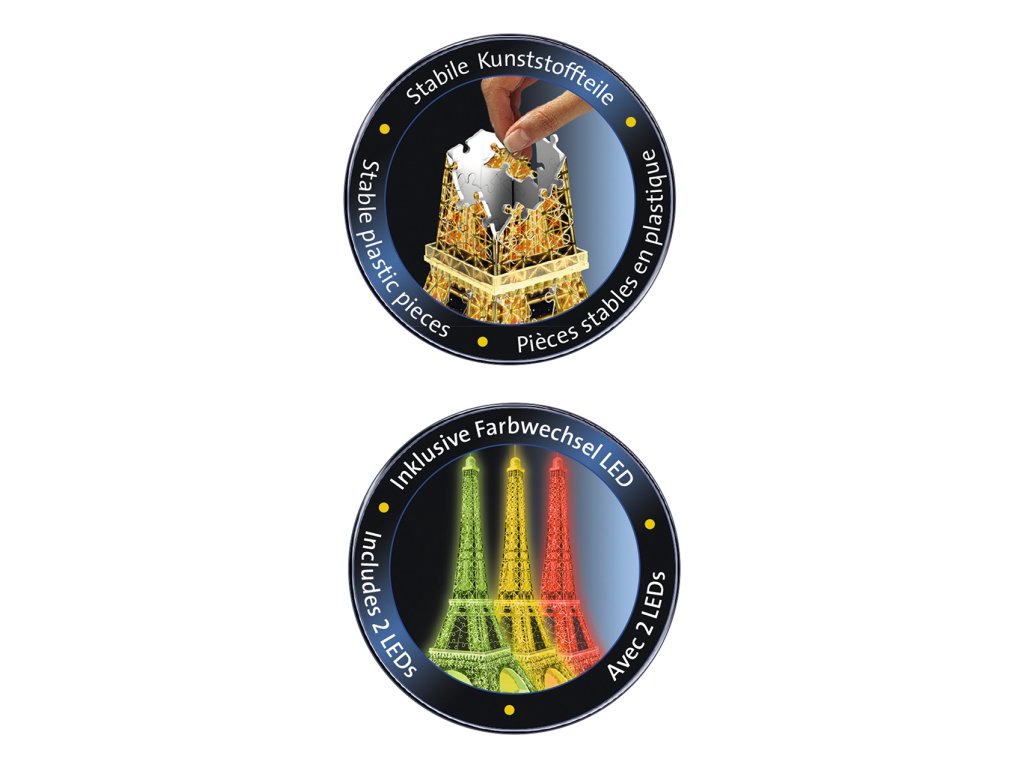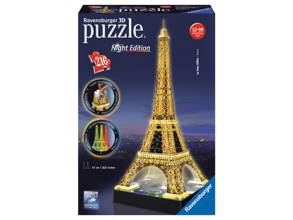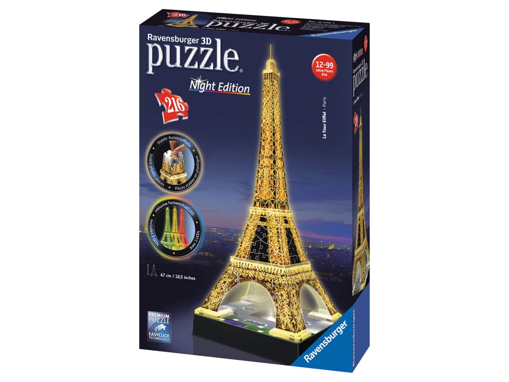 3D model Eiffelovy věže "Night Edition" je radost skládat. Můžete skládat dle předlohy nebo čísel, které jsou součástí každého z 216 platových dílků. Výsledkem je úžasný model, který složíte bez potřeby lepení! Svítí, mění barvy. Obsah balení. 216 dílků puzzle s čísly + příslušenství + návod. Rozměry složeného modelu 47x14x7cm.