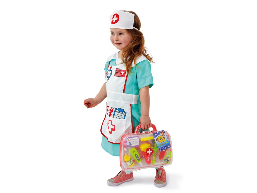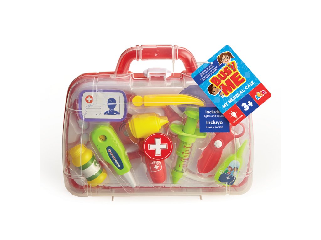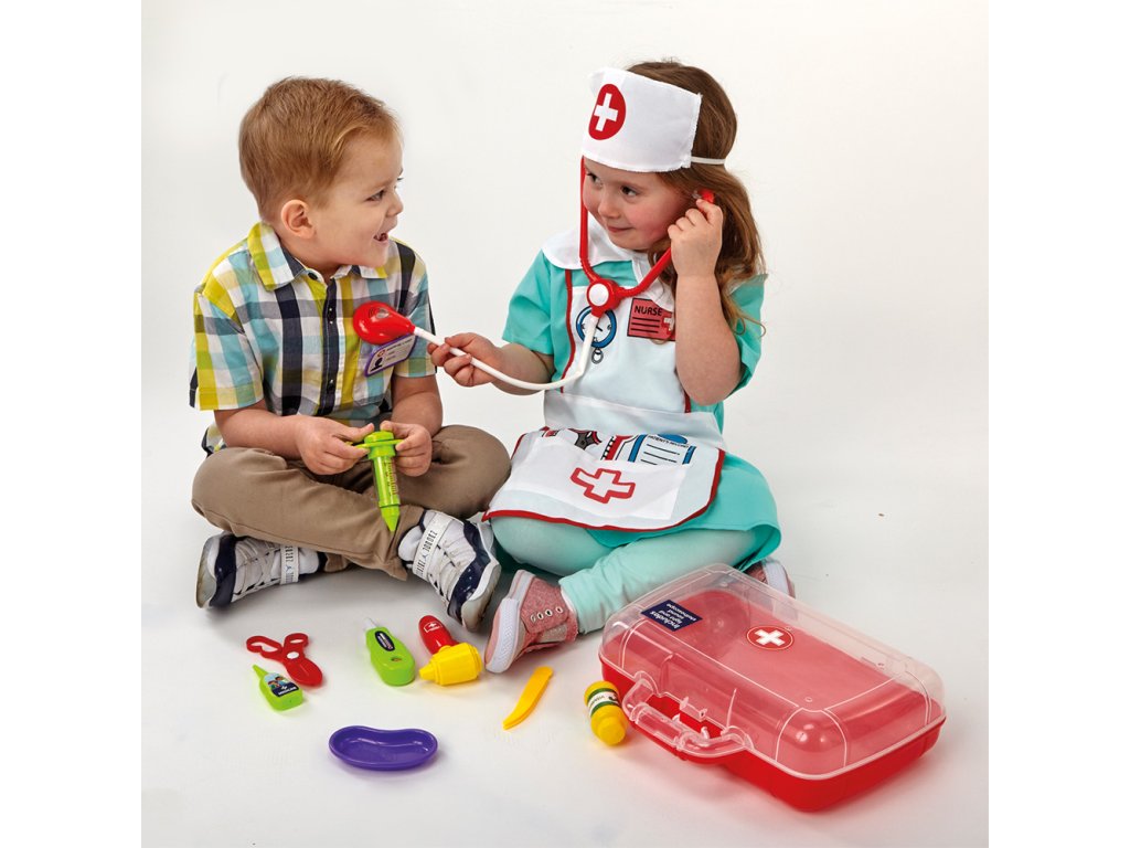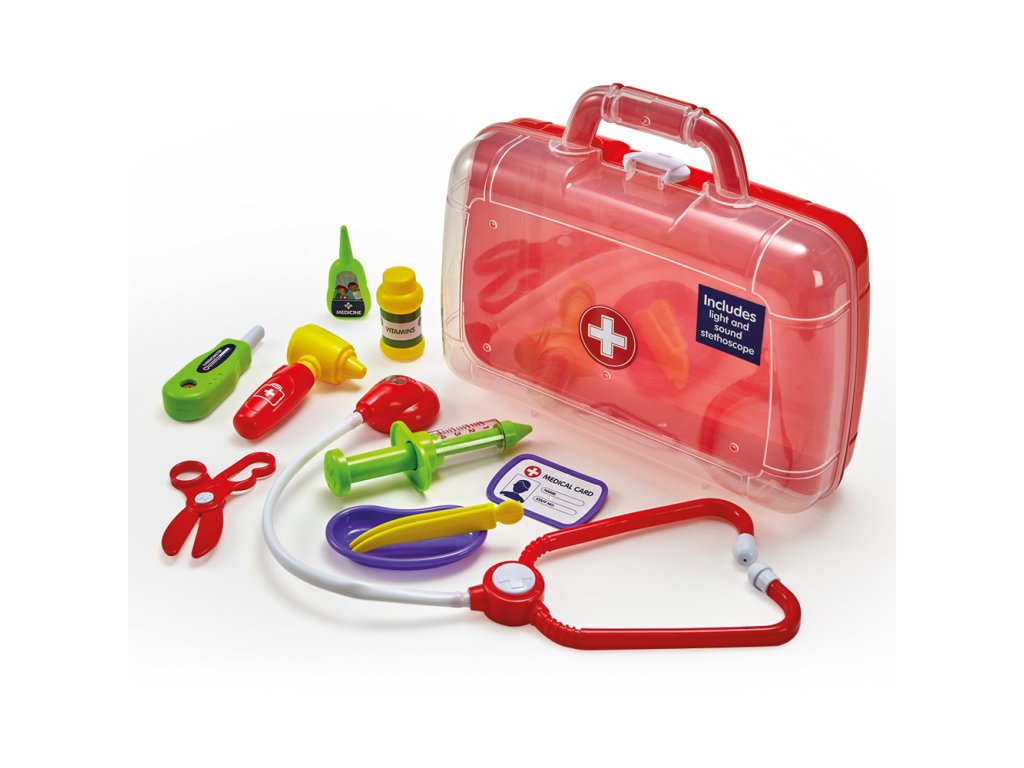 Doktorský kufřík obsahuje veškeré potřebné nástroje k vyšetření pacientů. Stetoskop a otoskop vydávají realistické zvuky a světla. Na obal kufříku mohou děti napsat své jméno, aby přátelé a rodina věděli, komu kufřík patří. Sada obsahuje: 1x světelný a zvukový stetoskop, 1x otoskop se světlem, 1x stříkačka, 1x teploměr, 1x sada pinzet, 2x lékovky, 1x nůžky a 1x ledvinka, 1x praktický kufřík. Baterie: 2xLR44 - součástí- vyměnitelné, 2xLR44 - součástí - nevyměnitelné. Rozměr balení: 24,5 x 30 x 9 cm. Věk: 3+