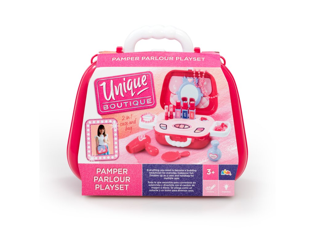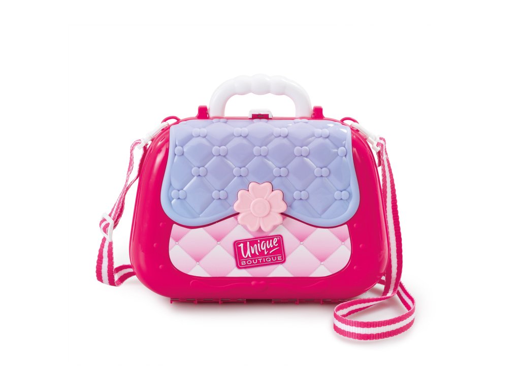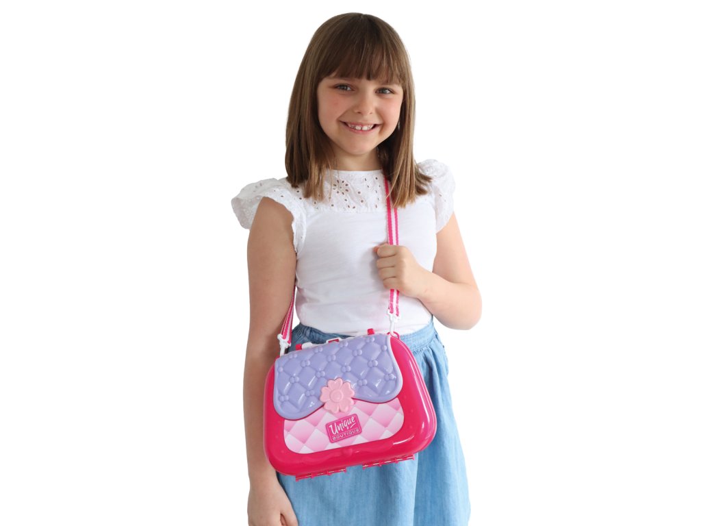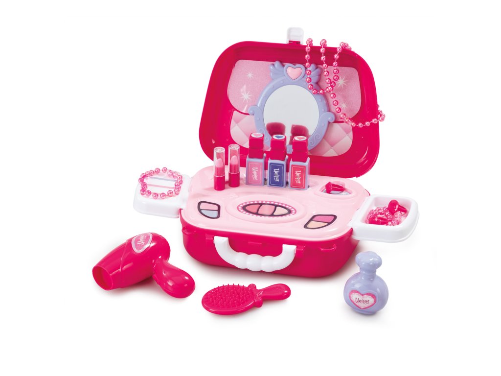 Připravme se na den s dokonalým kosmetickým setem. Noste toto robustní růžové pouzdro za rukojeť nebo jej noste se stylovým řemínkem na tělo a poté jej otevřete a odkryjte všechny jeho rozkošné doplňky. Pomocí předstíraného make-upu můžete hráty že nanášíte oční stíny, rtěnky a tvářenky. Vysušte a vykartáčujte si vlasy, nasaďte si náhrdelník, náramek a navlékněte prsteny. Poté svůj vzhled zakončete parfémem. Všechny kousky jsou napodobeniny, že jsou tak dokonalé pro holčičí zábavu! Toto roztomilé pouzdro je skvělé pro dobrodružství na cestách nebo ideální pro domácí hýčkání. Rozměry: 25x20x10cm. Věk: 3+
