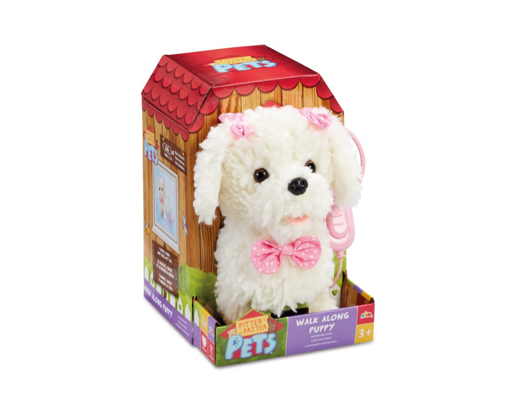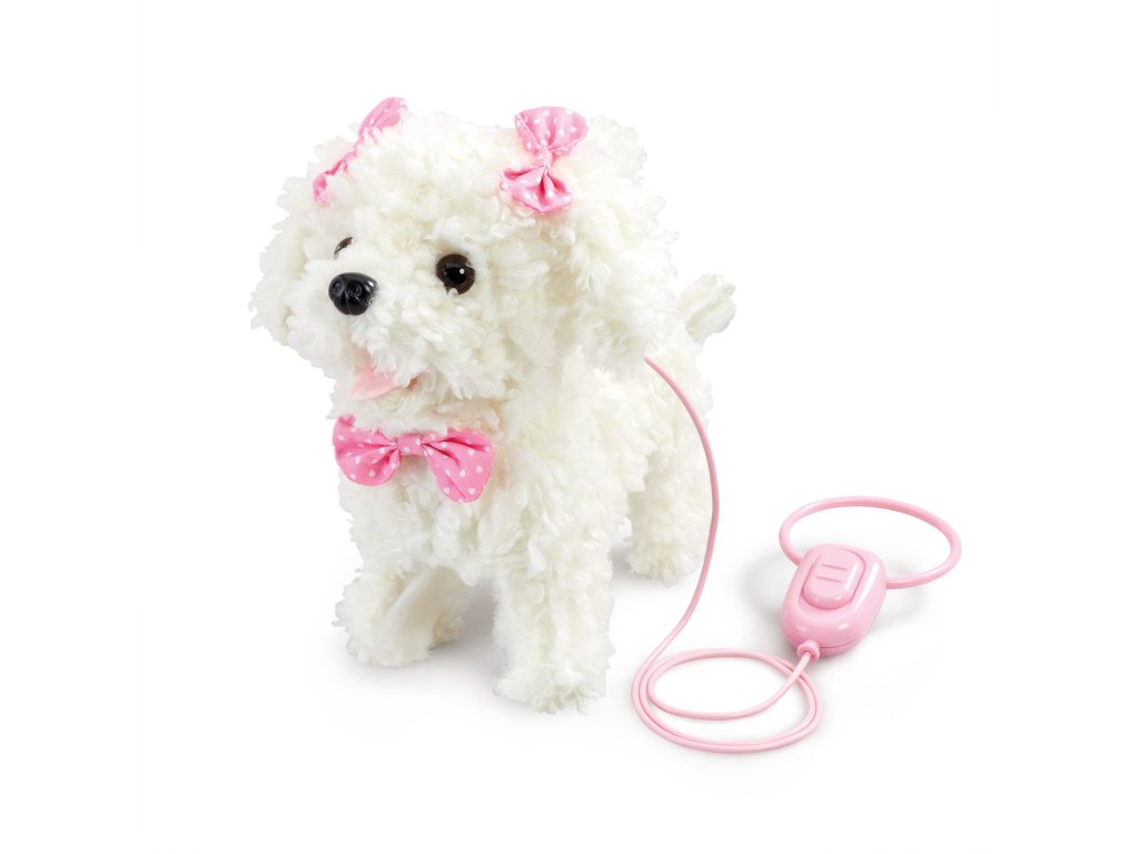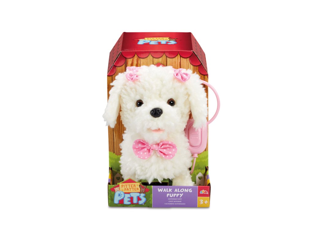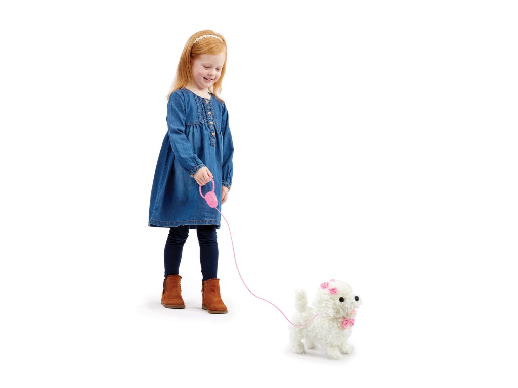 Připravte se na hodiny zábavy se štěňátkem na procházce. Haf haf! Tato roztomilá interaktivní hračka malého pudla přináší tolik zábavy při hraní! Se super jemnou bílou srstí, jasně růžovou skvrnitou mašlí kolem krku a dvěma mašlemi na uších bude váš pudlík tím nejmódnějším štěnětem ve městě. Když přijde čas na vycházky, použijte přiložený ovladač vodítka a stisknutím tlačítka vaše štěně ožije. Štěně bude štěkat, vrtět ocasem a chodit - stejně jako skutečný mazlíček! Proč nepoužijete obal vašeho mazlíčka jako součást vaší hry? Když váš malý psí mazlíček skončí s hraním, se úhledně uloží zpět do krabice jako do boudy, která lze rozložit jako pelíšek. Rozměry: 17x25x20cm. Věk: 3+
