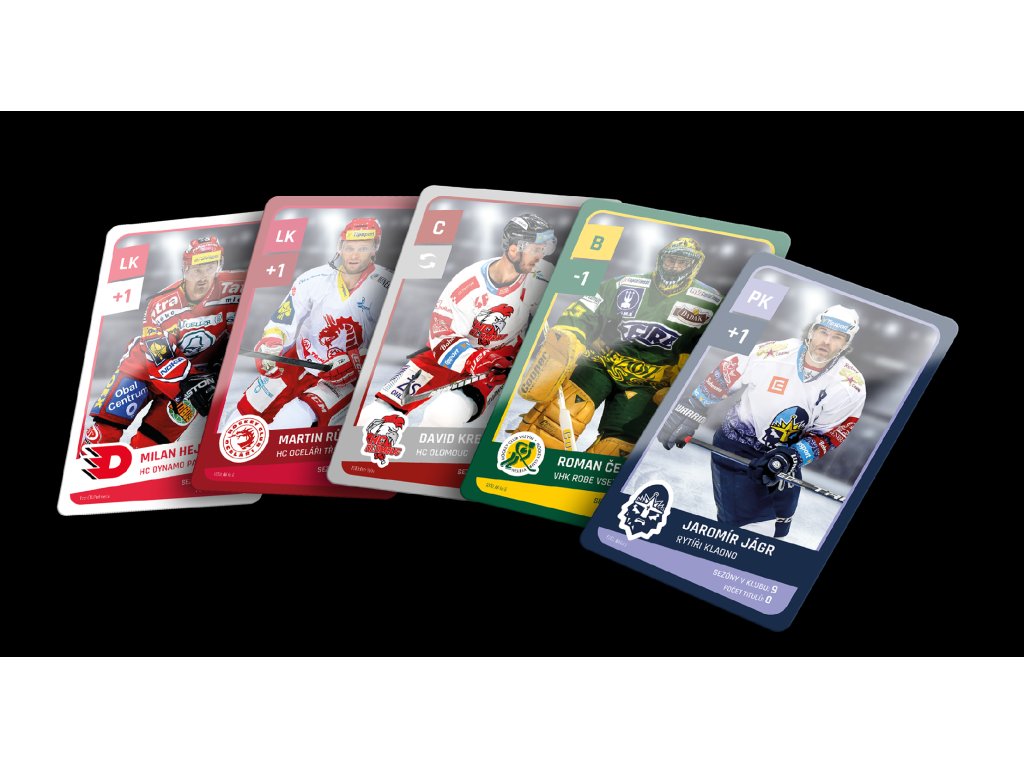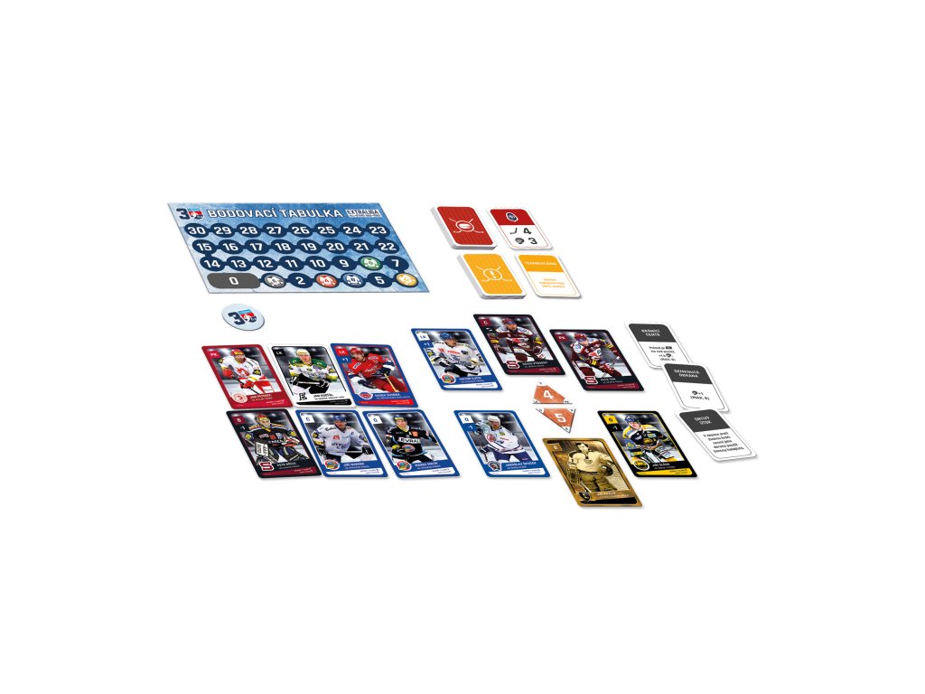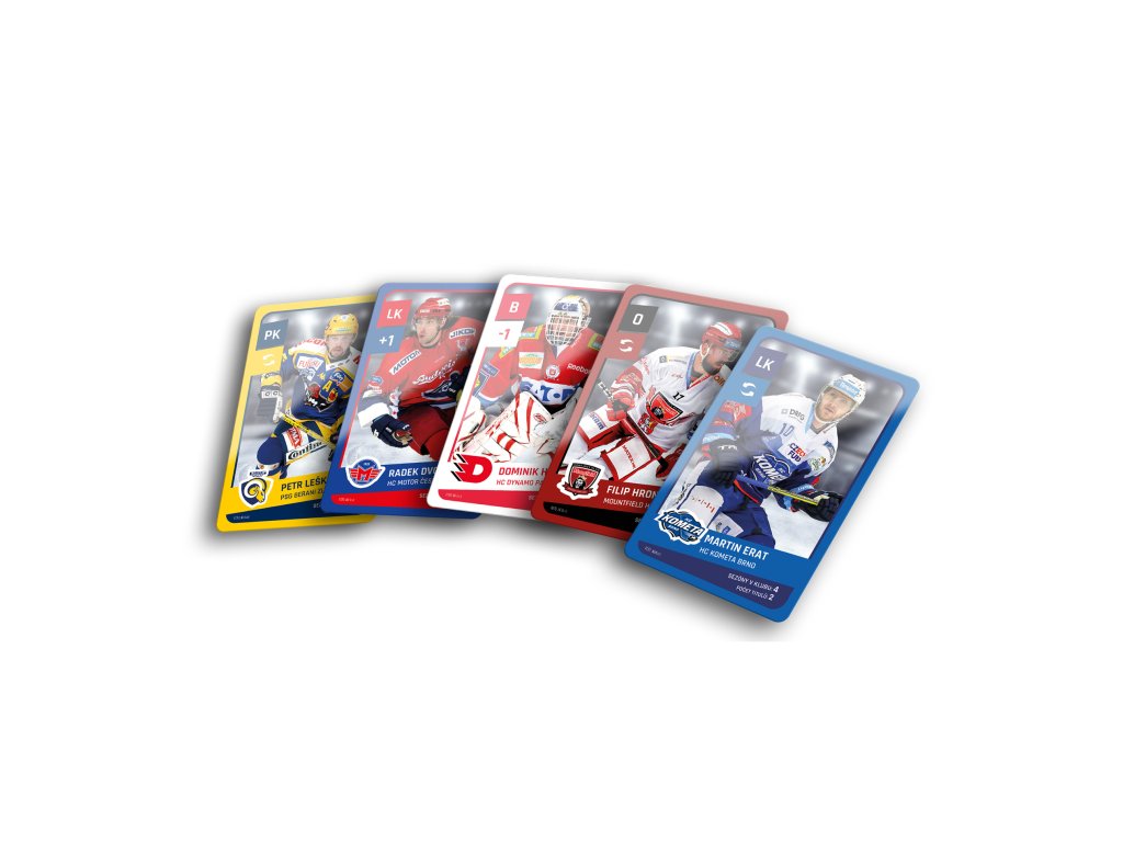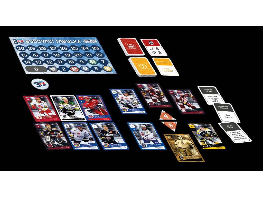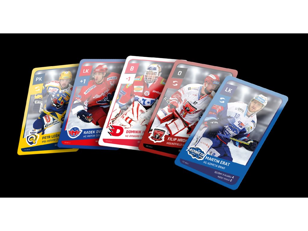 Ve hře najdete 6 karet hokejistů (centr, levé křídlo, pravé křídlo, 2 obránci, brankář) z každého ze 14 klubů, které odehrály extraligovou sezónu 2022/2023 + 3 dalších týmů, které ve třicetileté historii Extraligy získaly titul a navíc 8 karet legend předextraligové éry. Na kartách najdete pozici hráče, klubovou příslušnost, kolik let strávil v Extralize v daném klubu a kolik s ním získal titulů. Dva hráči z každého klubu maní navíc přiřazenou speciální schopnost, díky které mohou během zápasů manipulovat s kostkami.
