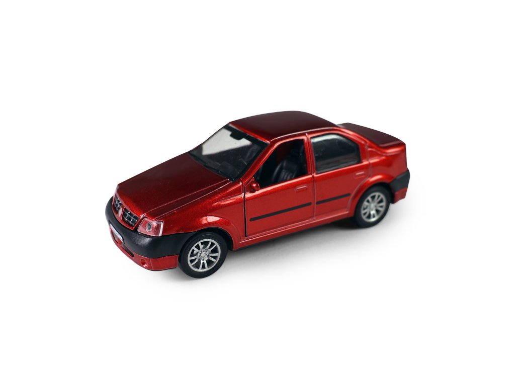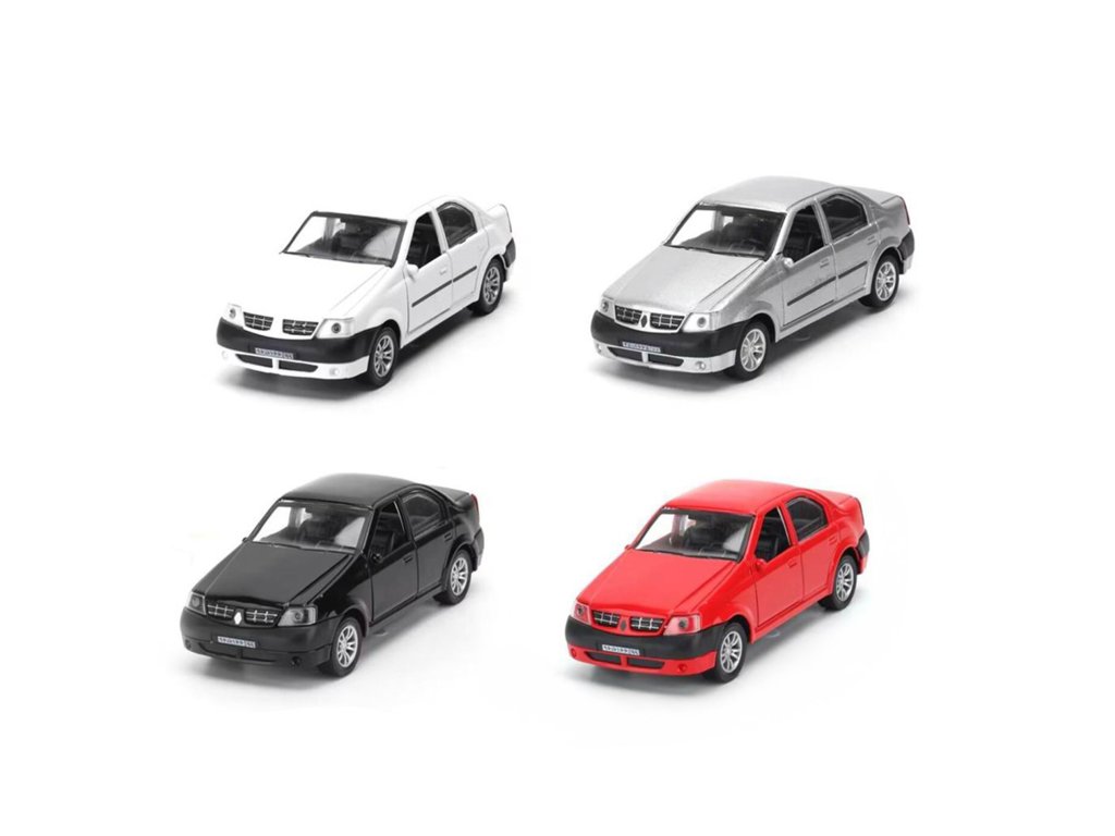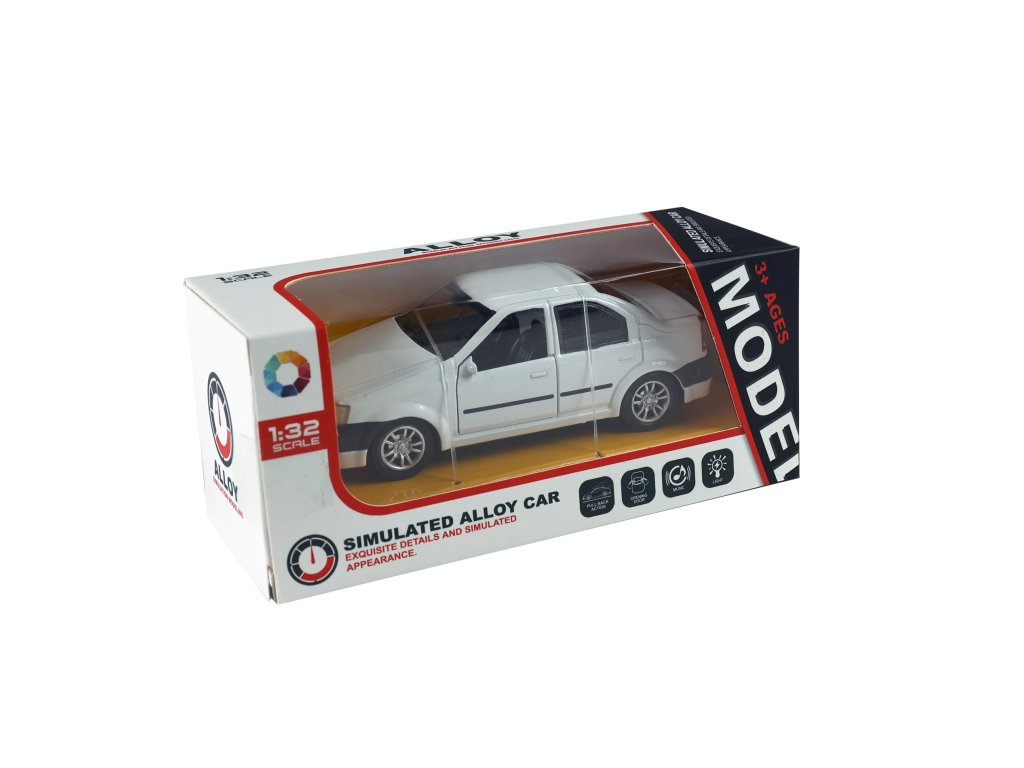Kovové autíčko s otevíracími dveřmi, při zatlačením na auto, vydává různé zvuky a svítí. Auto jezdí na zpětný setrvačník. Obsahuje 3 ks baterií typu AG13/LR44.