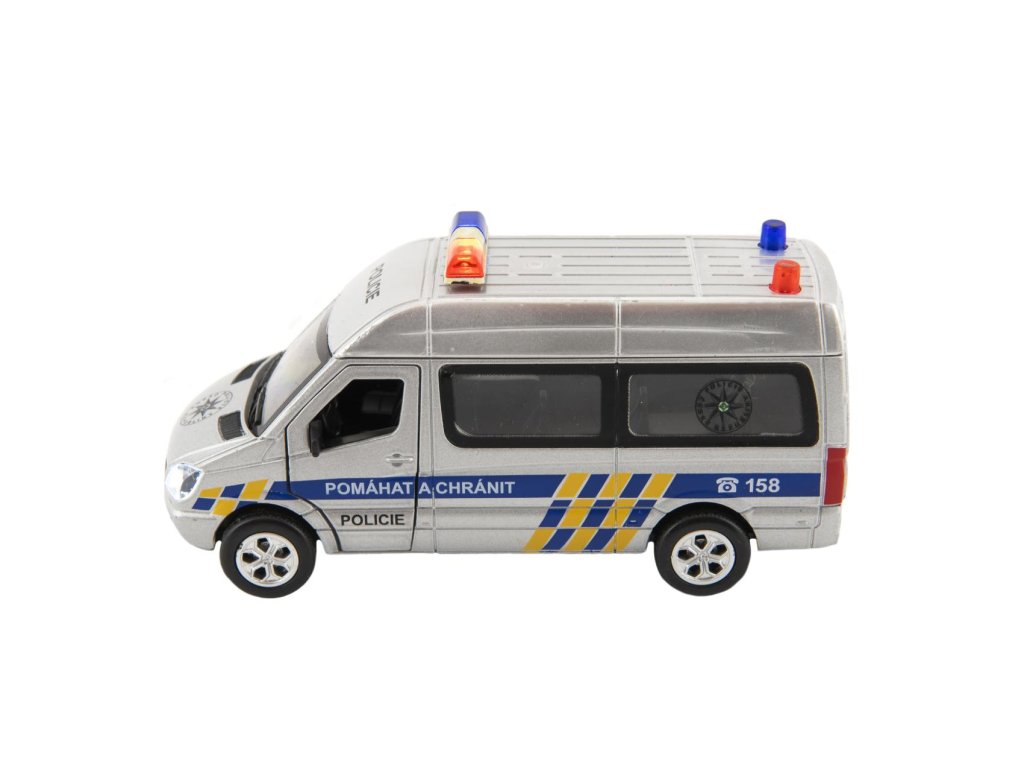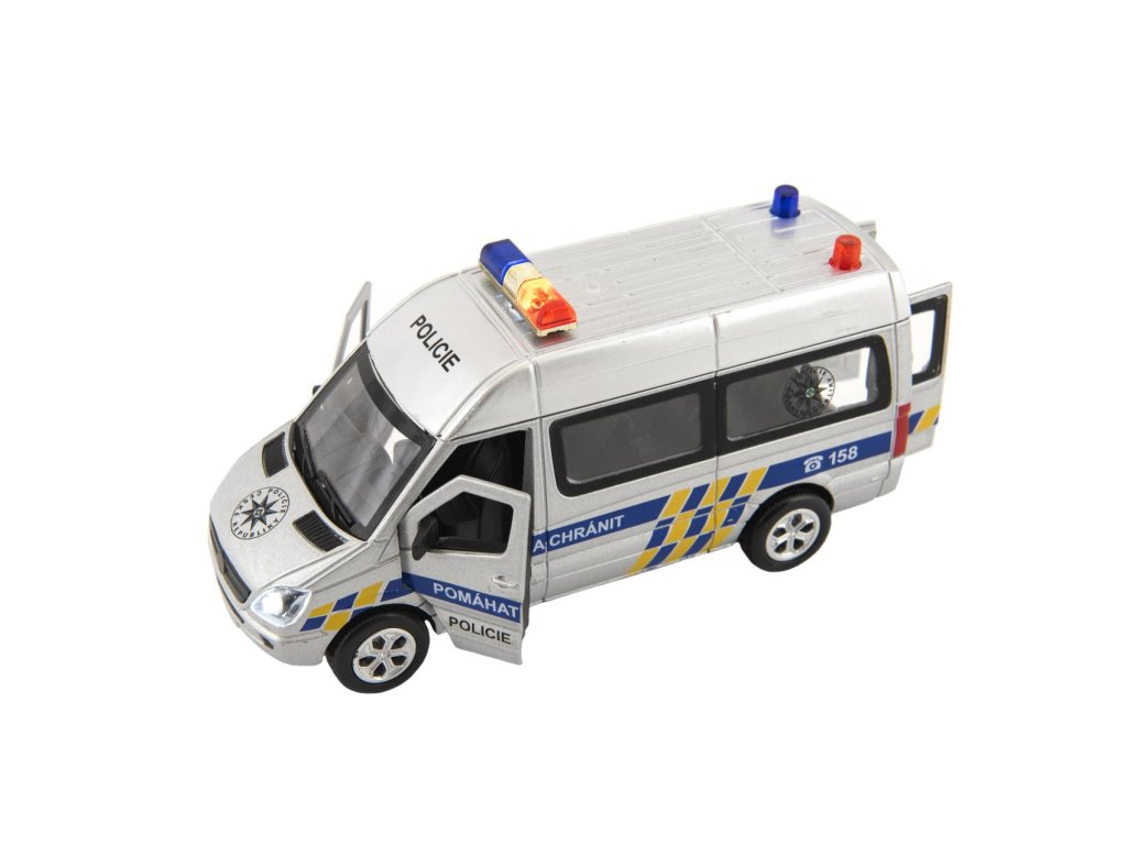 Kovové autíčko pro malé policisty je vyrobeno s plastovými doplňky. Malý model jezdí na zpětné natažení, má otevírací přední a zadní dvěře, vydává zvuky startování a houkačky, má efekty blikajících světel. Kupte dětem policejní vůz! Velikost dodávky je 15cm. Baterie 3 x AG13 jsou součástí balení a slouží pouze pro zkušební účely. Rozměry výrobku 15cm. Vhodné pro děti od 3 let.
