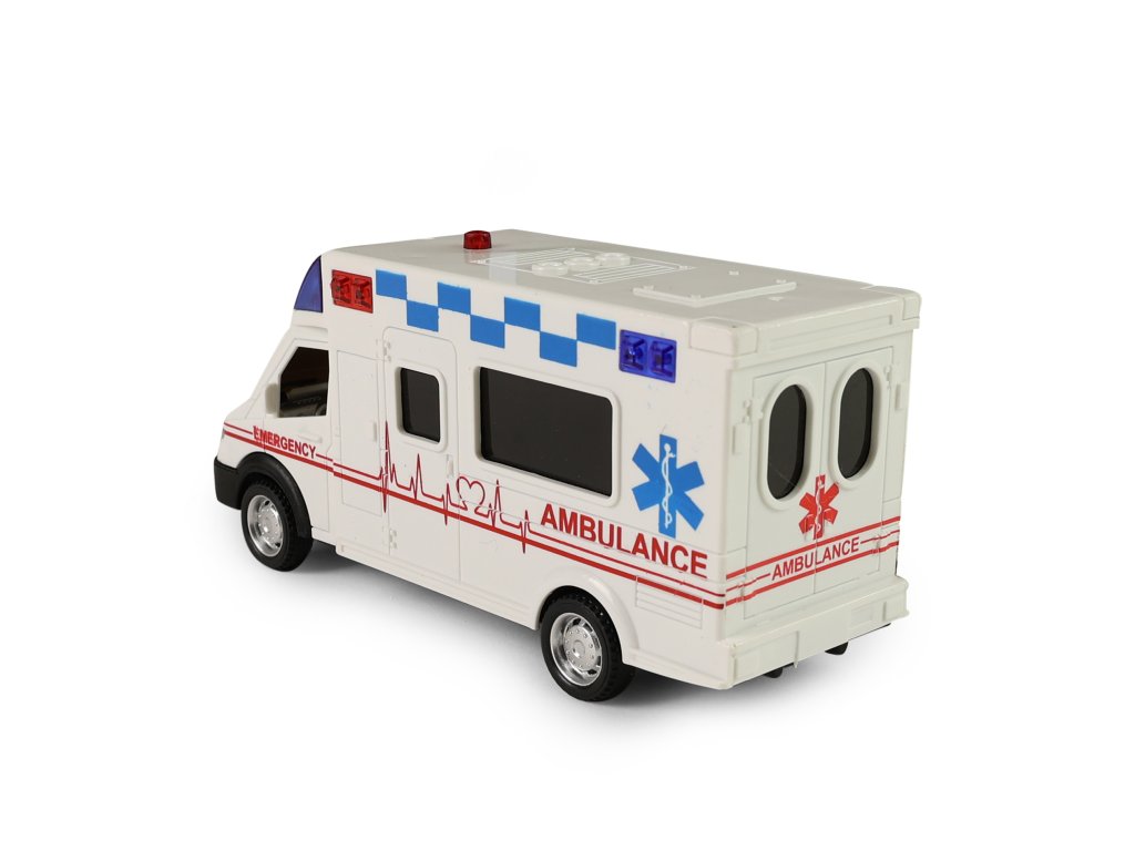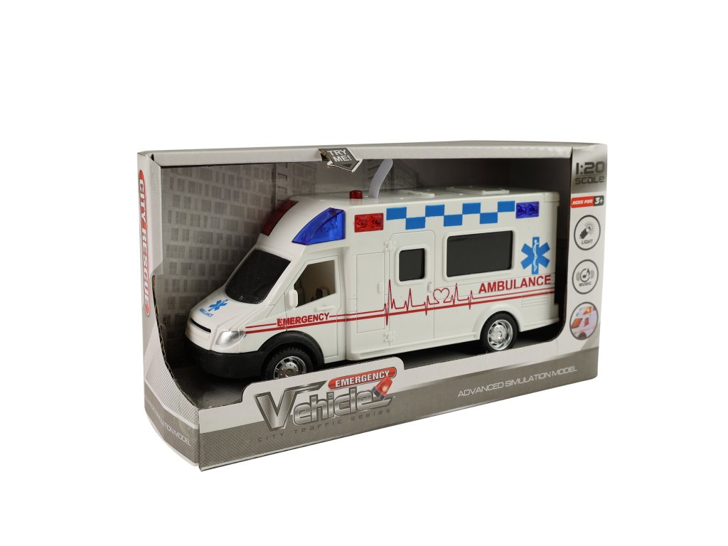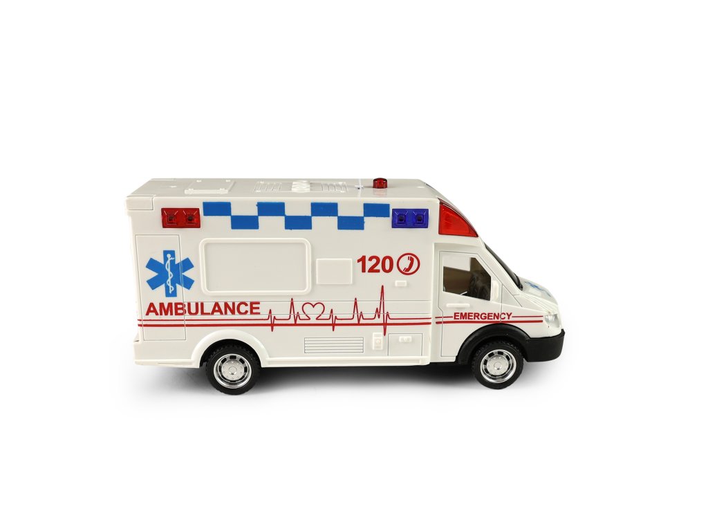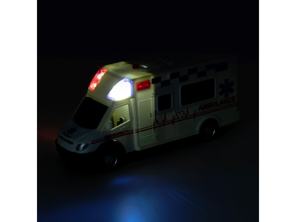 Pacient potřebuje tvoji pomoc, záchranná akce právě začíná! Sanitka po stlačení tlačítka na střeše vozu vydává reálné zvuky a bliká. Autíčko v délce 18 cm je na baterie, které jsou jeho součástí.