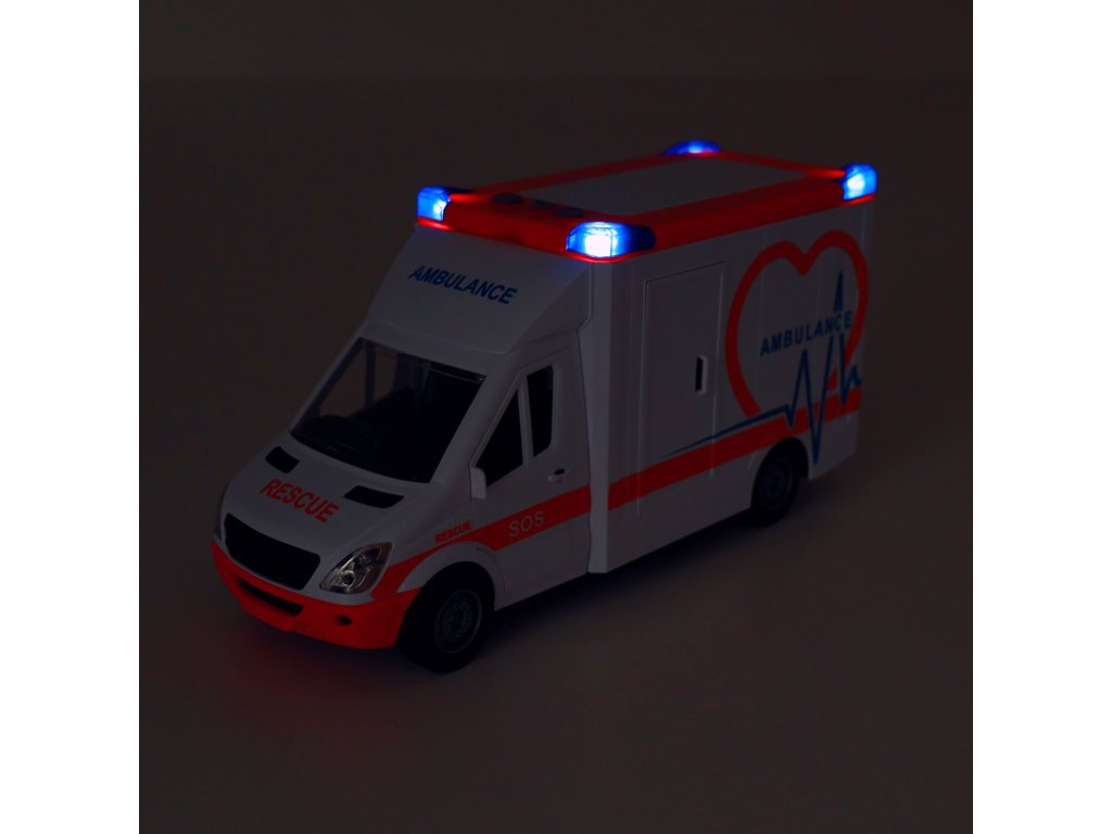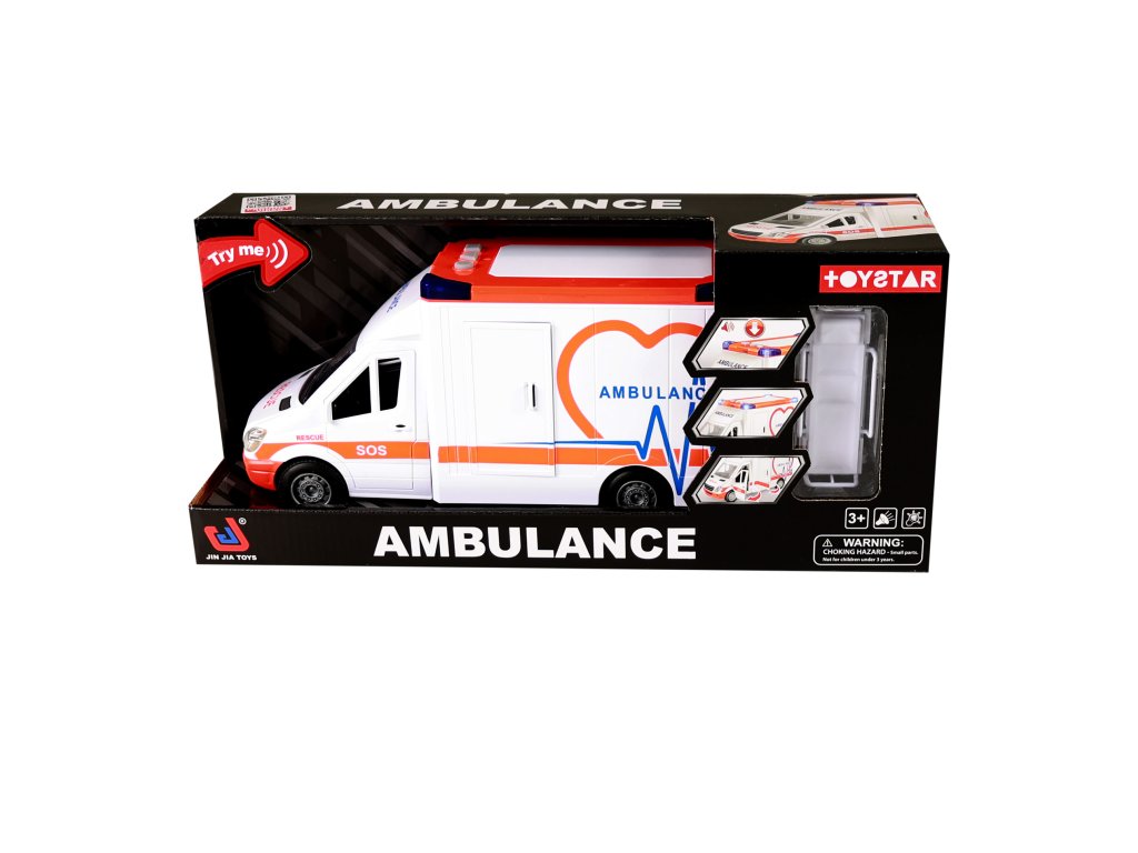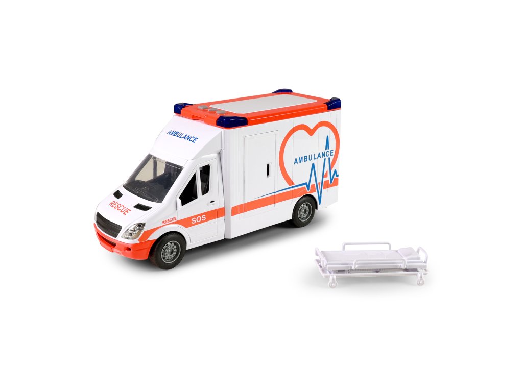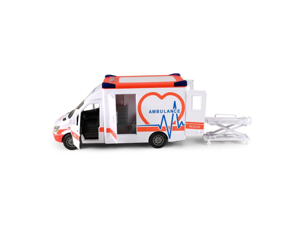 Auto sanitka s odnímatelnou střechou. Délka auta 27 cm, všechny dveře se dají otevřít. Světelné a zvukové efekty, které fungují po vložení 2xAA baterií, které nejsou součástí balení. Součástí sady jsou také nosítka.
