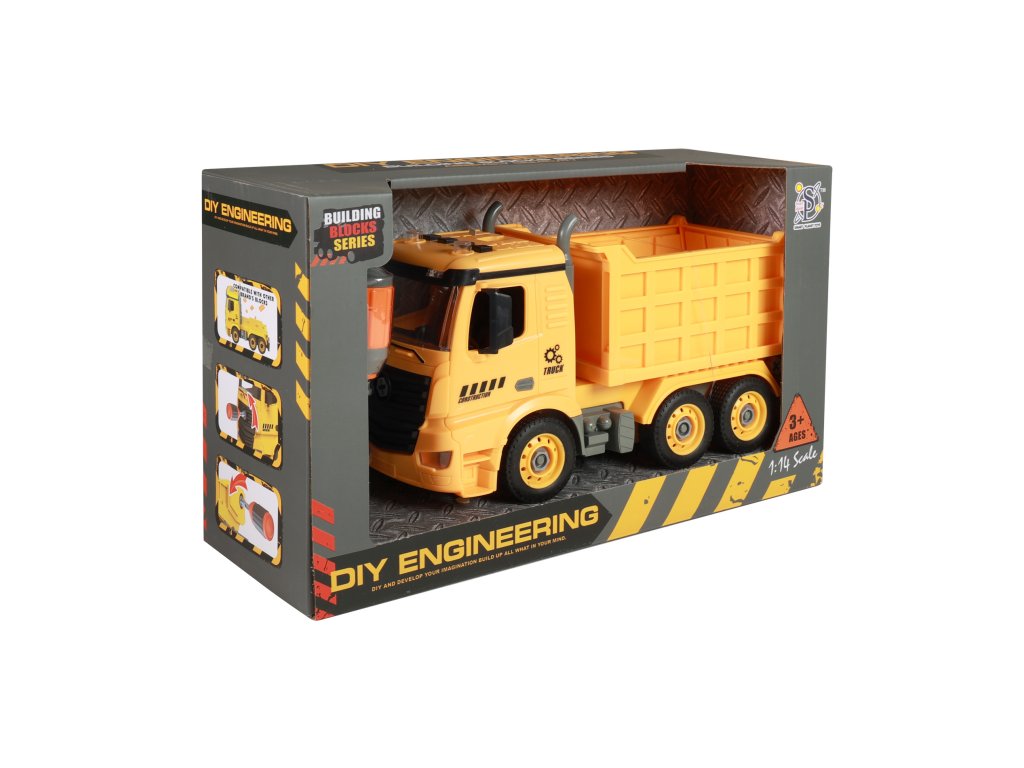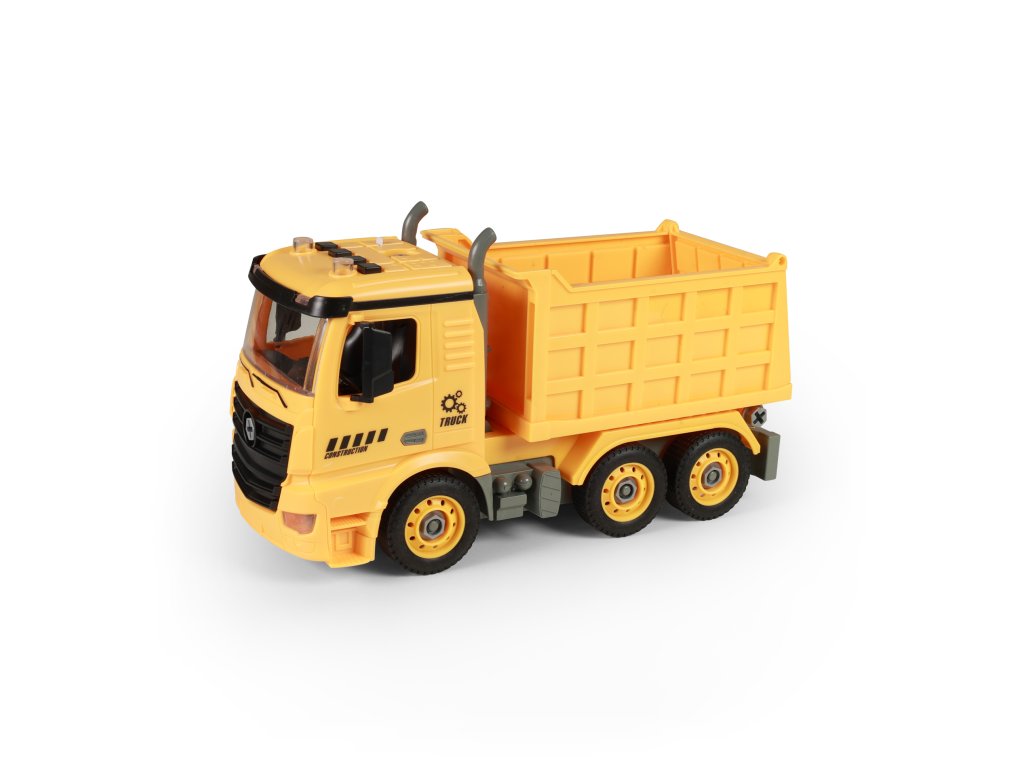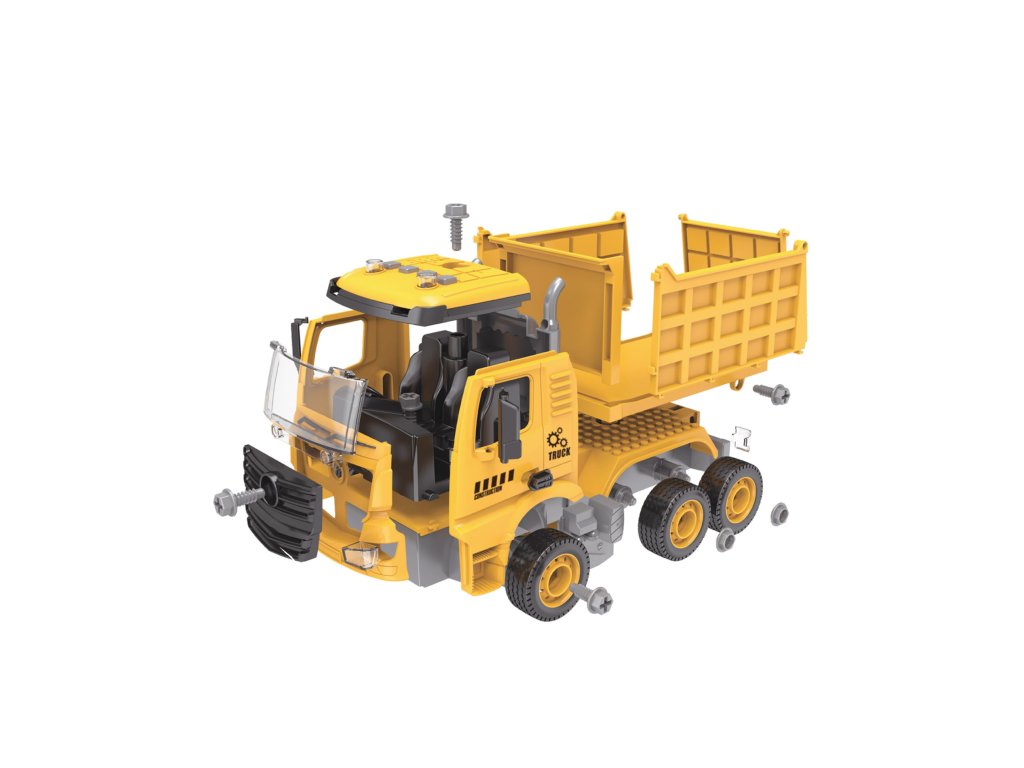 Šroubovací auto sklápěč, které se dá pomocí přiloženého dětského šroubováku snadno rozložit a zase složit. Rozvíjí technickou zručnost a kreativní myšlení. Po zmáčknutí libovolného tlačítka svítí a vydává reálné zvuky. Funguje na 3 x 1.5V LR44 baterie, které jsou součástí balení. Auto jezdí na volný chod a jeho délka je 26 cm.