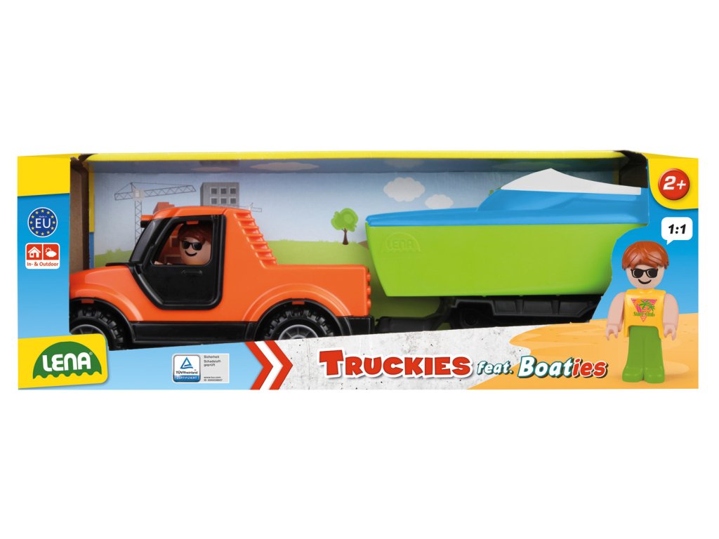 Auto Truckies Pickup s přívěsem a loďkou z kvalitního plastu a velmi pevnou stavbou. Plně mechanicky funkční. Obsahuje odklopitelnou kabinu s aktivním panáčkem. V ozdobné krabici.