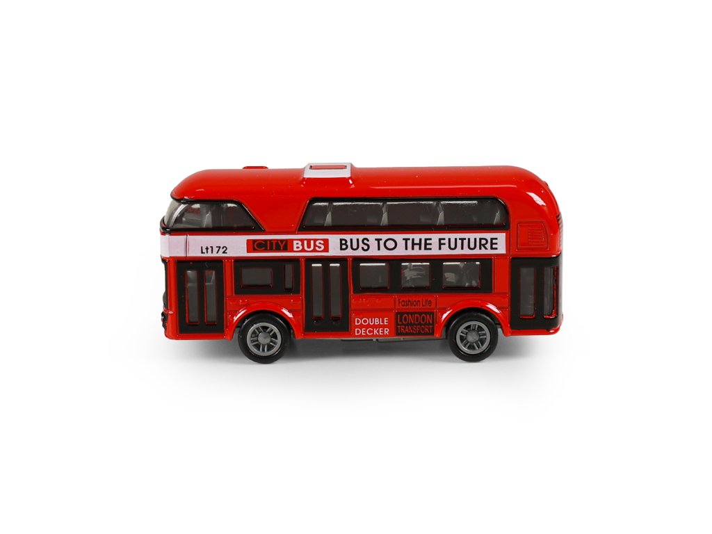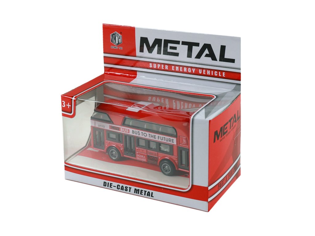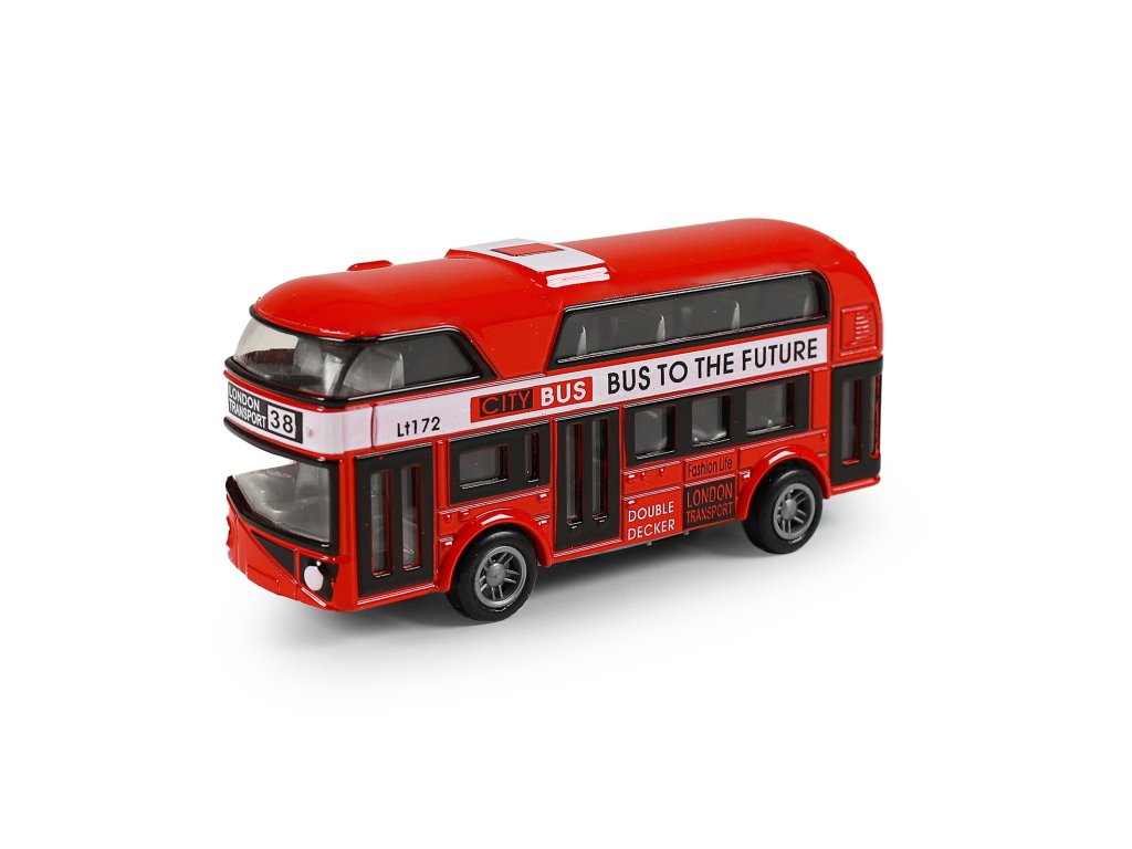 Autobus dvoupatrový, typický londýnský double decker je kovový a jezdí na zpětný chod. Délka cca 9,5 cm.
