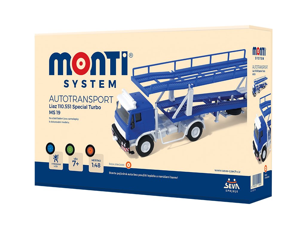Model Liaz MS 19 Autotransport v měřítku 1:48 s návěsem pro převoz aut. Stavebnice patří do řady modelů Standard.