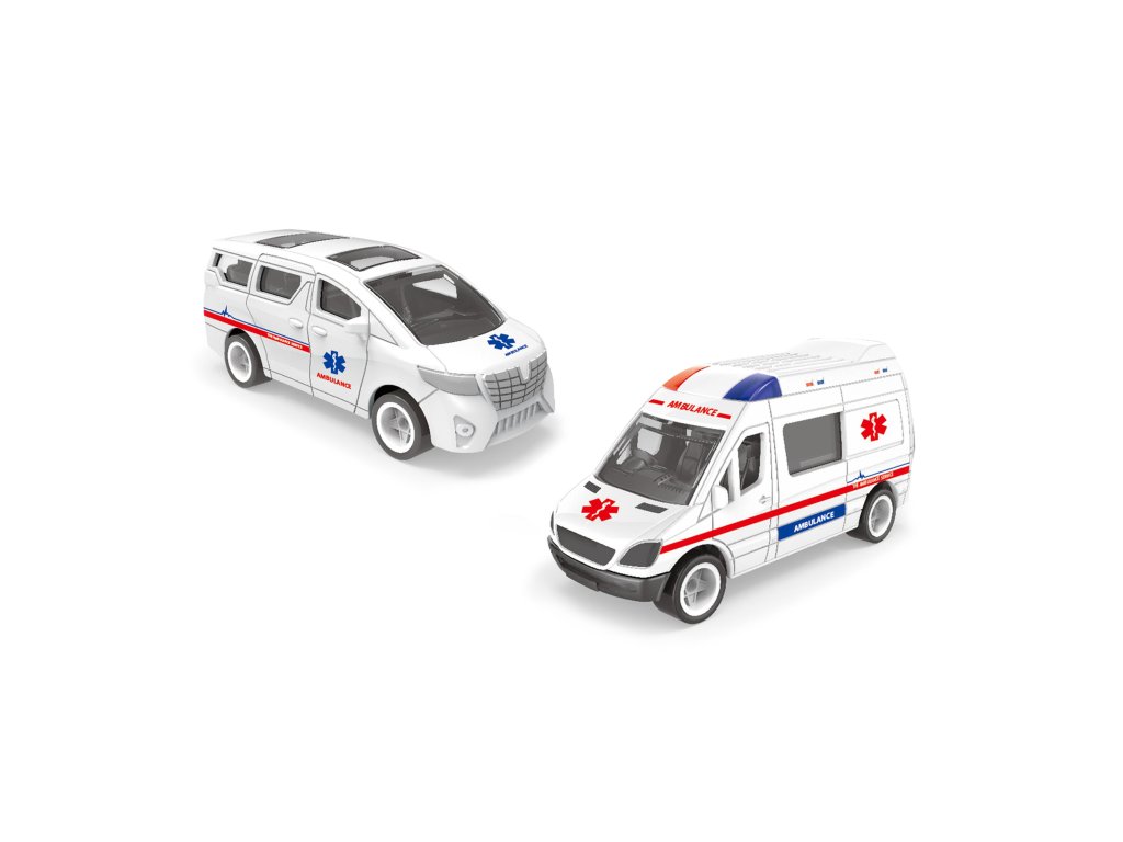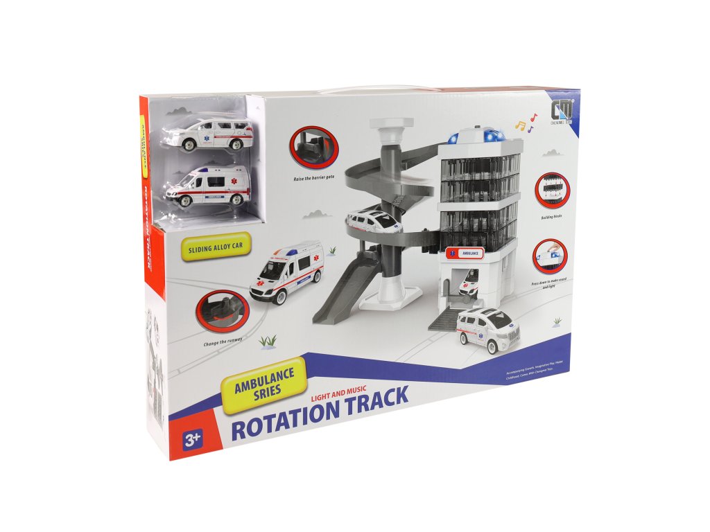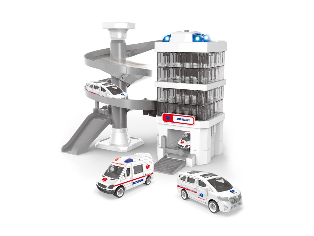 Nemocniční patrová budova se sjezdem. Střecha budovy disponuje majáčkem, který po zapnutí vydává reálné zvuky a bliká. K této funci je potřeba použítí 3 ks baterií typu LR44, které jsou uvnitř výrobku. Součástí této sady jsou 2 autíčka ambulance ve velikosti 7,5 cm.