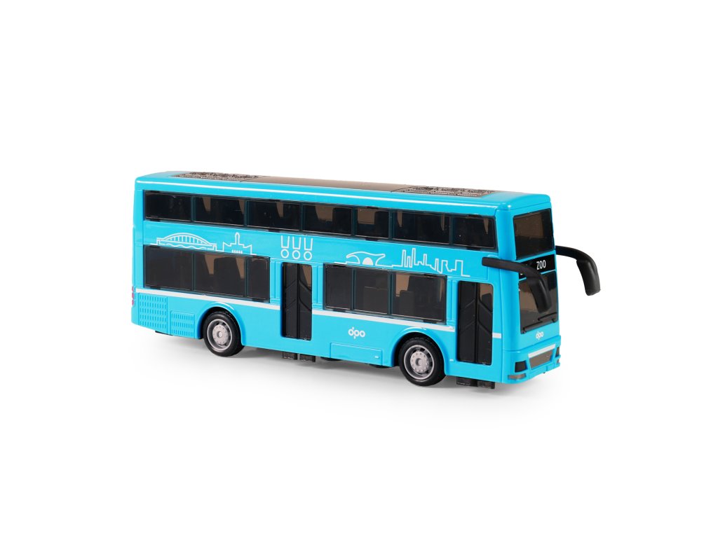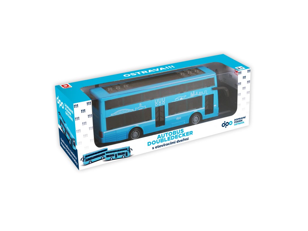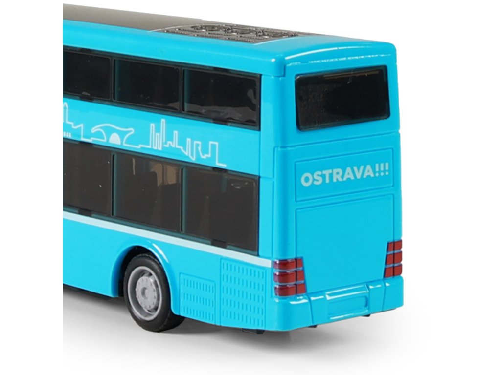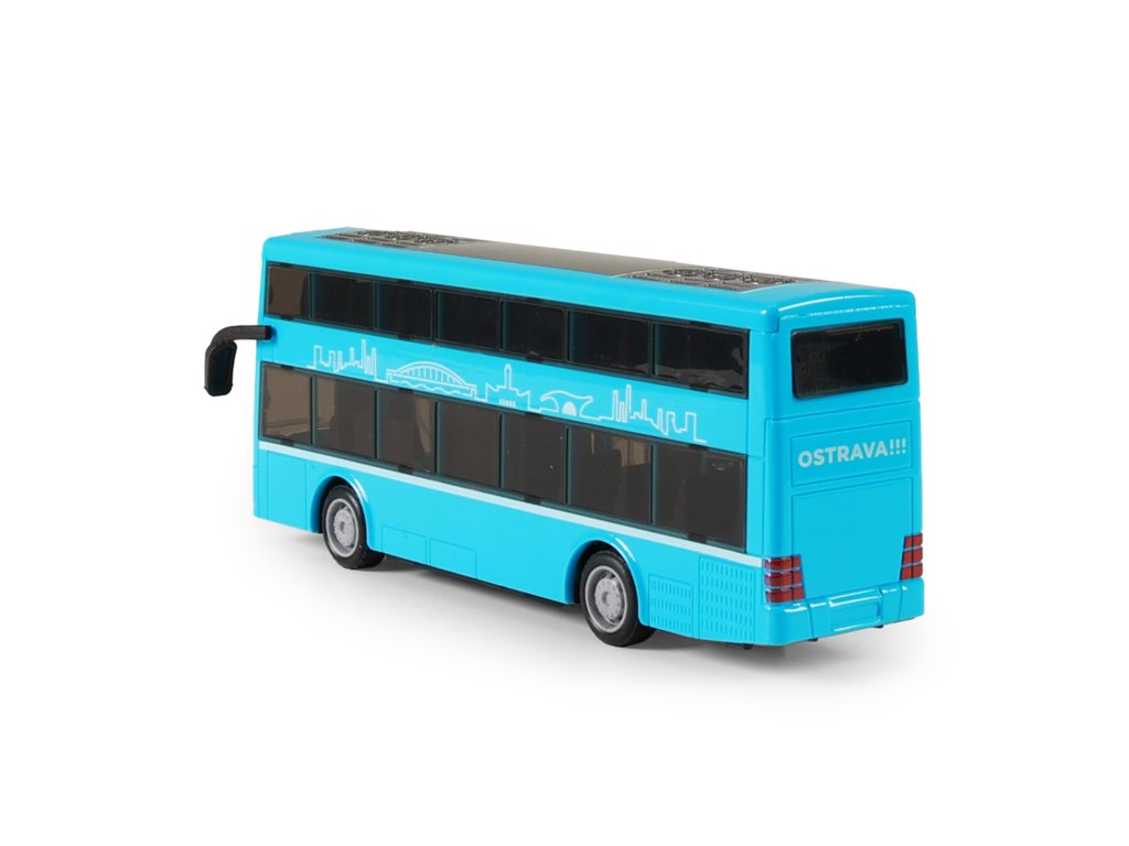Moderní dvoupodlažní autobus v modré barvě, který jezdí na setrvačník je perfektním dárkem pro všechny nadšence hromadné dopravy. Dveře lze manuálně otevřít a zavřít. Autobus je vyrobený z plastu, je dlouhý 19 cm a je velmi podobný autobusu, který jezdí ulicemi v Ostravě. Tato hračka byla vyrobena ve spolupráci s Dopravním podnikem města Ostravy a městem OSTRAVA!!!