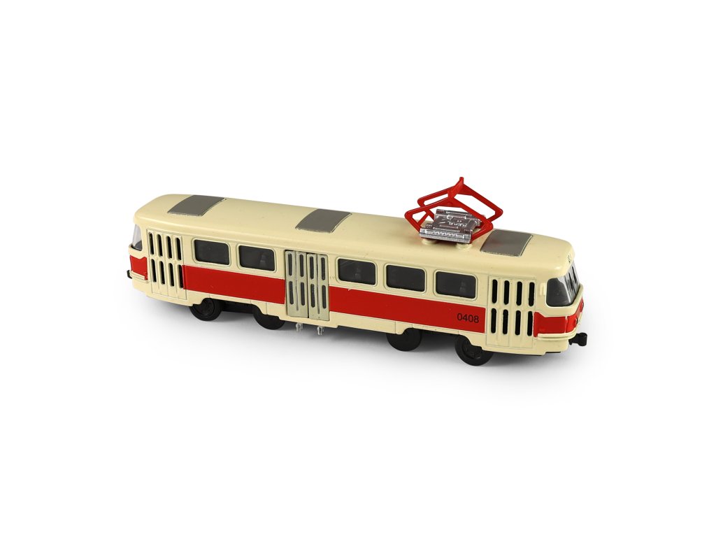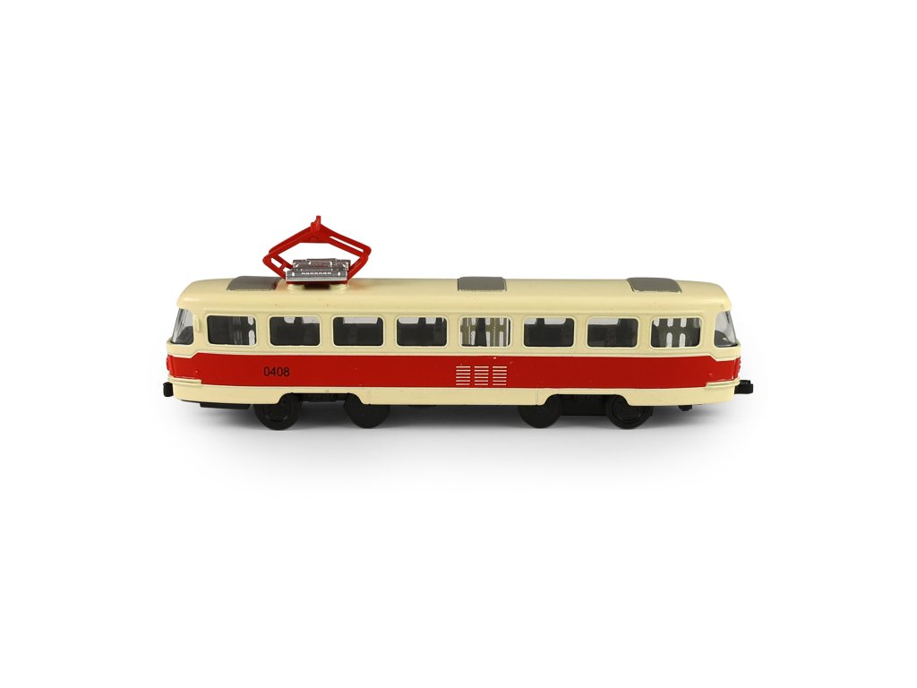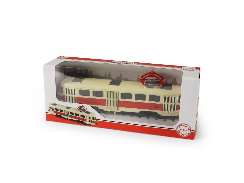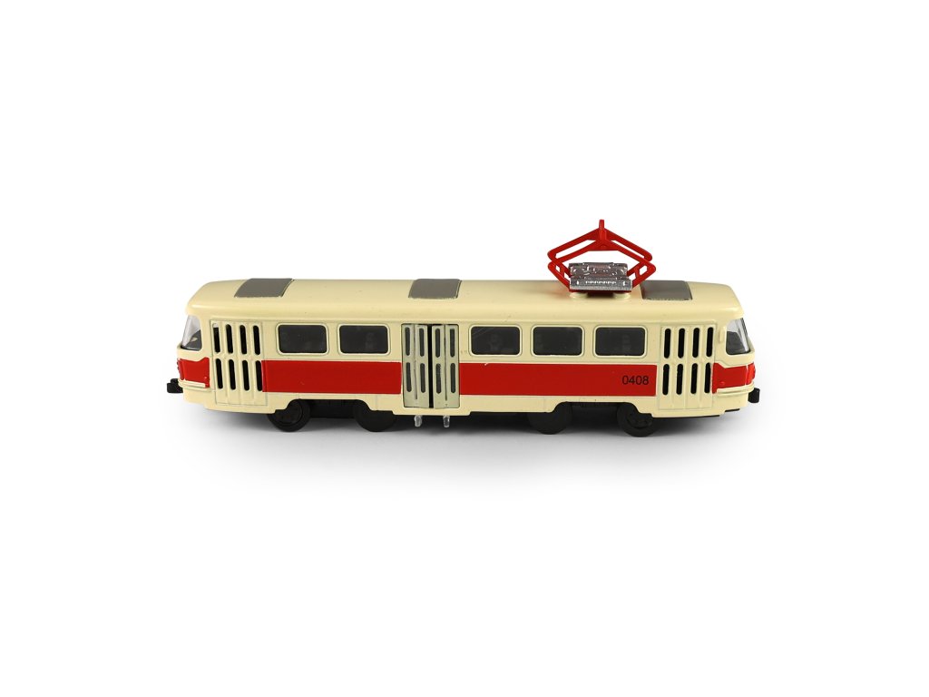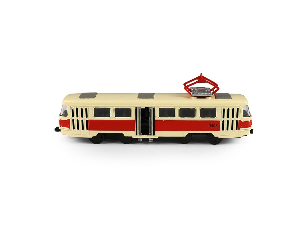 Kovová česká retro tramvaj červená 16 cm se světlem a zvukem
