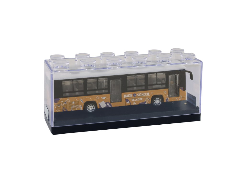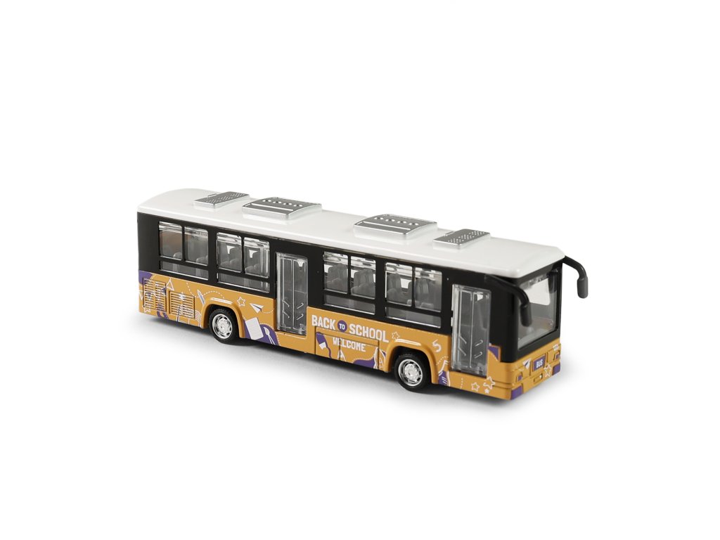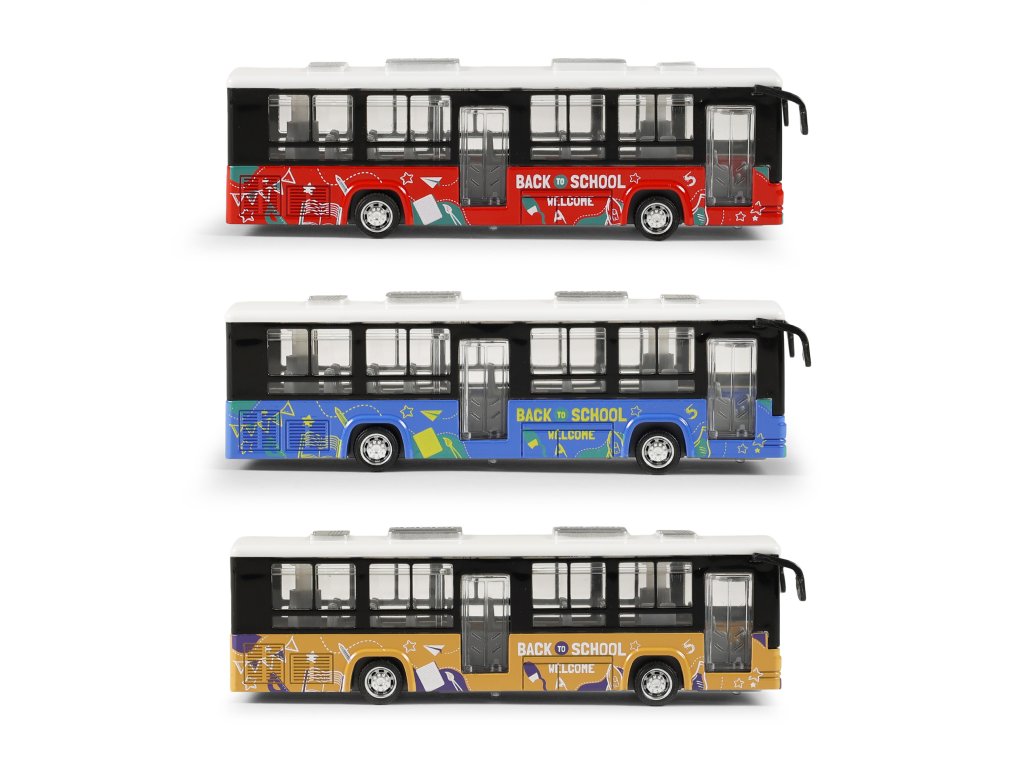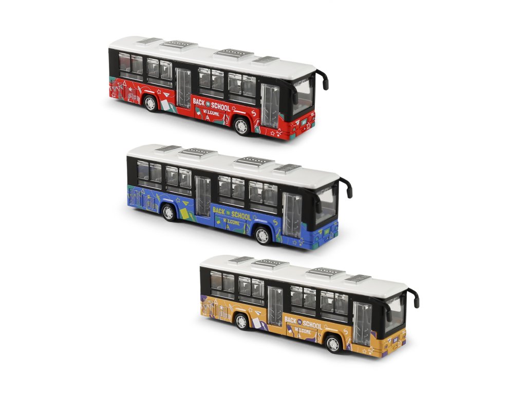 Tento mini kovový autobus jezdí na volný chod, má otevírací dveře, kovové tělo s plastovými prvky a jeho délka je 12 cm.