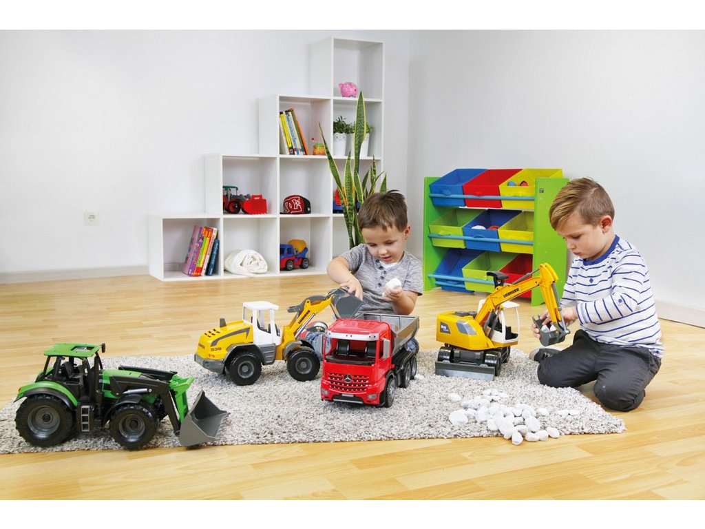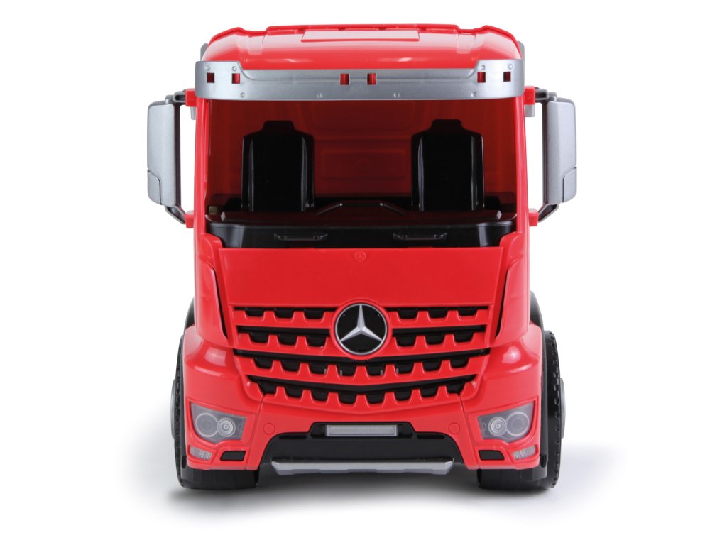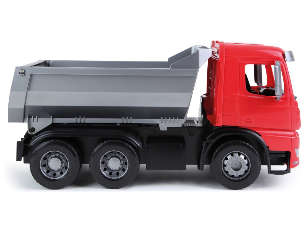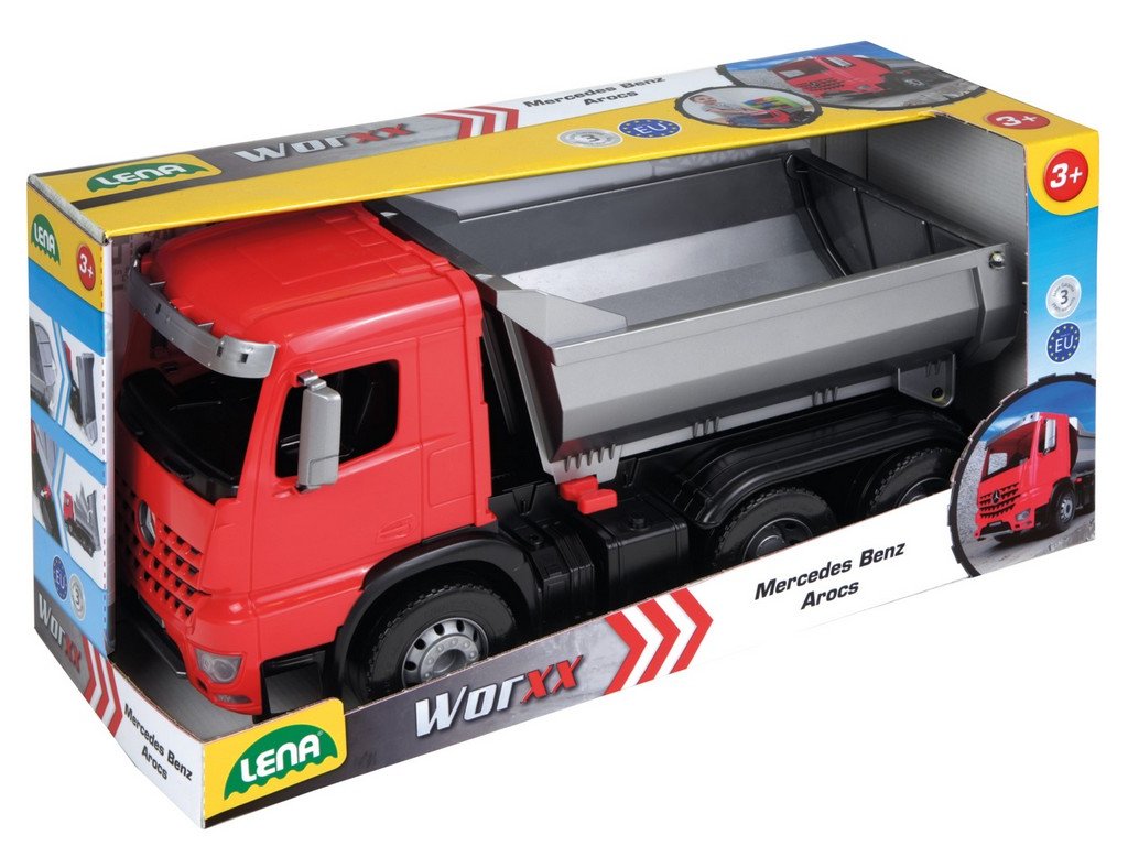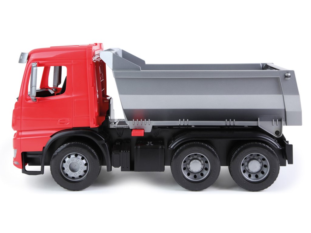 Mercedes Arocs sklápěč. 6mm tlusté kovové osky u kol. Součástí je pojistka proti nežádoucímu vyklopení korby.