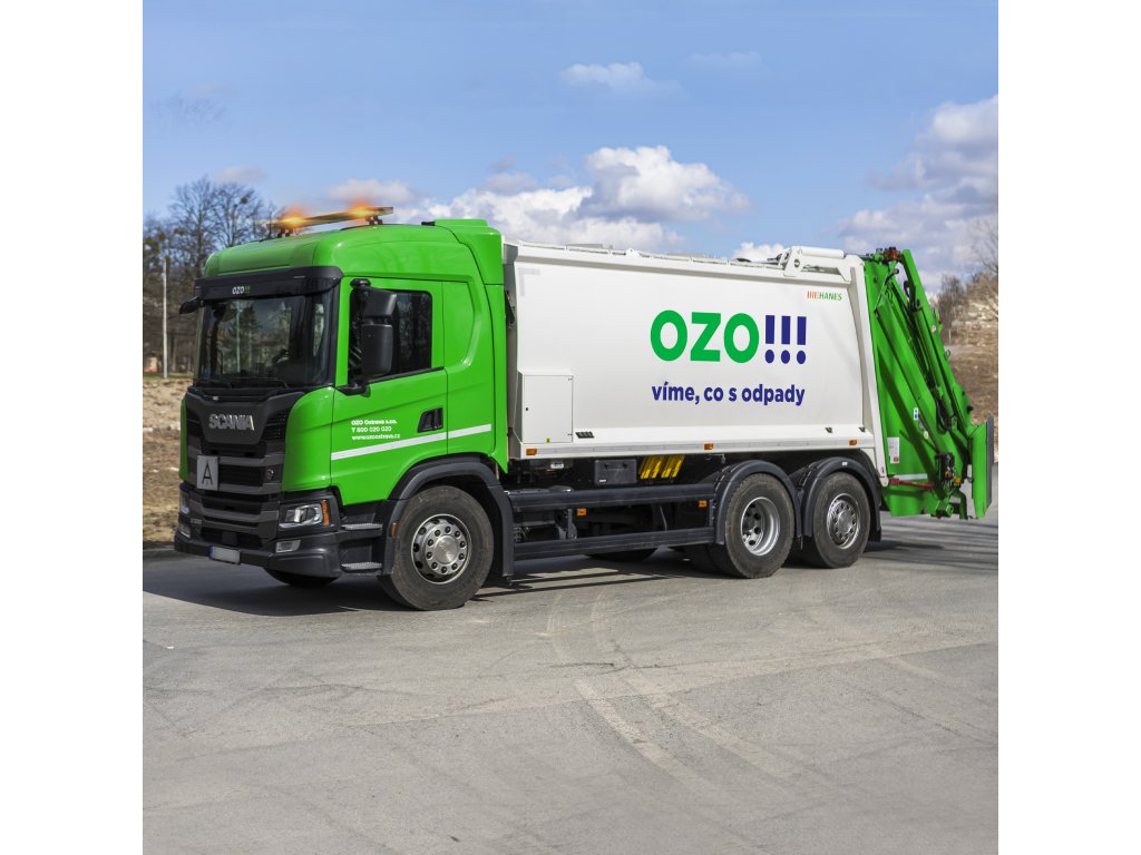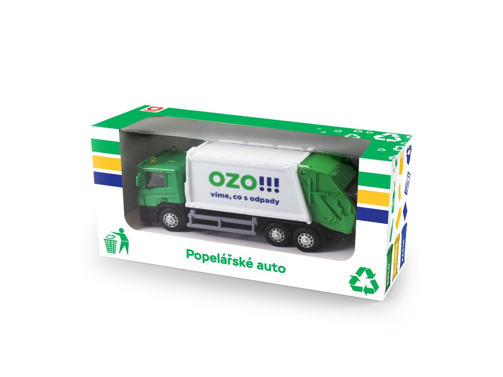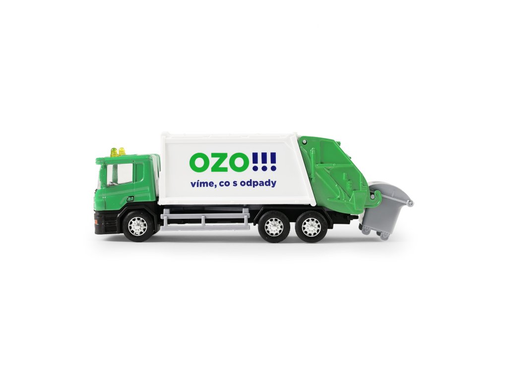 Kovové popelářské auto s plastovou korbou a logem OZO!!!. Korba má v zadní části odklápěcí dveře, součástí je otevírací popelnice. Auto jezdí na zpětný chod a jeho délka je 15 cm.