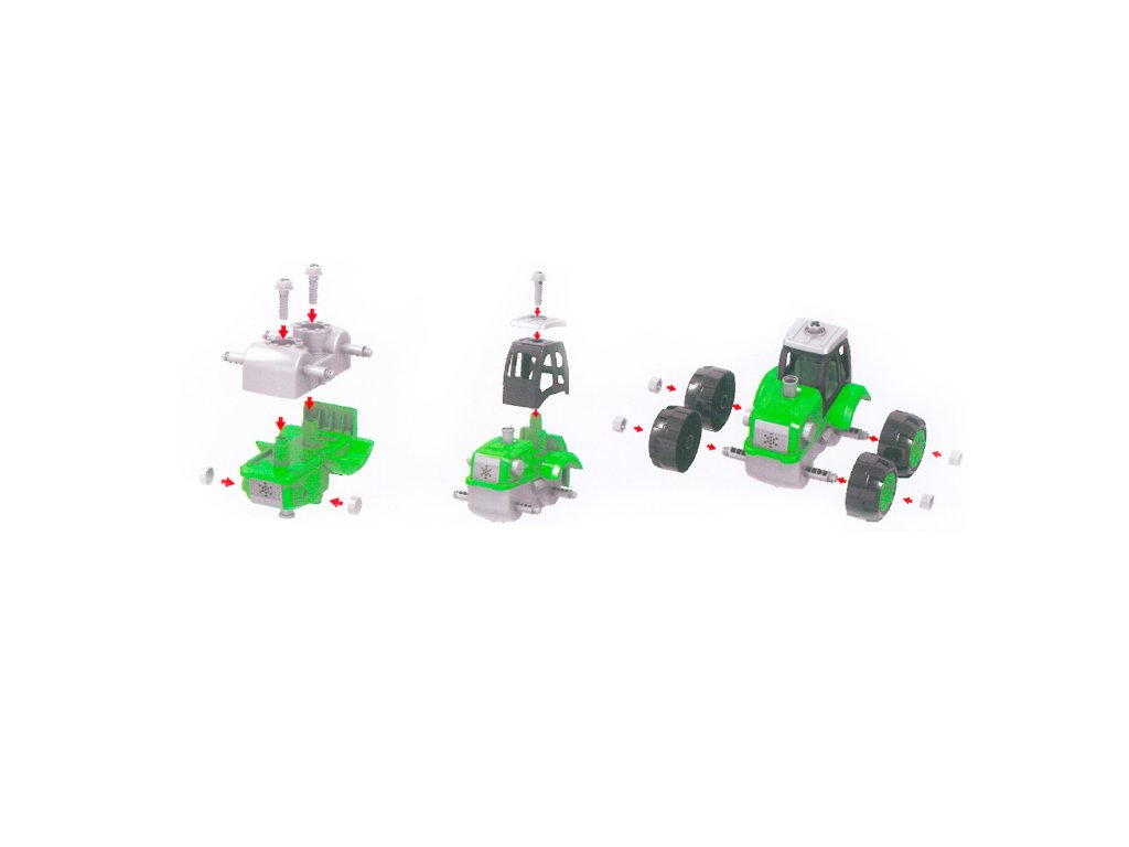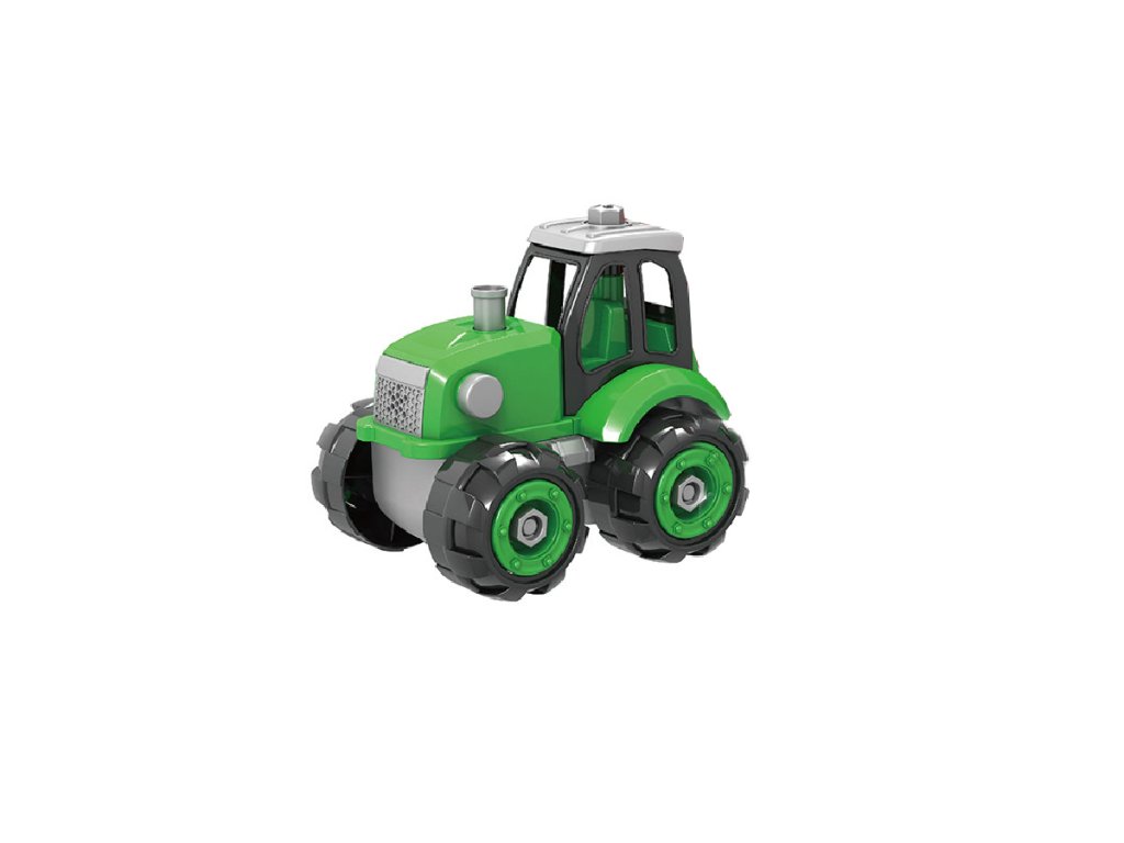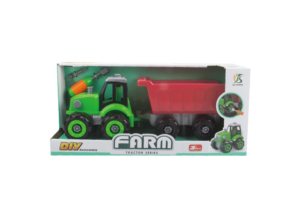 Zelený šroubovací traktor s červenou vlečkou. Pomocí šroubováku, který najdeš v balení, můžeš traktor snadno rozložit a sestavit si ho znovu. Rozvíjí kreativitu. Velikost traktoru s vlečkou je 32 cm.