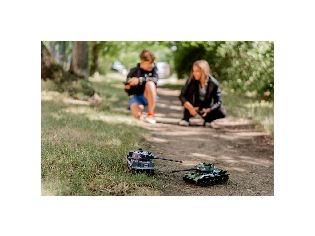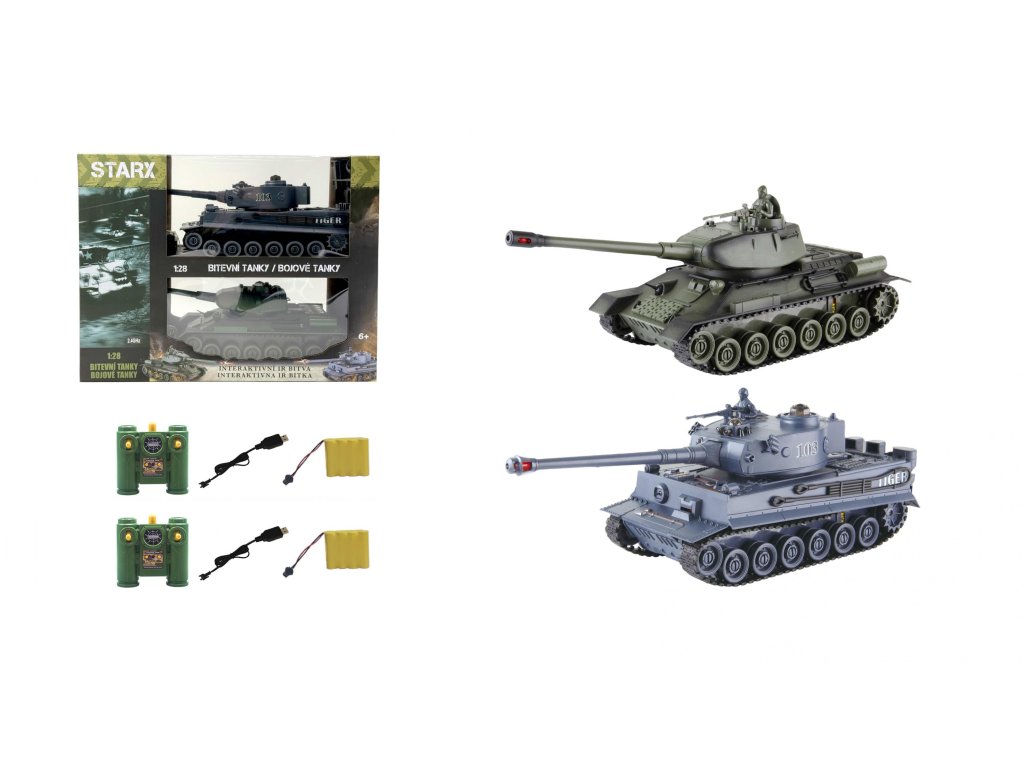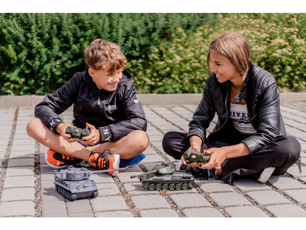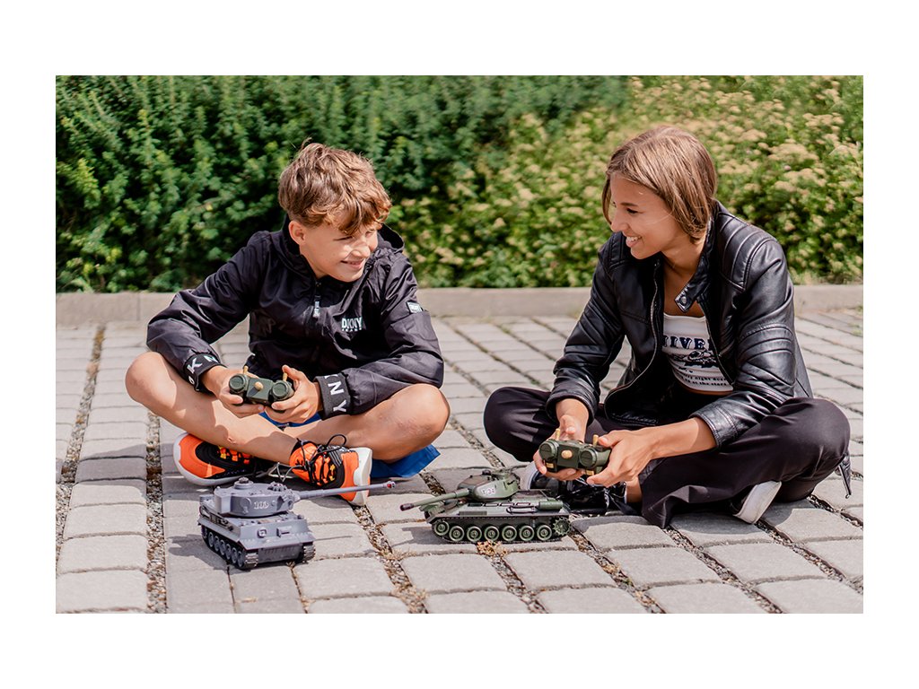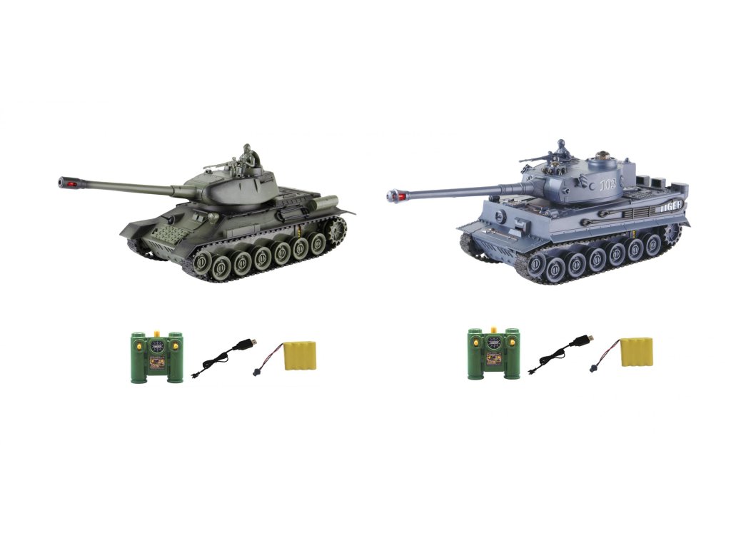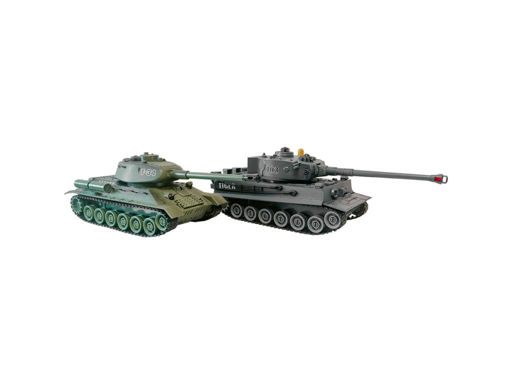 Tanky s dálkovým ovladačem, infrared, 2,4 GHz. Tank aktivujete tlačítkem ON na jeho spodní straně. Tlačítkem FIRE na dálkovém ovladači spustíte zvukové a světelné efekty výstřelu. Tan jezdí všemi směry, pohyb se řídí pohybem páček na dálkovém ovladači.Pohyb tanku vpřed posun obou páček vpřed na ovladači, jízda vzad - posun obou páček dozadu. Otáčení tanku posun jedné páčky dopředu nebo dozadu. Otáčení děla tanku tlačítka ve vrchní části ovladače vlevo nebo vpravo. Provoz tanku na bateriový pack (součást balení, nabíjení přes nabíječku. Dálkový ovladač na 2x1,5V baterie AA - nejsou součást balení. V případě zakoupení 2.tanku si můžete zahrát tankovou bitvu. Každý hráč má 3 životy - světla na zadní části tanku. Po každém zásahu jedno světlo zhasne. Prohrává ten, komu se nejdříve rozblikají světla na zadní části tanku. V balení jsou 2 tanky.