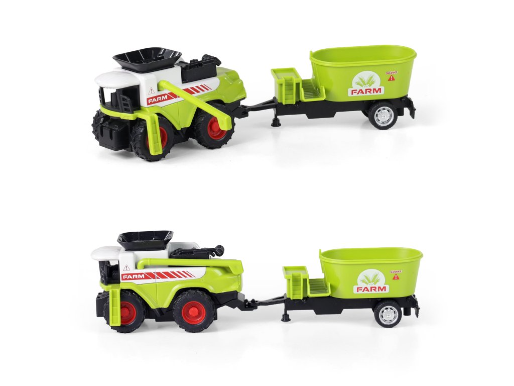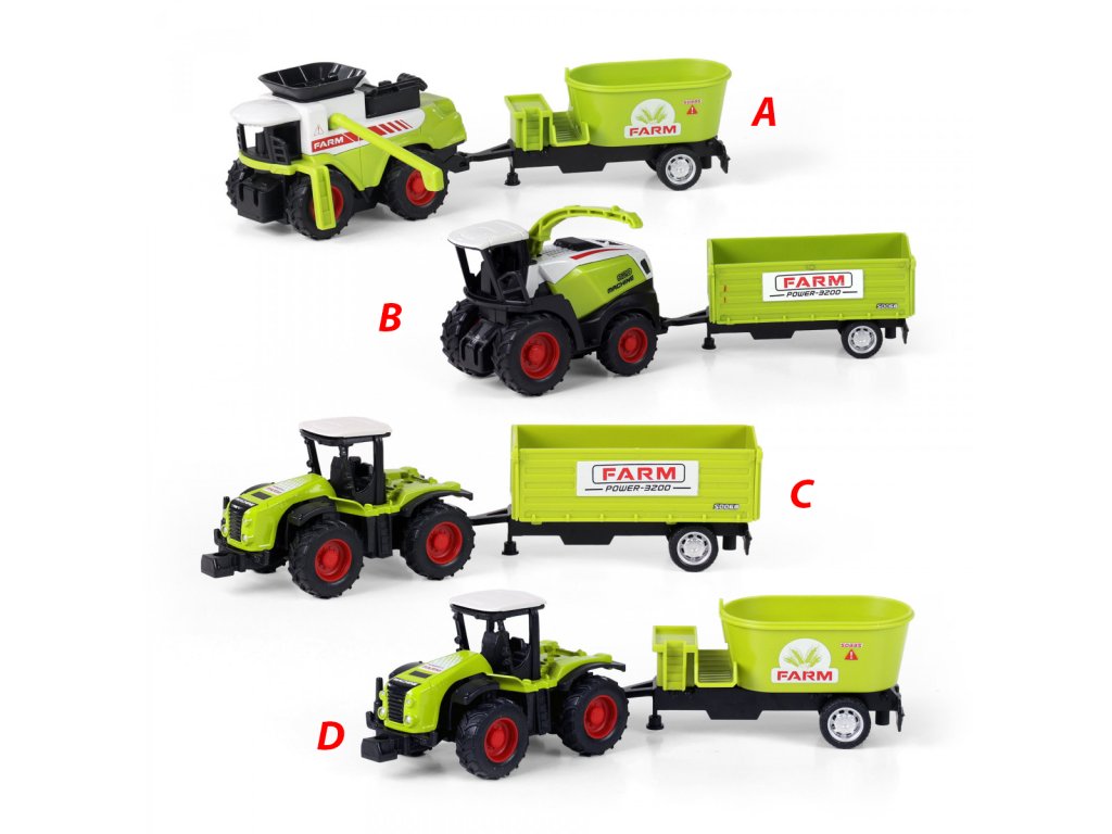 Moderní traktor s vlečkou, hračka z kolekce Moje malá farma. Nepostradatelný pomocník pro každého malého farmáře! Vlečku můžeš jednoduše odpojit a traktor využít k dalším pracím. Traktor jezdí na zpětný setrvačník a jeho délka včetně vlečky je 18 cm. K výběru 4 druhy.