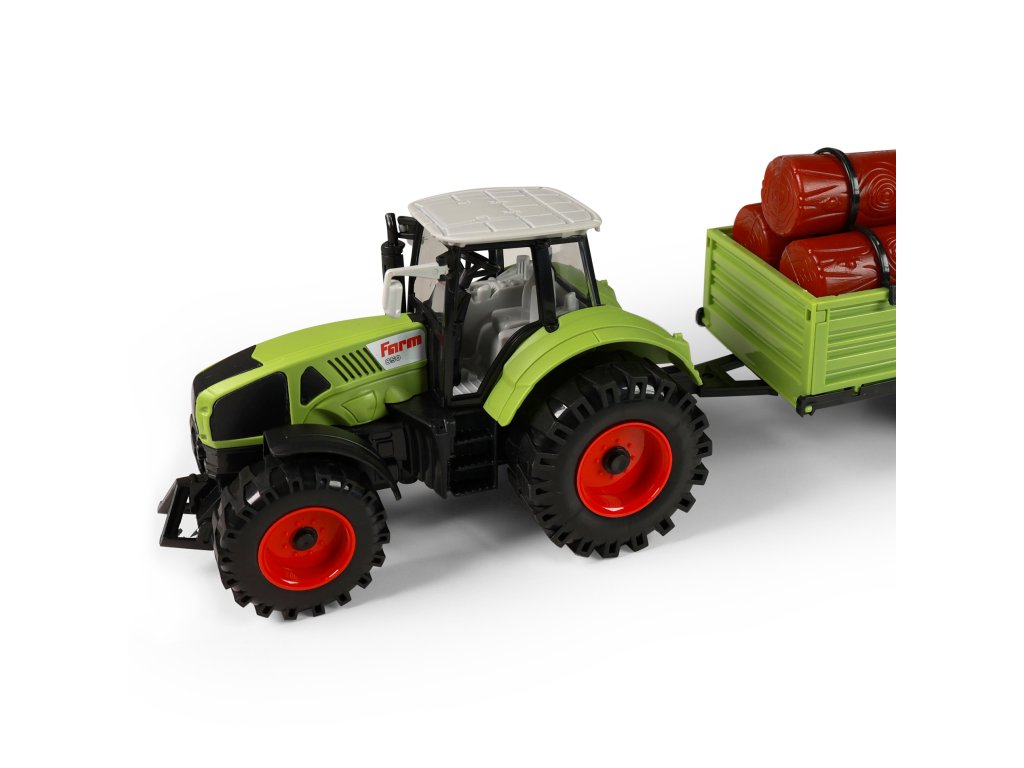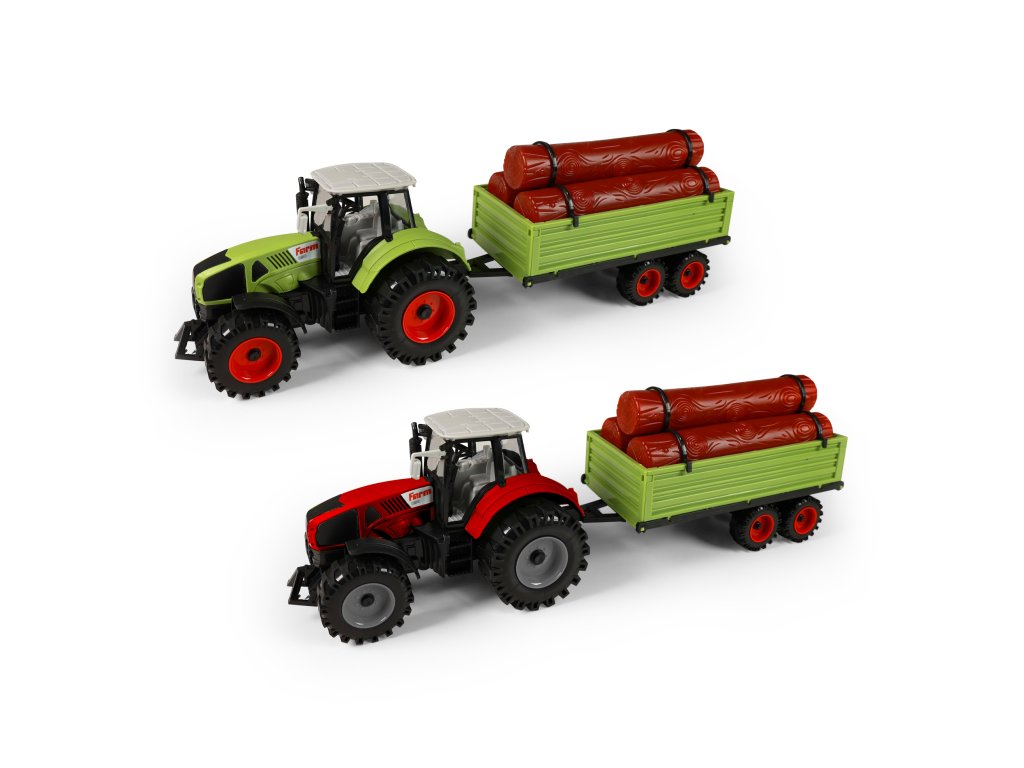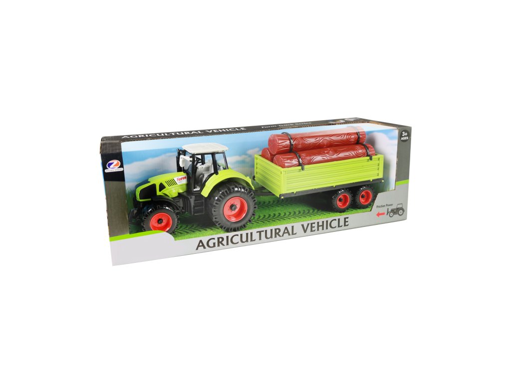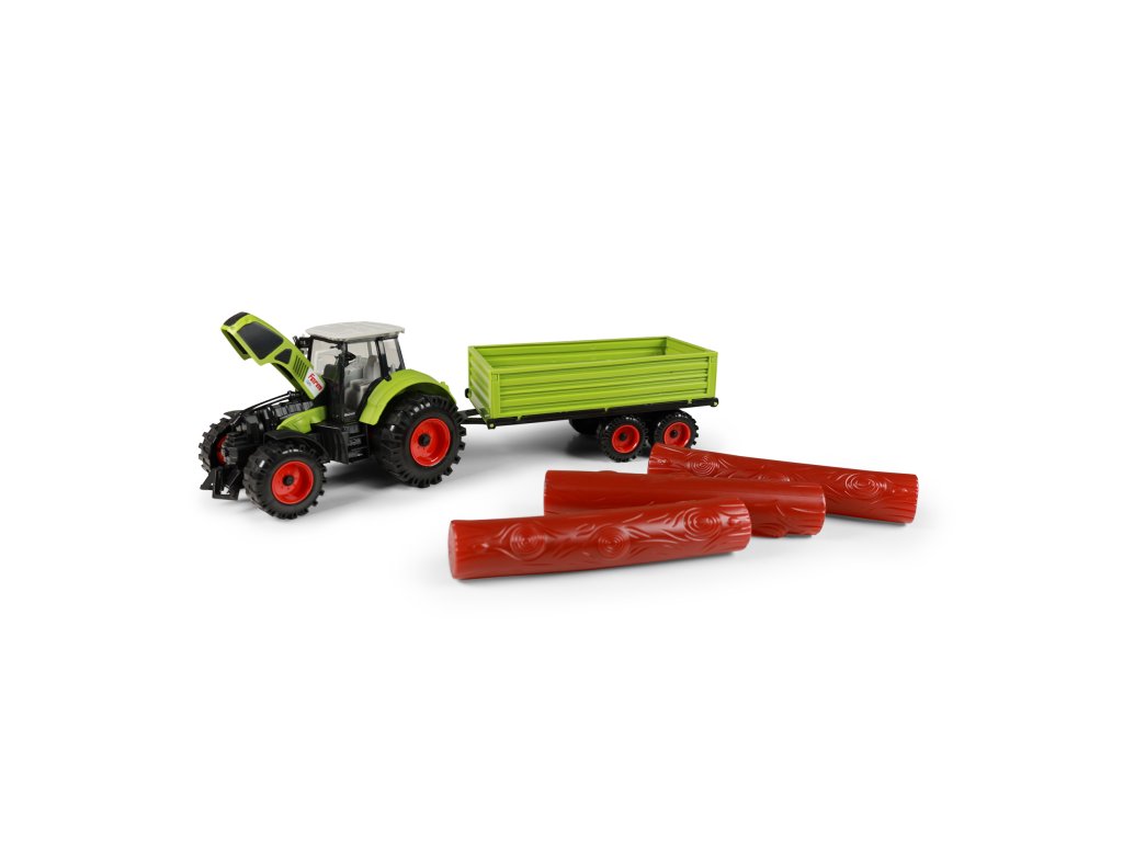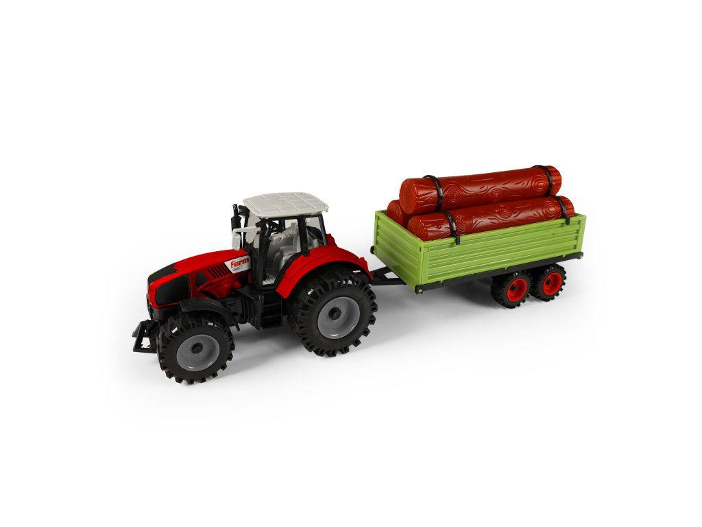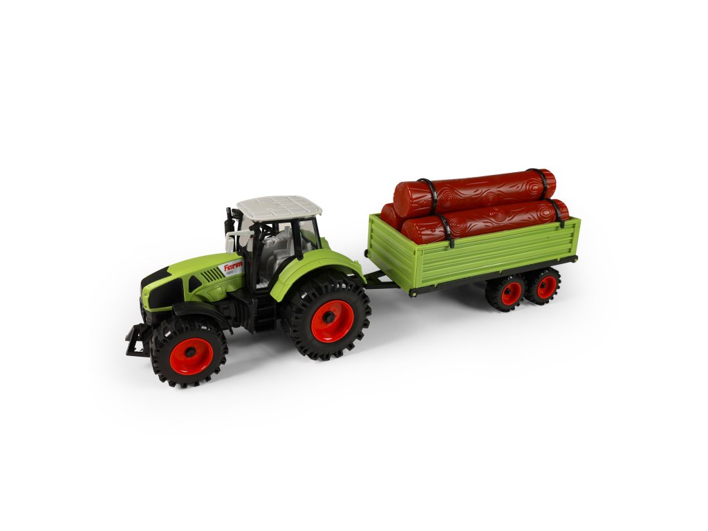 Moderní plastový farmářský traktor s vlečkou na dřevo. Vlečka se dá jednoduše odpojit a klády sundat. Traktor jezdí na setrvačník a jeho délka činí 19 cm. Vlečka jezdí na volný chod a je v délce 22 cm. Celková délka této soupravy je cca 45 cm.