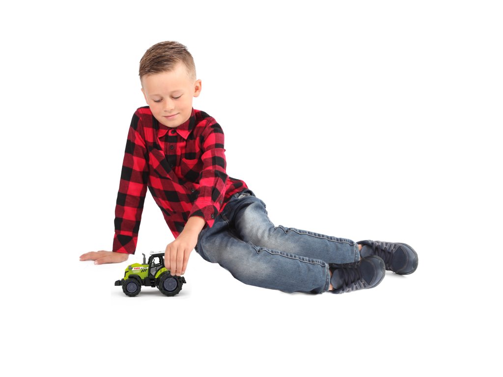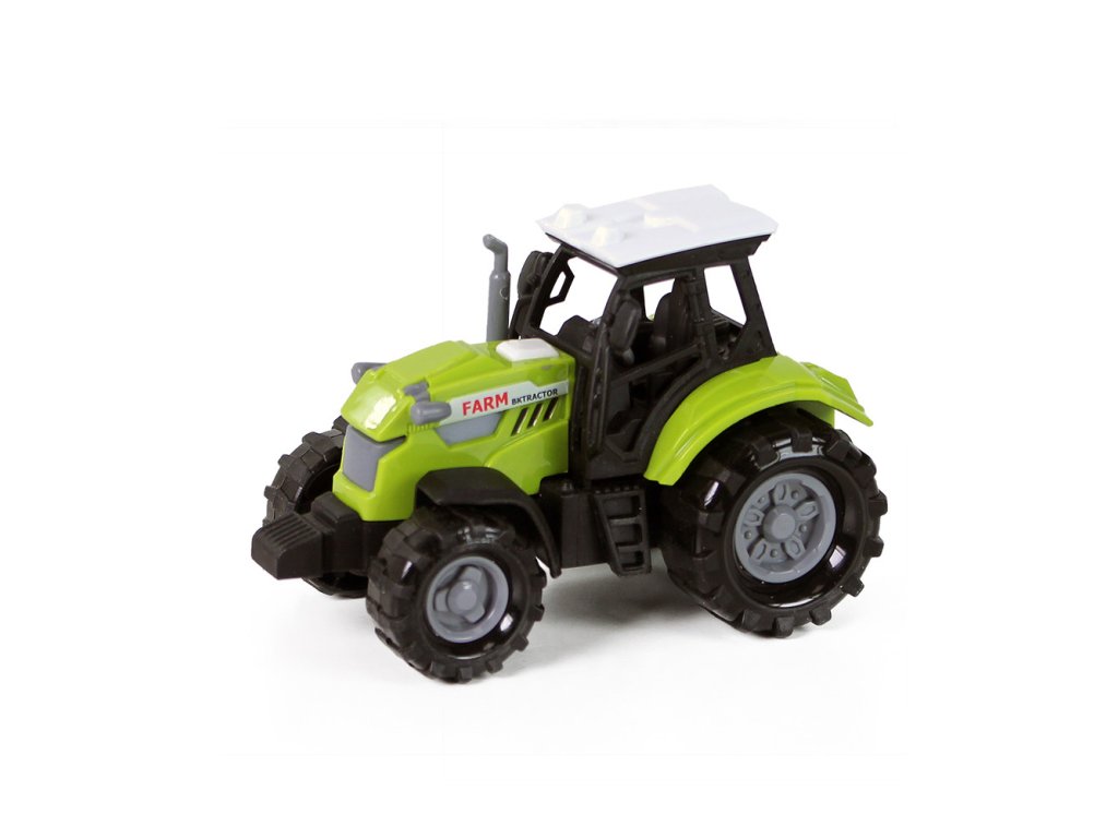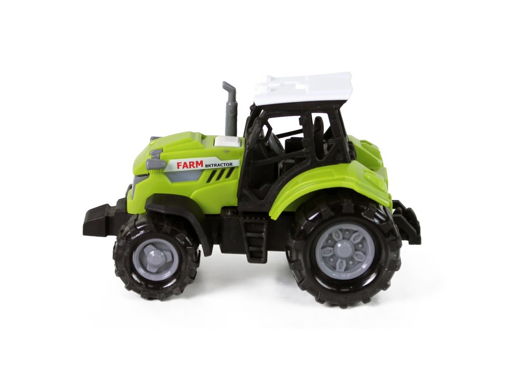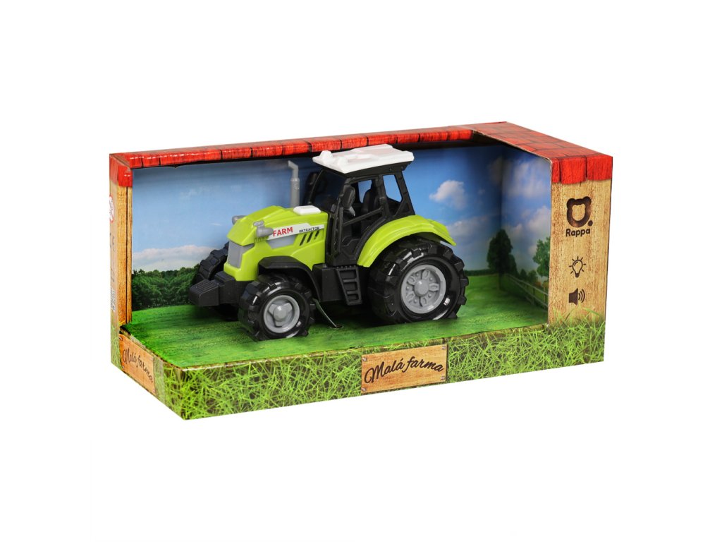 Moderní plastový farmářský traktor, hračka z kolekce Moje malá farma. Traktor jezdí na volný chod a jeho délka je 10 cm. Zmáčknutím tlačítka na traktoru vydává reálné zvuky spolu se světelným efektem. Traktor vyžaduje 3 ks baterií typu AG13/LR44, které jsou součástí balení.