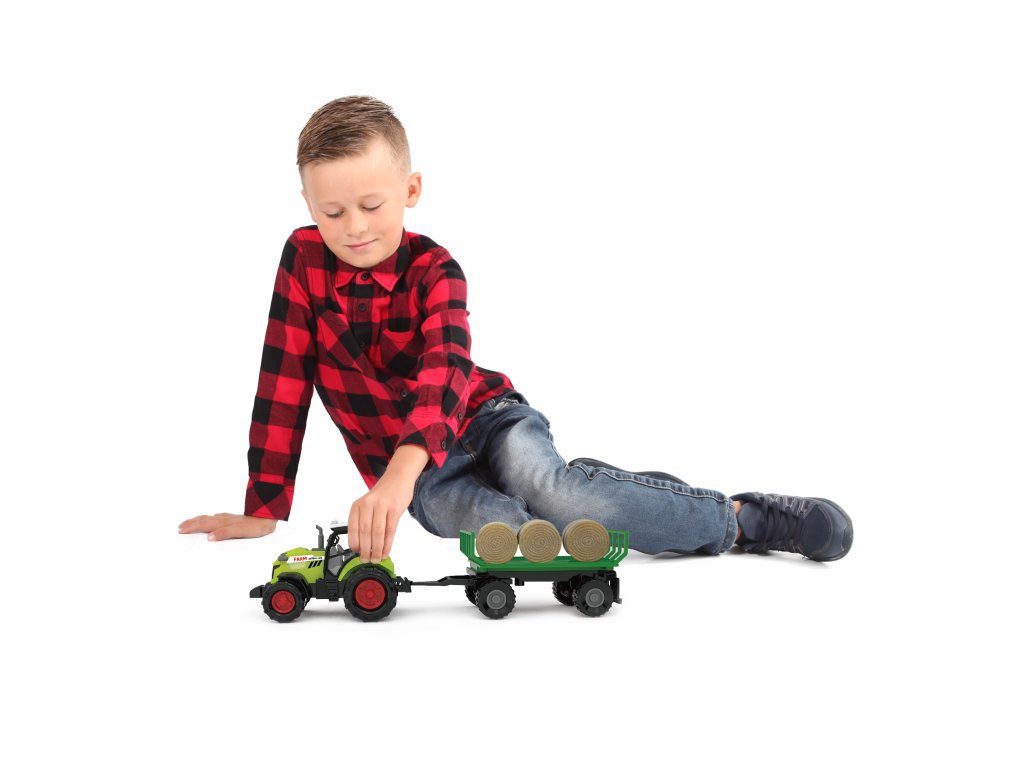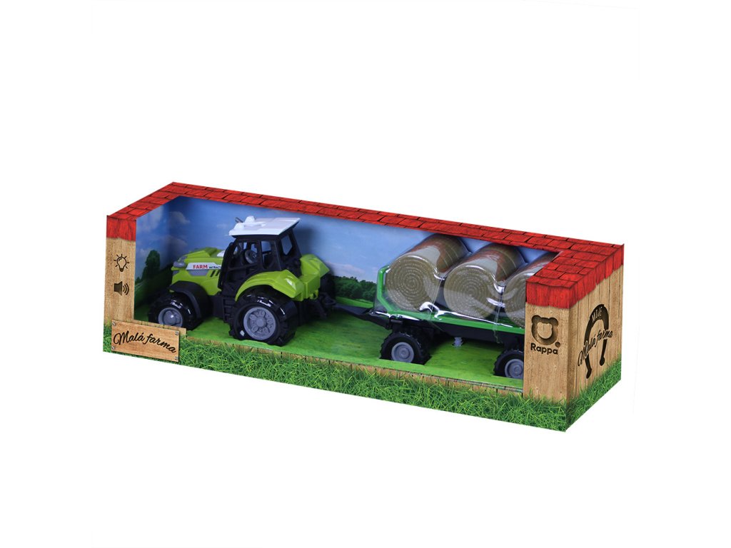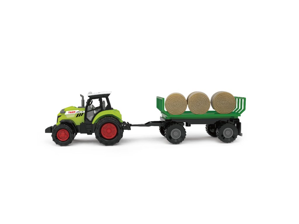 Moderní plastový farmářský traktor s vlečkou a balíky slámy, hračka z kolekce Moje malá farma. Vlečka se dá jednoduše odpojit a balíky sundat. Traktor jezdí na volný chod a jeho délka je 10 cm. Přívěs je v délce 12 cm, celková délka včetně přívěsu je 25 cm. Zmáčknutím tlačítka na traktoru vydává reálné zvuky spolu se světelným efektem. Traktor vyžaduje 3 ks baterií typu AG13/LR44, které jsou součástí balení.