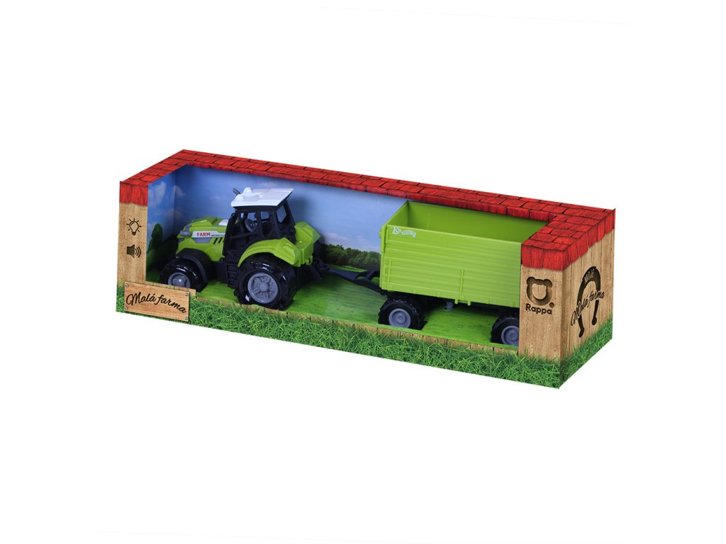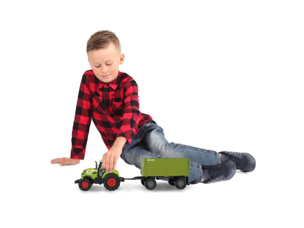 Moderní plastový farmářský traktor s vlečkou, hračka z kolekce Moje malá farma. Vlečka se dá jednoduše odpojit a otevřít. Traktor jezdí na volný chod a jeho délka je 10 cm. Přívěs je v délce 11 cm, celková délka včetně přívěsu je 25 cm. Zmáčknutím tlačítka na traktoru vydává reálné zvuky spolu se světelným efektem. Traktor vyžaduje 3 ks baterií typu AG13/LR44, které jsou součástí balení.