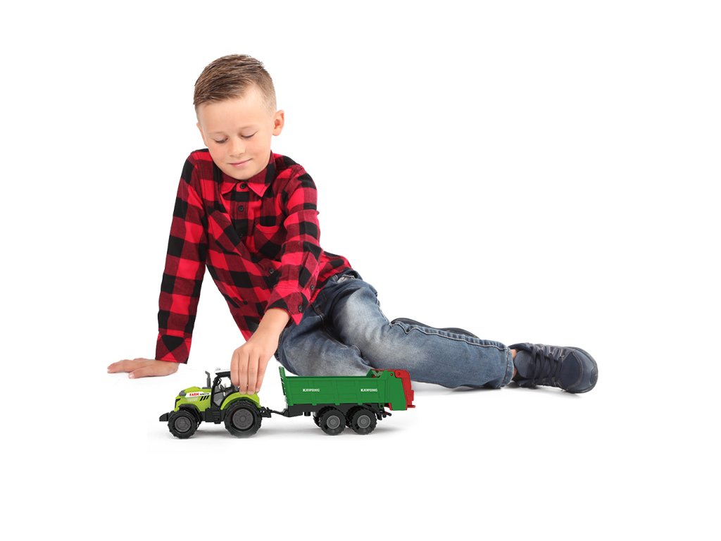 Moderní plastový farmářský traktor s vlečkou, hračka z kolekce Moje malá farma. Vlečka se dá jednoduše odpojit, sklopit a otevřít. Traktor jezdí na volný chod a jeho délka je 10 cm. Přívěs je v délce 12 cm, celková délka včetně přívěsu je 25 cm. Zmáčknutím tlačítka na traktoru vydává reálné zvuky spolu se světelným efektem. Traktor vyžaduje 3 ks baterií typu AG13/LR44, které jsou součástí balení.