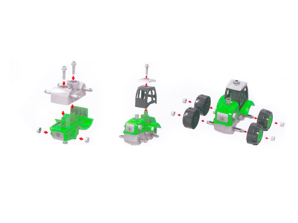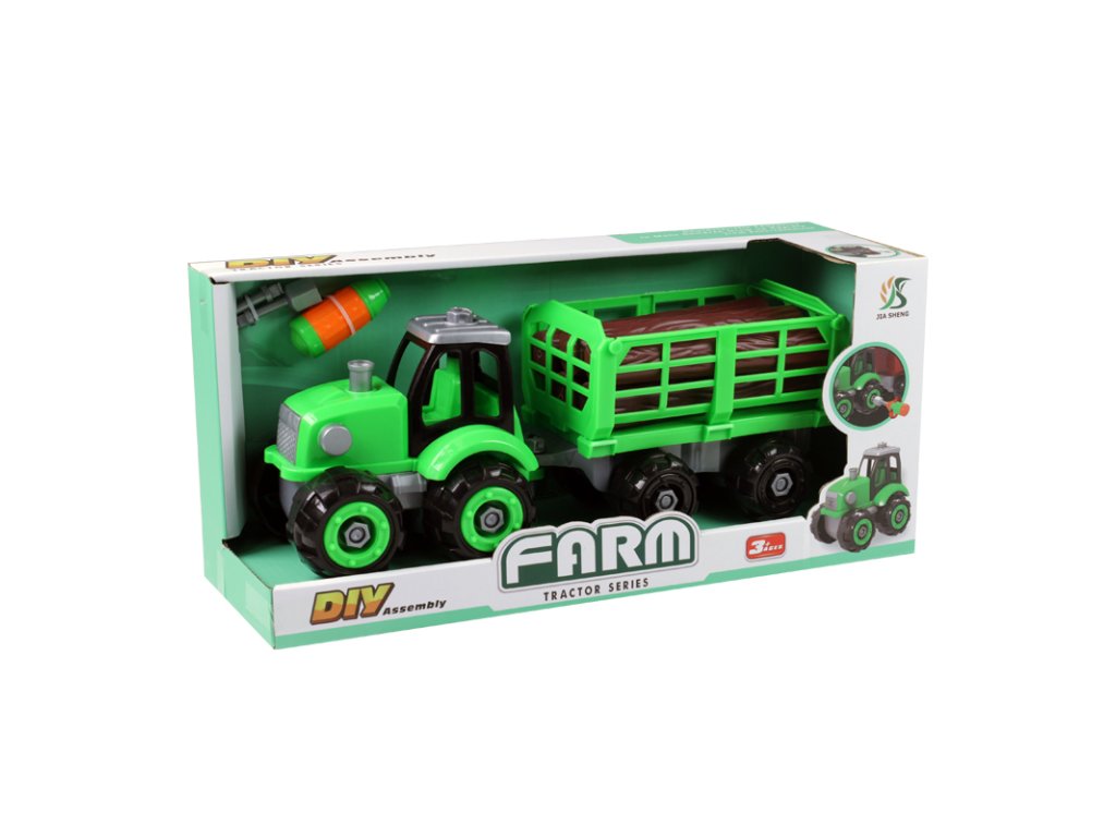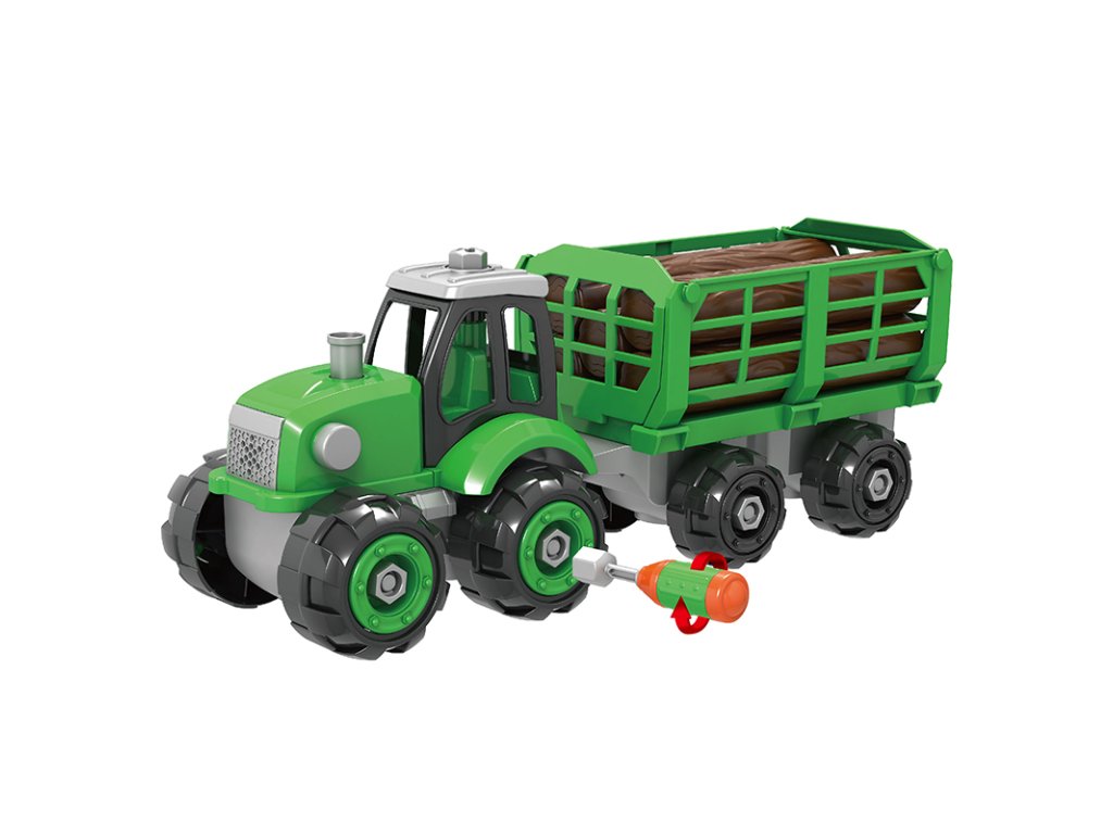 Zelený šroubovací traktor s vlečkou na dřevo. Pomocí šroubováku, který najdeš v balení, můžeš traktor snadno rozložit a sestavit si ho znovu. Velikost traktoru s vlečkou je 32 cm.