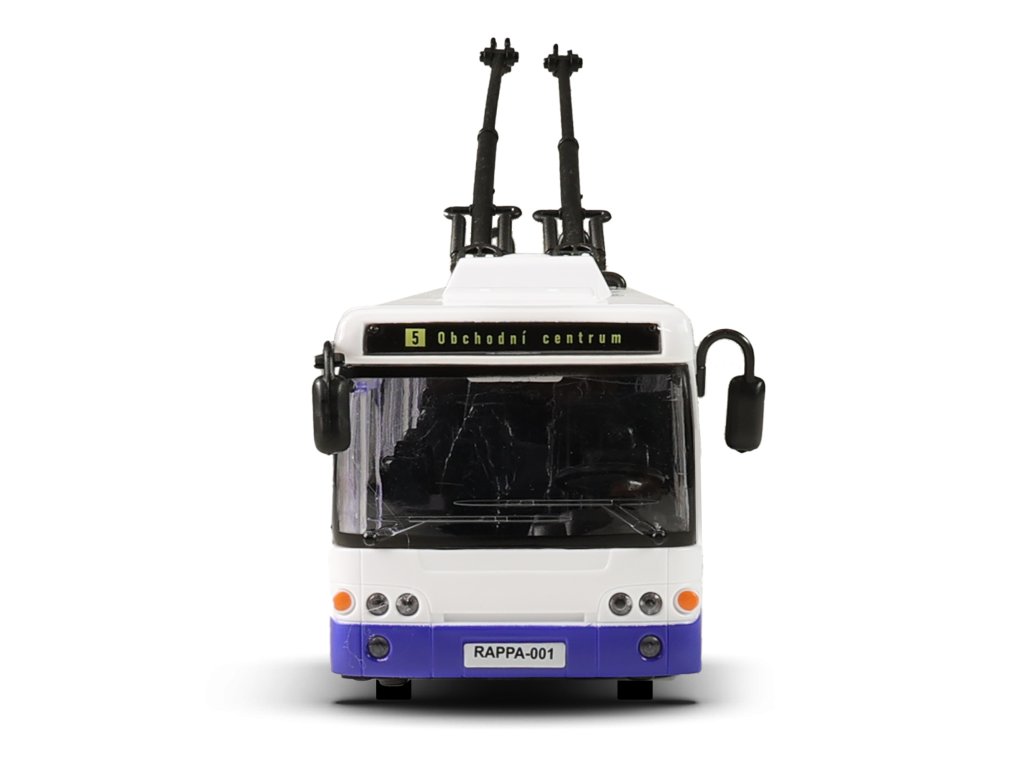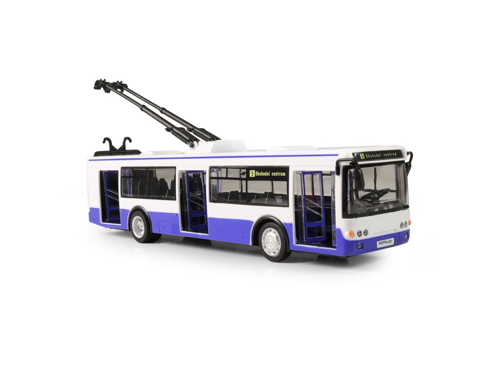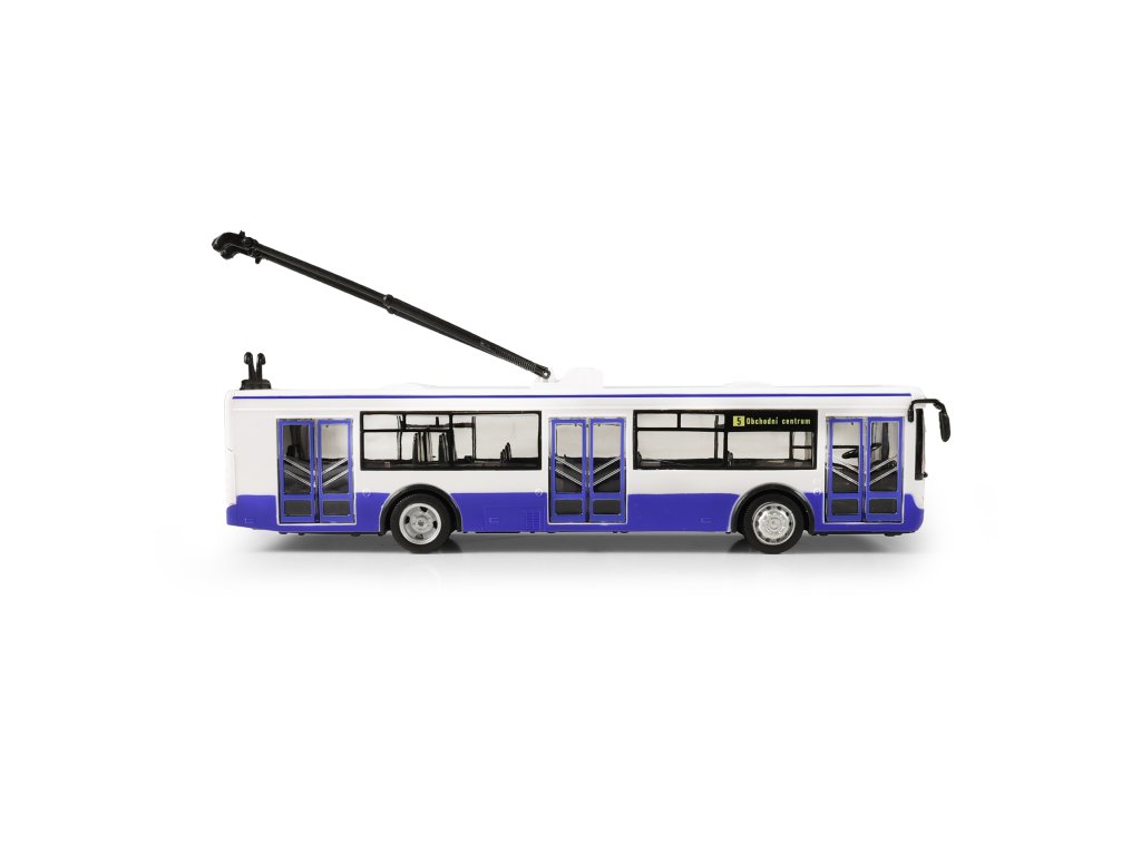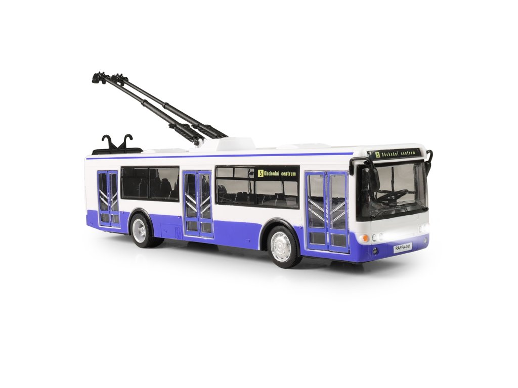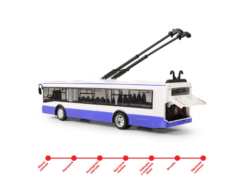 Rychle nastoupit, zavřít dveře a jedeme! Originální trolejbus, který oznamuje stanice v českém jazyce a jezdí na zpětný chod. Dveře lze manuálně otevřít a zavírají se pomocí tlačítka umístěného na střeše vozu. Při každém otevření se ozve hlášení, při zavření navíc blikají přední světla trolejbusu. Trolejbus je vyroben v délce 28 cm a měřítku 1:43. Vyžaduje použití 3 ks baterií typu LR44/AG13, které jsou součástí balení. Tahle unikátní hračka nesmí chybět fandům ekologické dopravy!