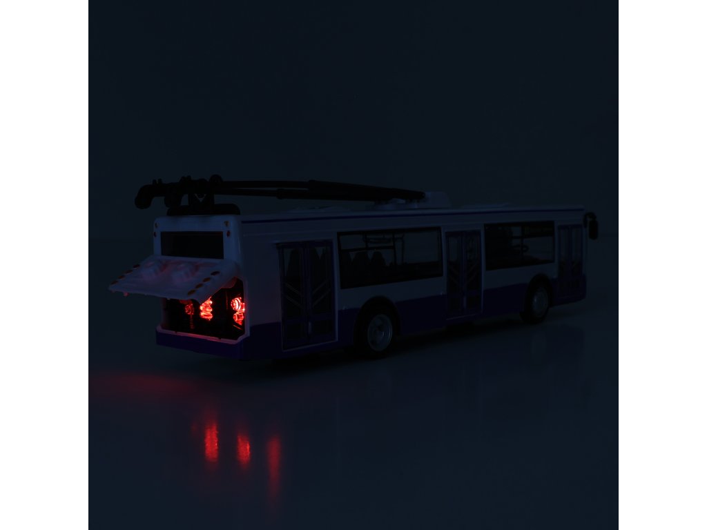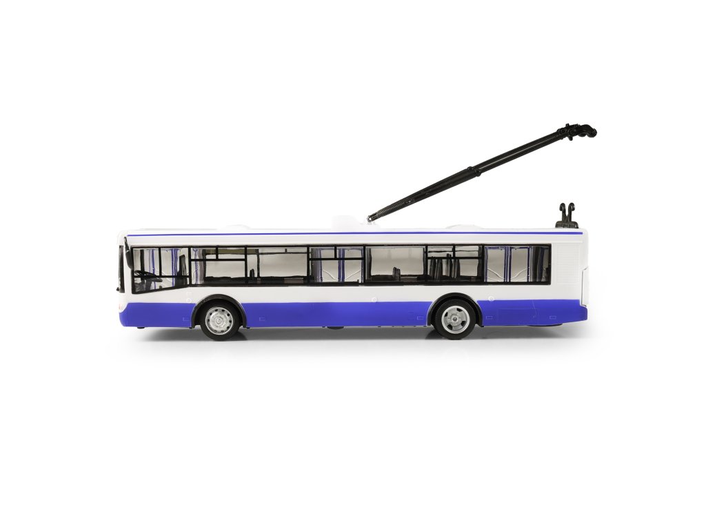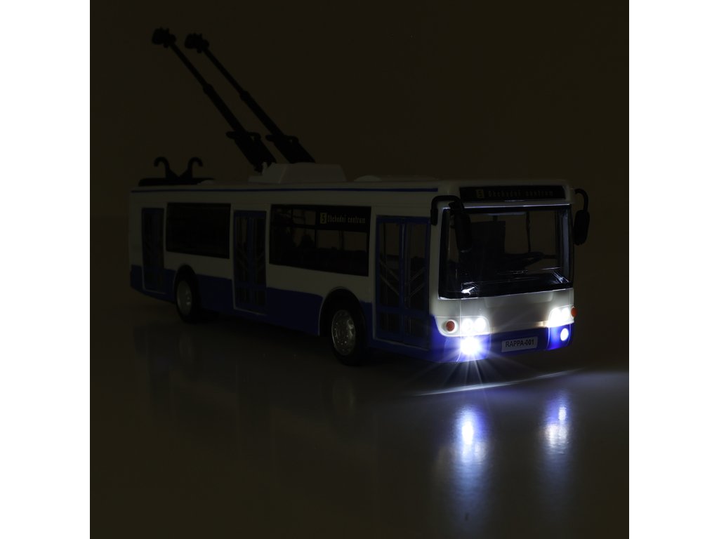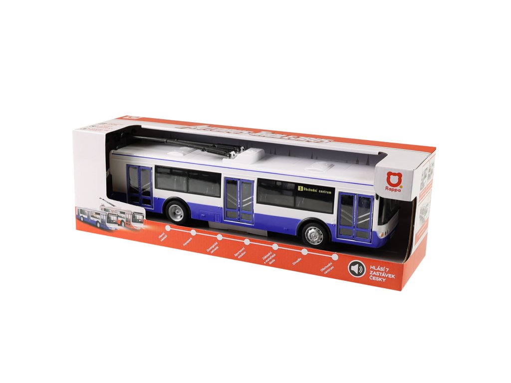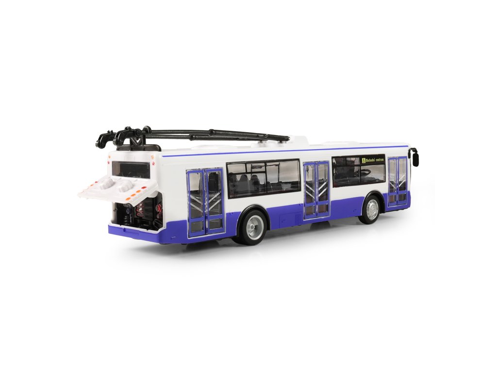 Rychle nastoupit, zavřít dveře a jedeme! Originální trolejbus, který oznamuje stanice v českém jazyce a jezdí na zpětný chod. Dveře lze manuálně otevřít a zavírají se pomocí tlačítka umístěného na střeše vozu. Při každém otevření se ozve hlášení, při zavření navíc blikají přední světla trolejbusu. Trolejbus je vyroben v délce 28 cm a měřítku 1:43. Vyžaduje použití 3 ks baterií typu LR44/AG13, které jsou součástí balení. Tahle unikátní hračka nesmí chybět fandům ekologické dopravy!