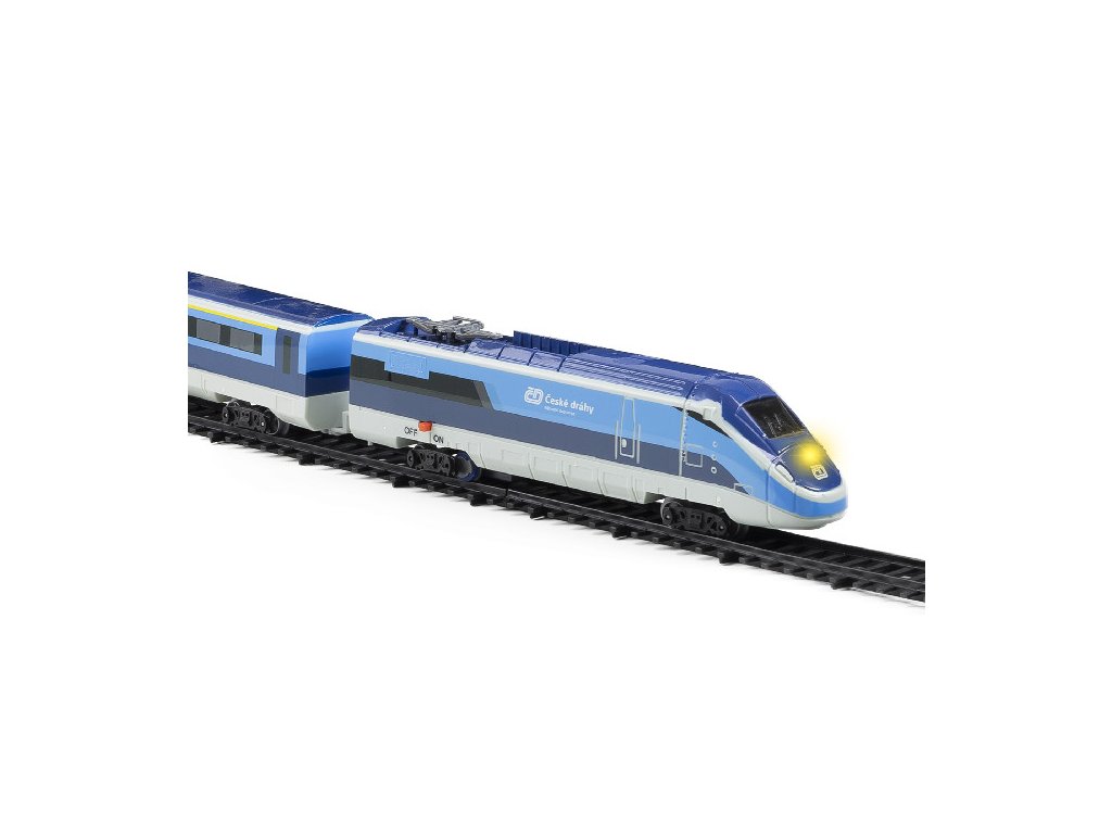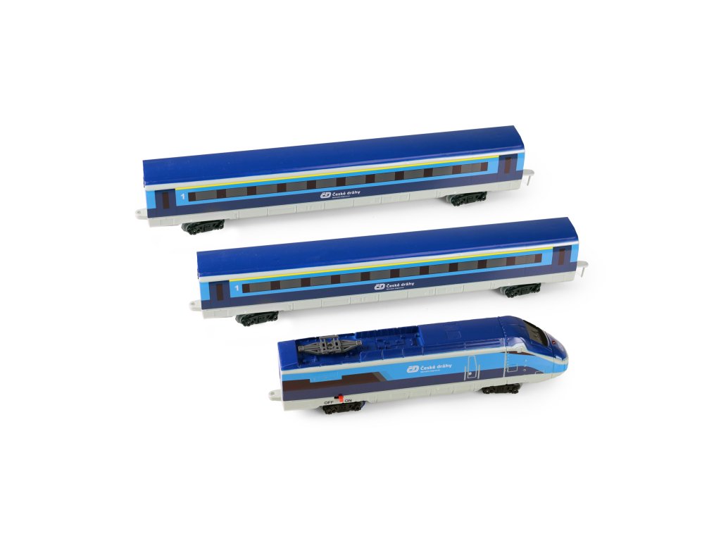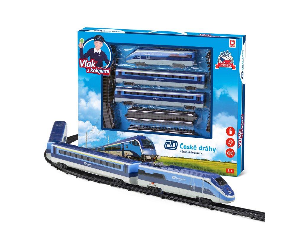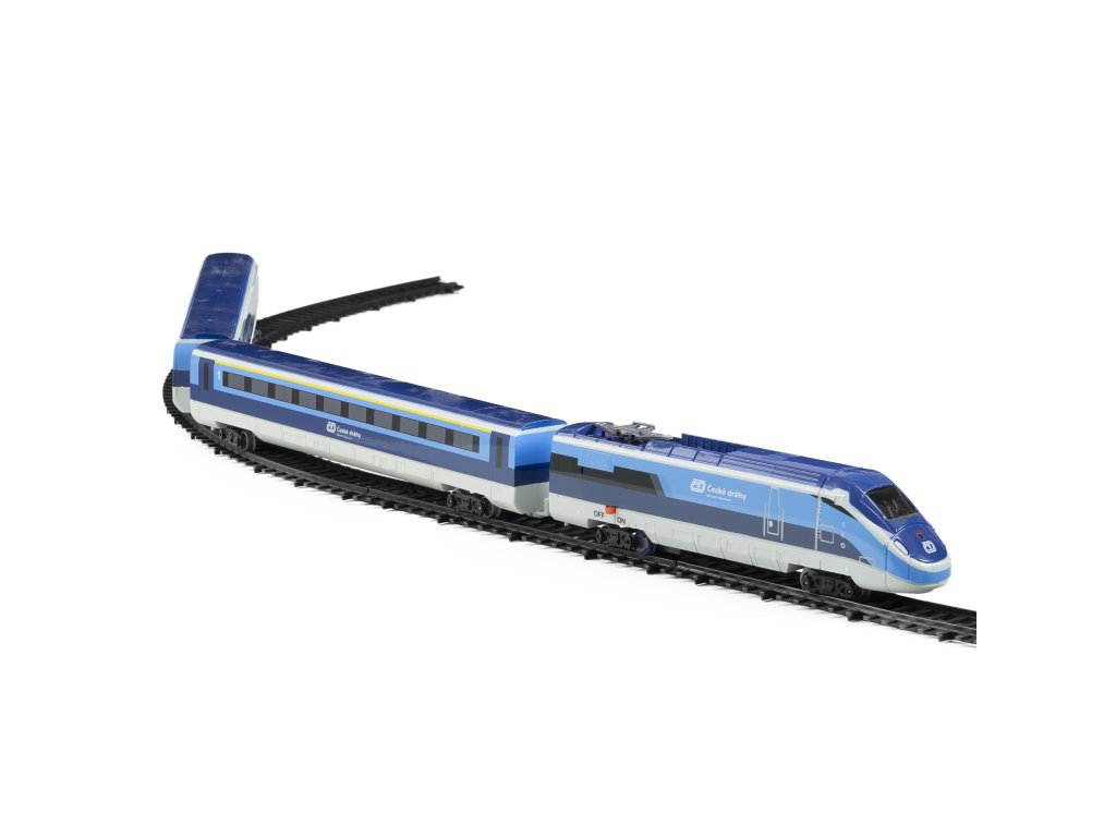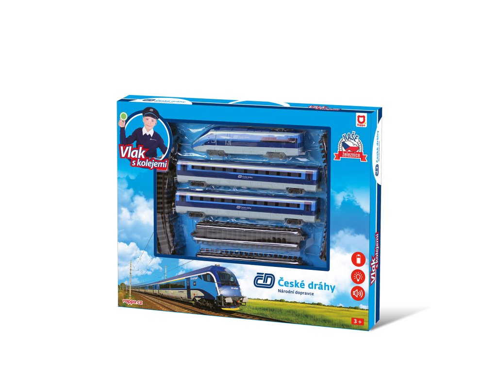 Sada z kolekce Naše železnice obsahuje lokomotivu, dva vagóny, 12 zahnutých a 8 rovných kolejí. Lokomotiva měří na délku 23,5 cm a vagón 30 cm. Lokomotiva jezdí, vydává zvuk a svítí díky 2 ks AA baterií (nejsou součástí balení). Celková dráha kolejí měří 4,8 m a jejich rozteč je 2,1 cm. Velikost koleje rovné je 23 cm a zahnuté 25 cm. Tuto novinku lze kombinovat s vlakem RegioJet. Touto originální vlakovou sadou Českých drah určitě potěšíte všechny milovníky a nadšence železnic.