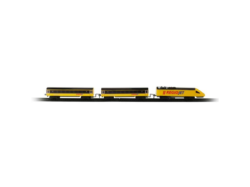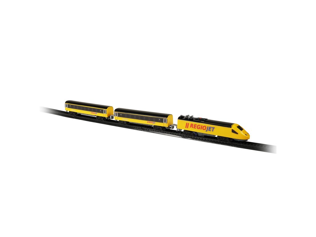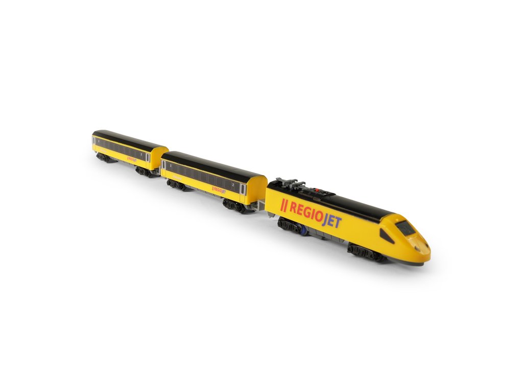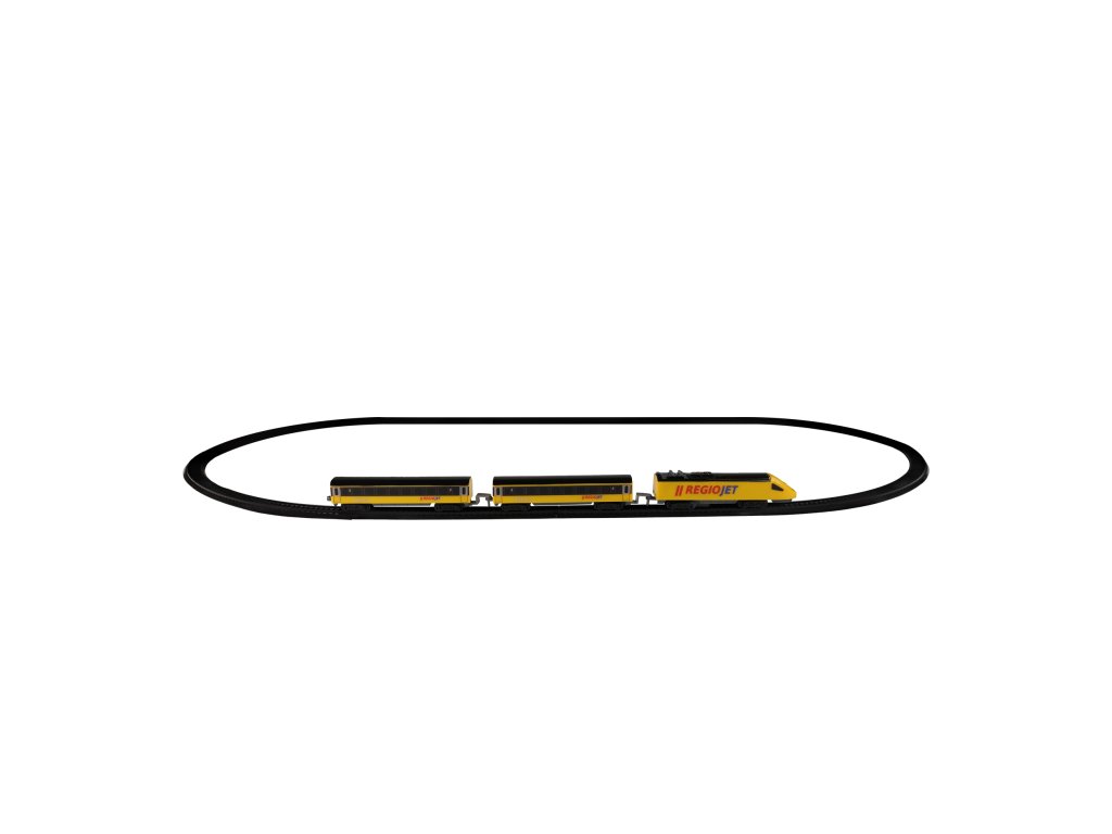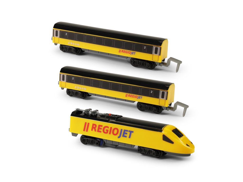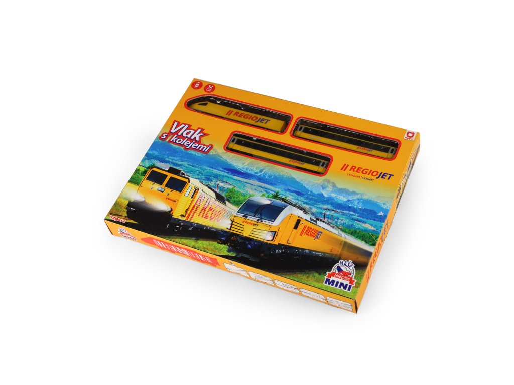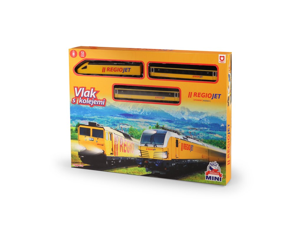Milujete cestování vlakem? Tak sestavte koleje, postavte na ně lokomotivu, připojte vagóny a vzhůru za dobrodružstvím! Originální žlutý vlak RegioJet od Student Agency obsahuje žlutou lokomotivu a 2 žluté vagónky, 8 zahnutých a 4 rovné koleje. Lze vytvořit kolejiště až do velikosti 96 x 58 cm. Rozteč kolejí je 1,4 cm. Lokomotiva měří na délku 14 cm a vagón 13,5 cm. Lokomotiva jezdí na 1 ks AA baterie (není součástí), na střeše lokomotivy vypínačem ON/OFF (zapnuto/vypnuto) uvedete vlak do chodu. Vlak RegioJet MINI lze kombinovat s vlakem Pendolino MINI a Slovenské dráhy MINI.