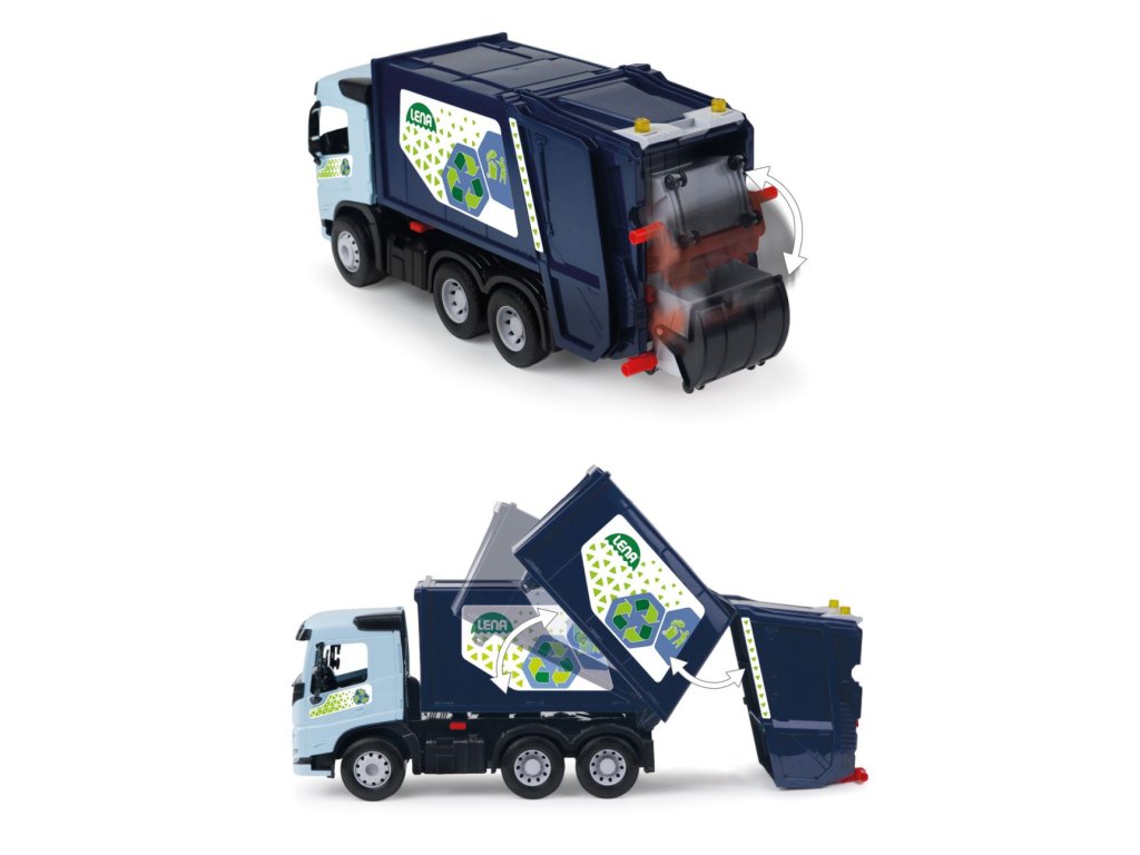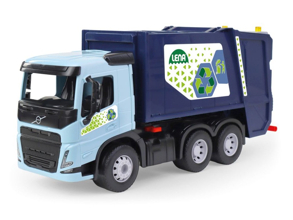 Auto popelářské WORXX Volvo má 6mm tlusté kovové osky u kol. Součástí je pojistka proti nežádoucímu vyklopení. 1x malá a 1x velké popelnice.