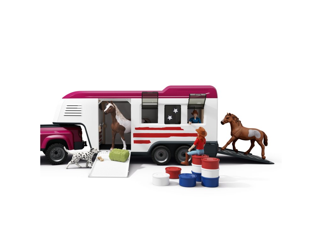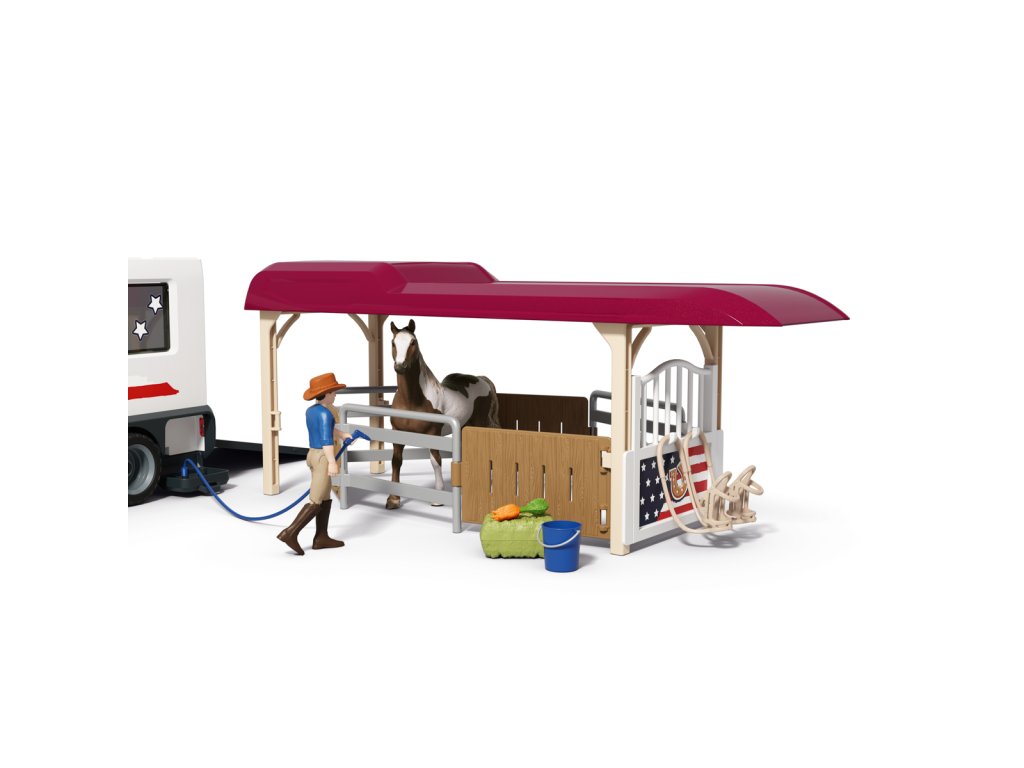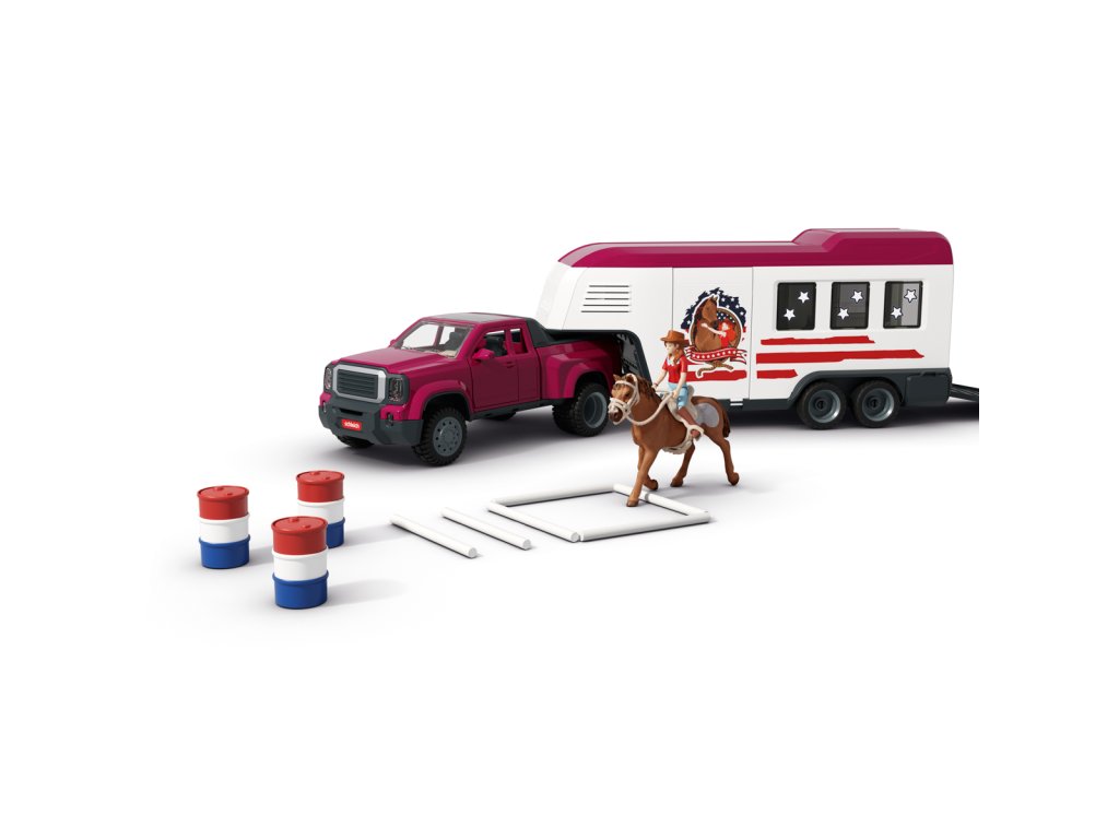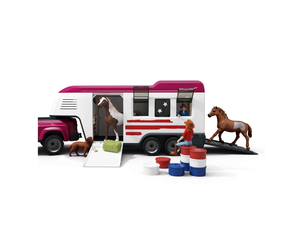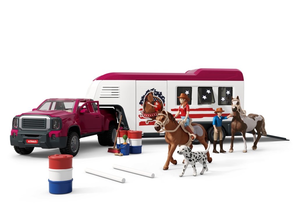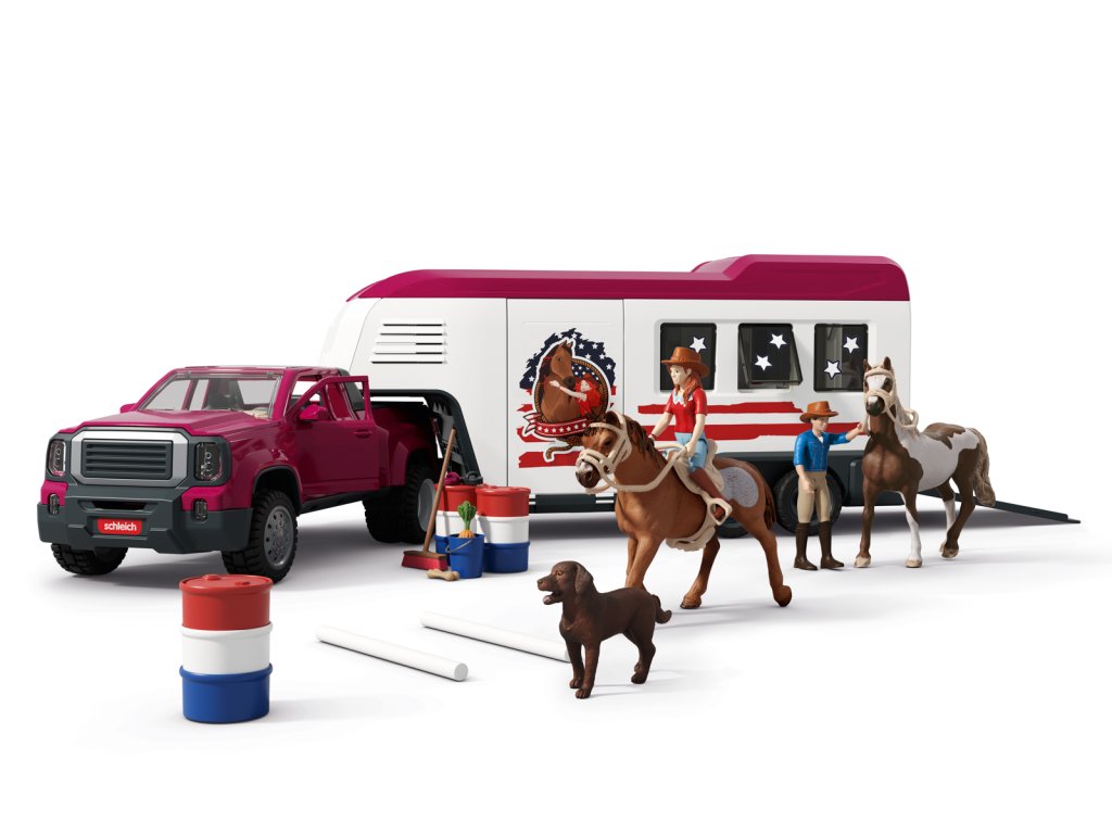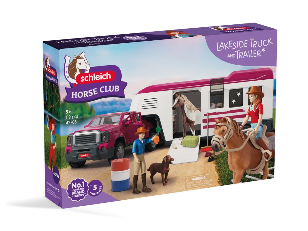 Tú túúúú! Přijíždí nákladní vůz Lakeside s přívěsem od Schleich® HORSE CLUB. Hannah a Mr. Kramer míří za novým westernovým dobrodružstvím. Nakládají koně plemene Quarter Horse a Paint Horse do robustního přívěsu, kam se vejde až pět koní – i labrador může jet s nimi! Mr. Kramer zavírá okna a dveře, zatímco Hannah kontroluje uzdy, sedla a další výbavu. Přívěs má stabilní boxy a úložné přihrádky pro vše potřebné. Po cestě podél polí dorazí do cíle, kde postaví přístřešek a výběh ze střechy přívěsu. Vyloží i tyče a sudy, protože Hannah chce ještě trénovat. Obsah sady: nákladní vozidlo, přívěs pro koně, figurky Hannah a Mr. Kramera, hřebec amerického honáckého koně, valach paint horse, fena labradora, 3 díly plotu + 3 dřevěné vložky, 6 bílých tyčí, 2 uzdy s otěžemi, 2 sedla, hrábě, kartáč, balík sena, mrkev, psí kost, koště, kbelík, hadice, 9 barelových dílů (modré, červené, bílé), 2 kovbojské klobouky, červený náramek, 2 archy samolepek a návod k sestavení. Výrobek Schleich® patří do tematického světa HORSE CLUB a je vhodný pro děti od 5 let. Rozměry balení: 37,5 x 56,5 x 10,5 cm.