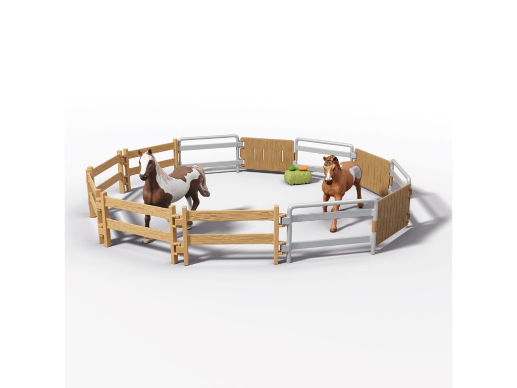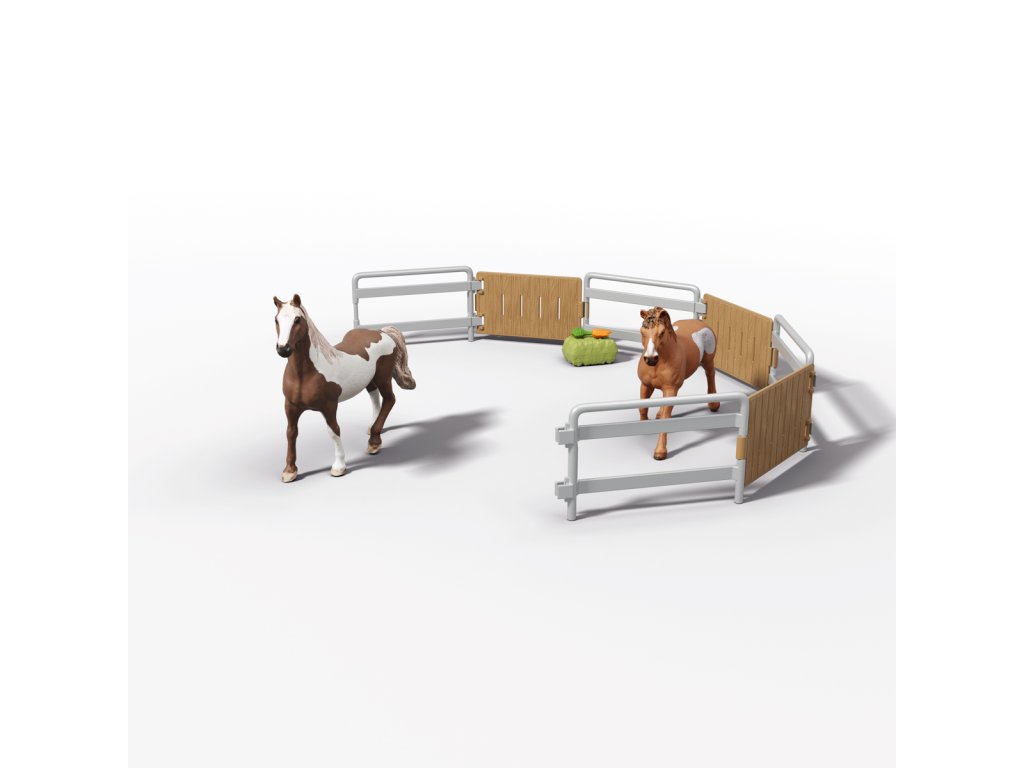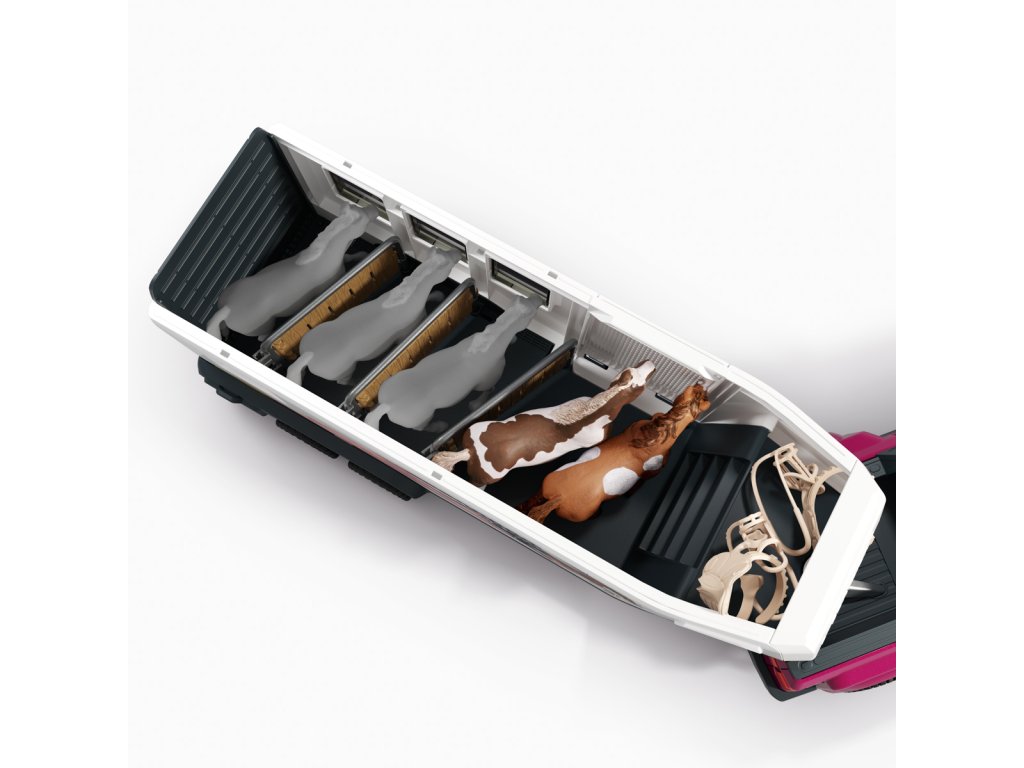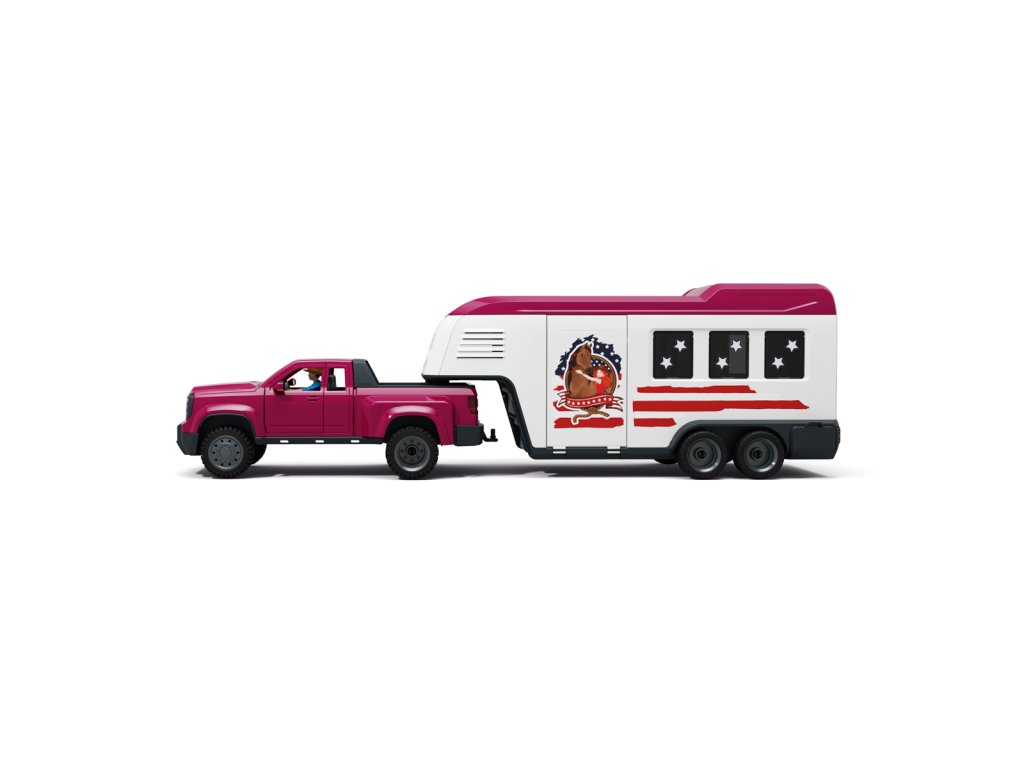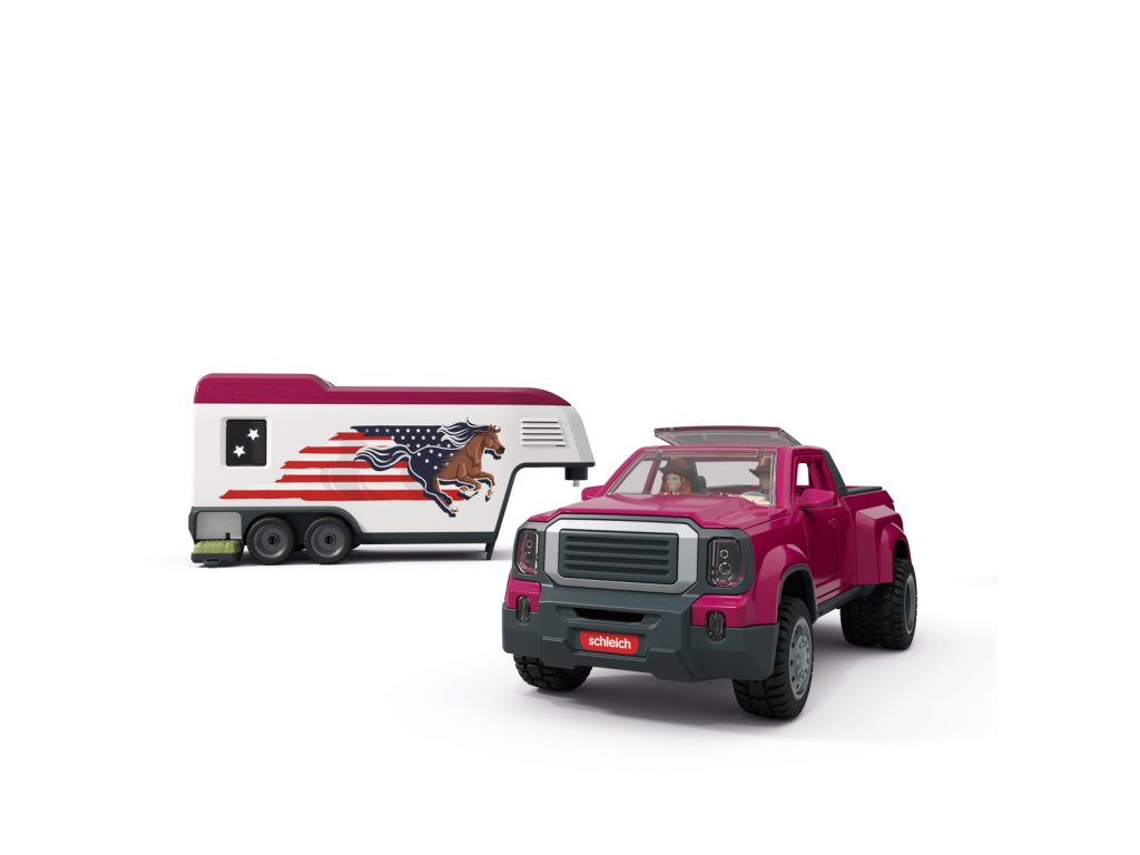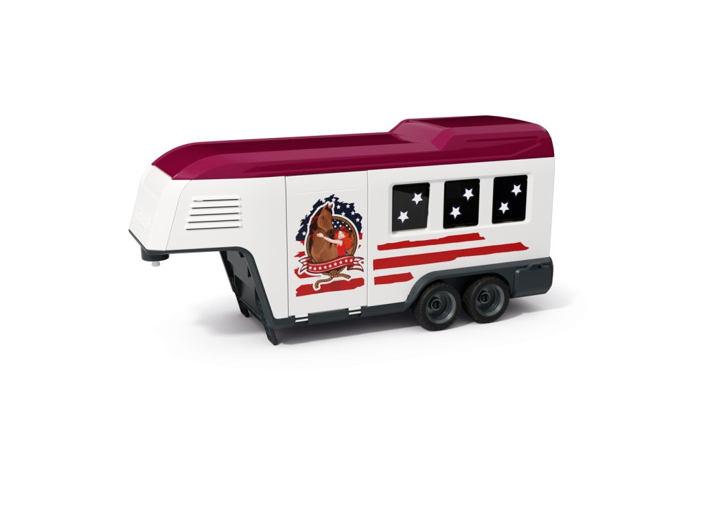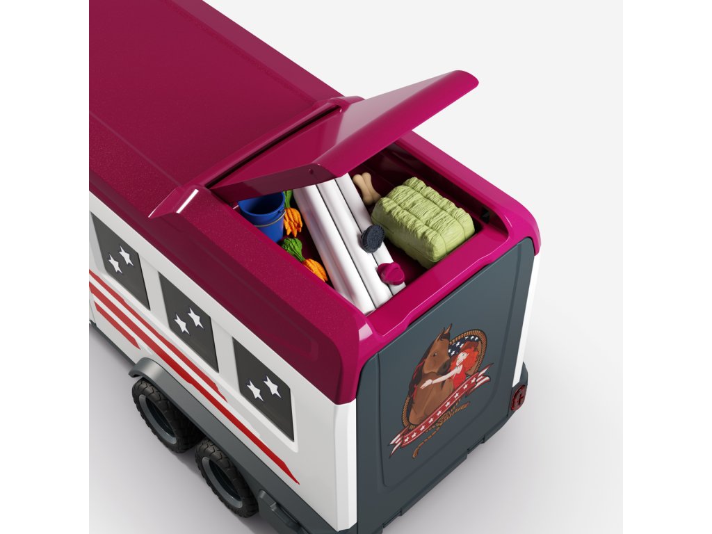 Tú túúúú! Přijíždí nákladní vůz Lakeside s přívěsem od Schleich® HORSE CLUB. Hannah a Mr. Kramer míří za novým westernovým dobrodružstvím. Nakládají koně plemene Quarter Horse a Paint Horse do robustního přívěsu, kam se vejde až pět koní – i labrador může jet s nimi! Mr. Kramer zavírá okna a dveře, zatímco Hannah kontroluje uzdy, sedla a další výbavu. Přívěs má stabilní boxy a úložné přihrádky pro vše potřebné. Po cestě podél polí dorazí do cíle, kde postaví přístřešek a výběh ze střechy přívěsu. Vyloží i tyče a sudy, protože Hannah chce ještě trénovat. Obsah sady: nákladní vozidlo, přívěs pro koně, figurky Hannah a Mr. Kramera, hřebec amerického honáckého koně, valach paint horse, fena labradora, 3 díly plotu + 3 dřevěné vložky, 6 bílých tyčí, 2 uzdy s otěžemi, 2 sedla, hrábě, kartáč, balík sena, mrkev, psí kost, koště, kbelík, hadice, 9 barelových dílů (modré, červené, bílé), 2 kovbojské klobouky, červený náramek, 2 archy samolepek a návod k sestavení. Výrobek Schleich® patří do tematického světa HORSE CLUB a je vhodný pro děti od 5 let. Rozměry balení: 37,5 x 56,5 x 10,5 cm.