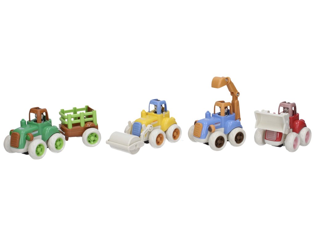 Auto pracovní stroje na setrvačník. Rozměry 16x7,5x7,5 cm. Display box 8 ks. 4 varianty - válec, bagr, buldozer, traktor.