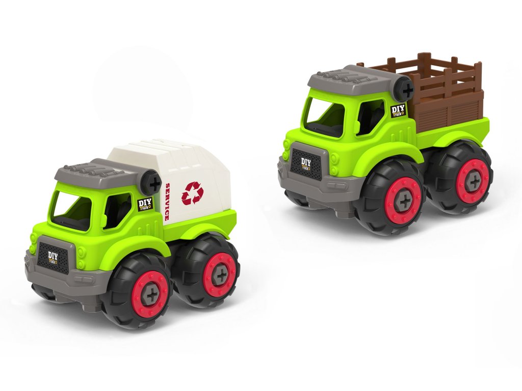 Auto šroubovací. Rozměry 13x9x9 cm. Volná kola. Obsahuje auto, šroubovák.2 varianty - nákladní, popelářské.