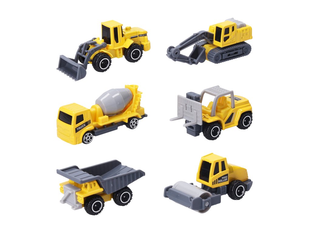 Auto stavební stroje. Velikost 8 cm. Vyrobeno z kovu. Volná kola. Display box 36 ks. 6 variant - sklápěč, buldozer, bagr, domíchávač, válec, vozík.