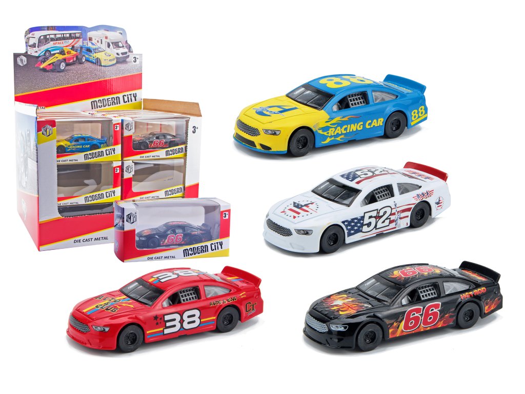 Auto závodní na zpětné natažení. Rozměry auta 10,5x4,2x2,8 cm. Display box 24 ks. 4 varianty - modrá, bílá, červená, černá.