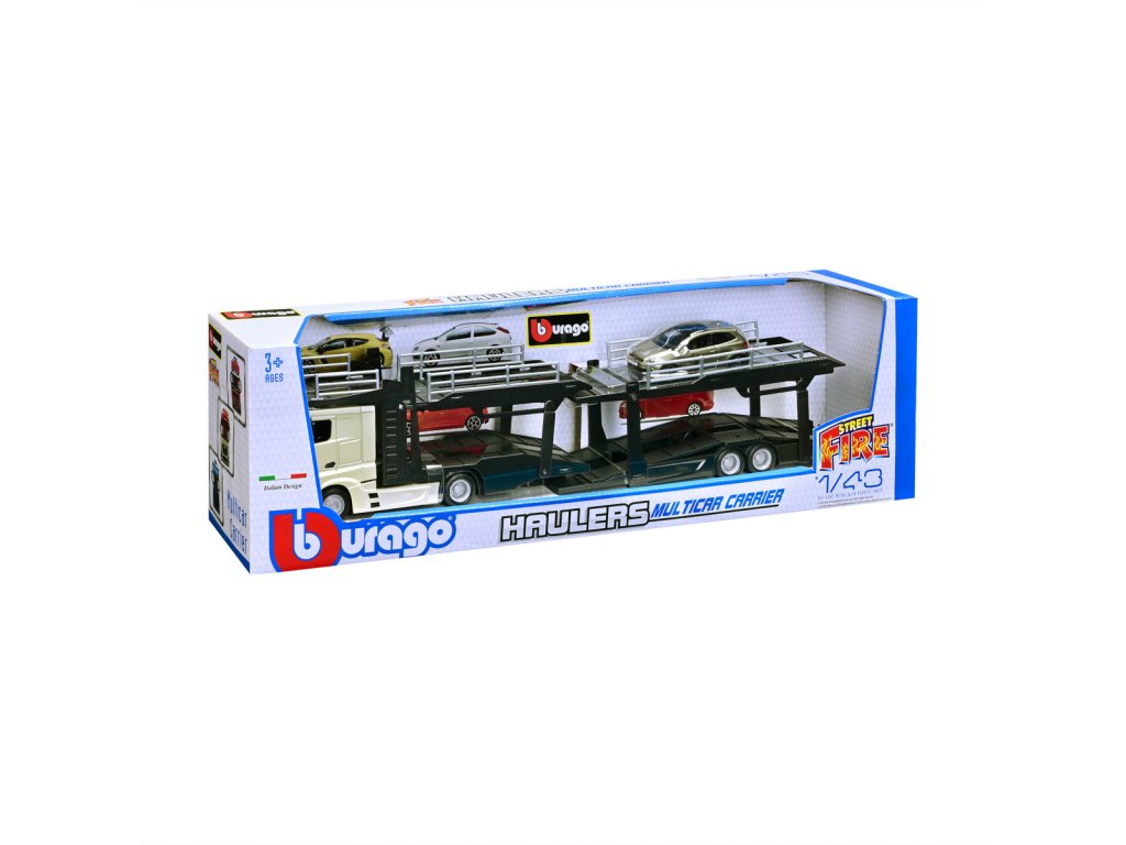 Modely kamionů v měřítku1:43 Multicar Carrier s návěsem pro přepravu aut z kolekce Street Fire jsou sbírkou modelů s vysokým důrazem na přesnost detailů. Modely jsou vyrobeny z litého kovu s plastovými detaily. Každý z kamionů je doplněn jedním modelem osobního automobilu. V přepravním návěsu mohou malí řidiči převážet až pět autíček z kolekce Street Fire. Baleno v krabičce. Nevhodné pro děti do 3 let. Rozměry balení: 15,5 x 52,1 x 11,8 cm. Věk: 3+