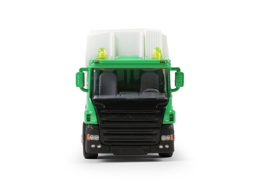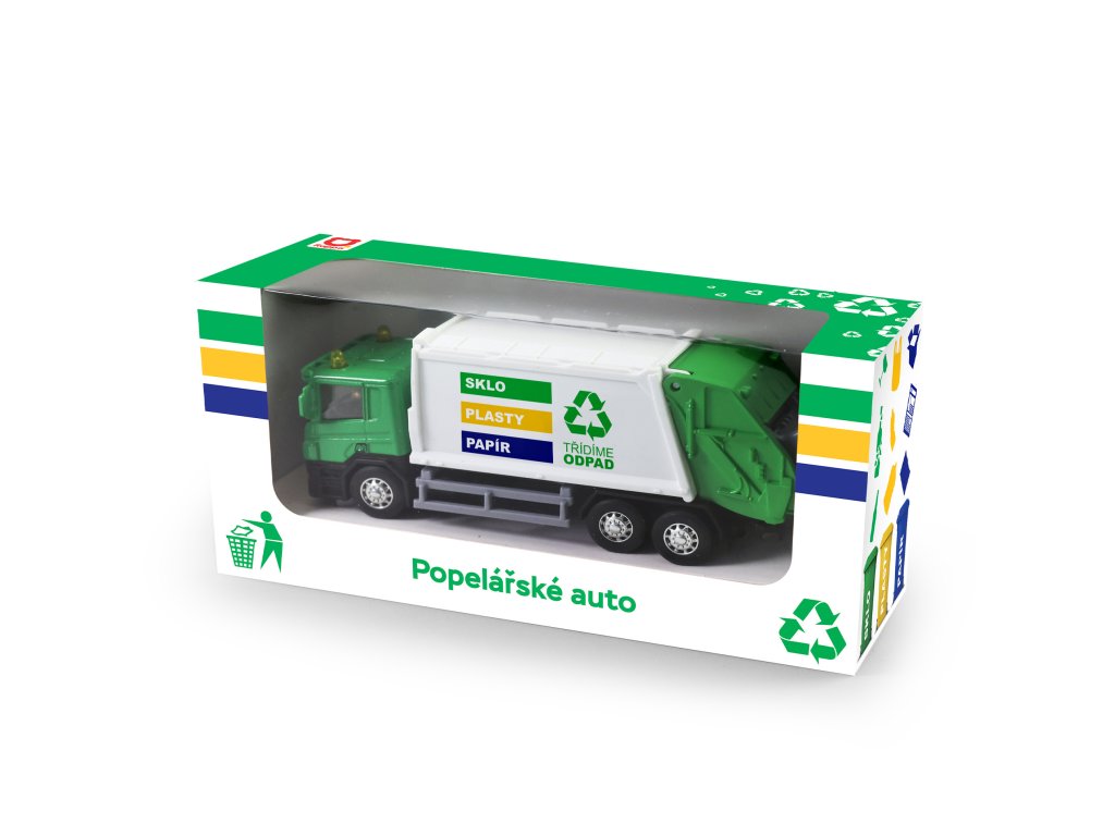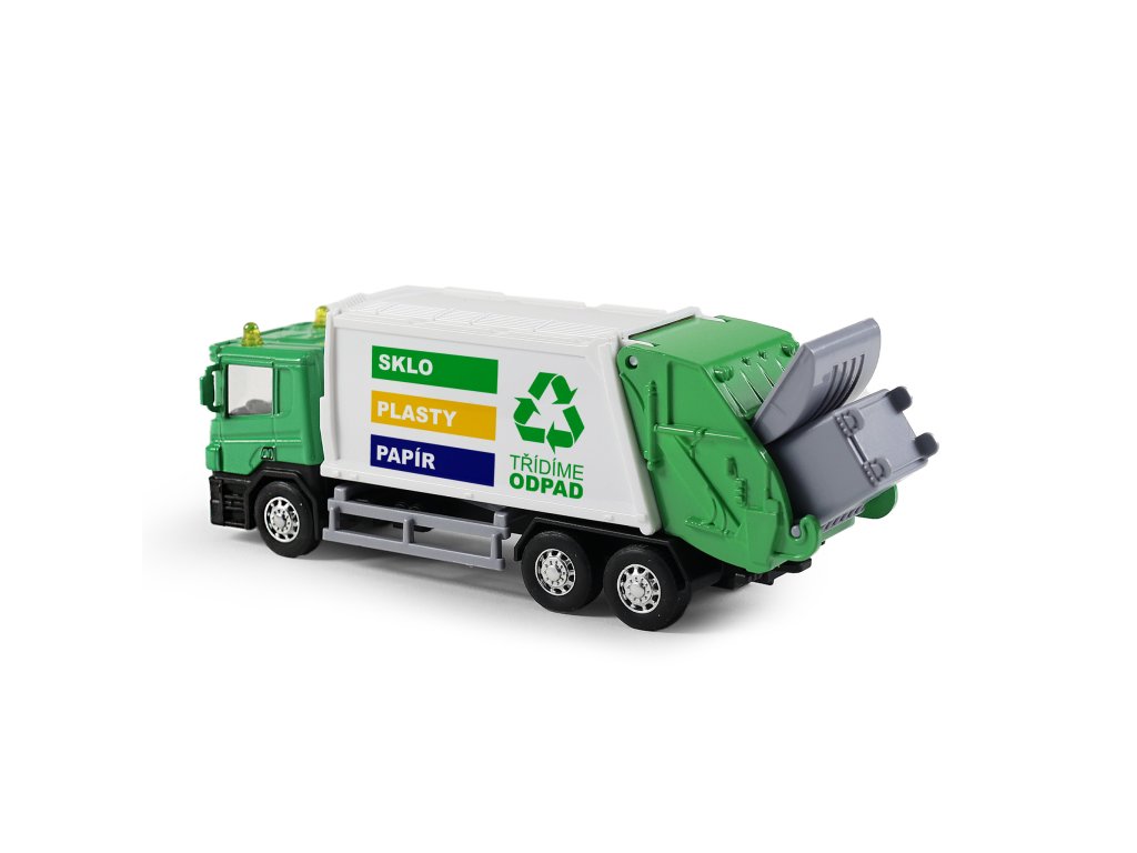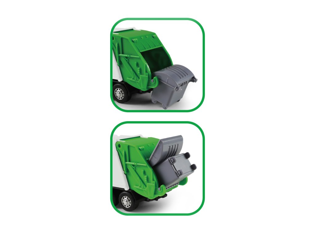 Kovové popelářské auto s plastovou korbou. Korba má v zadní části odklápěcí dveře, součástí je otevírací kontejner. Auto jezdí na zpětný chod a jeho délka je 15 cm.