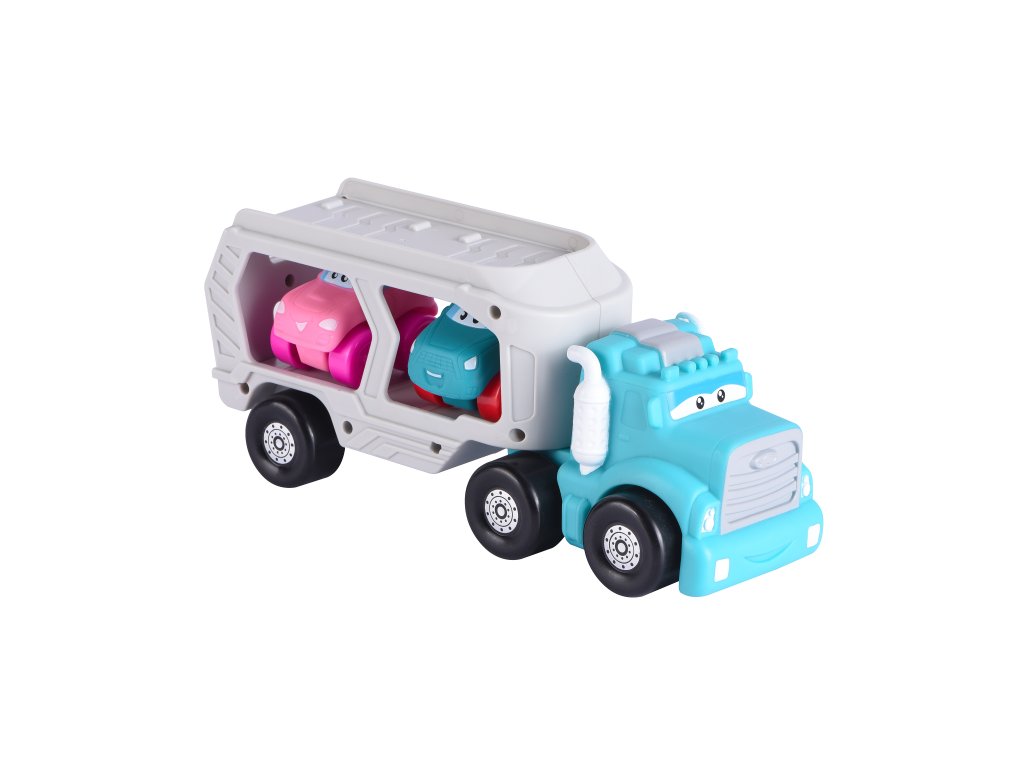 Tahač s auty. Velikost tahače 24 cm. Obsahuje tahač a dvě auta. Volná kola.