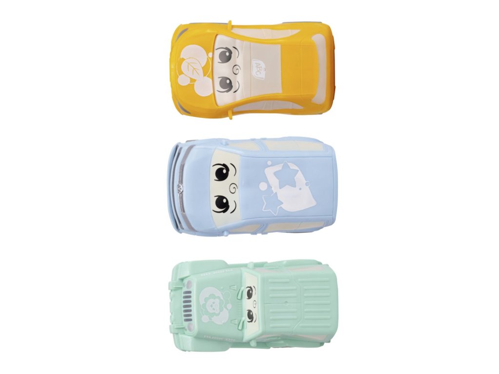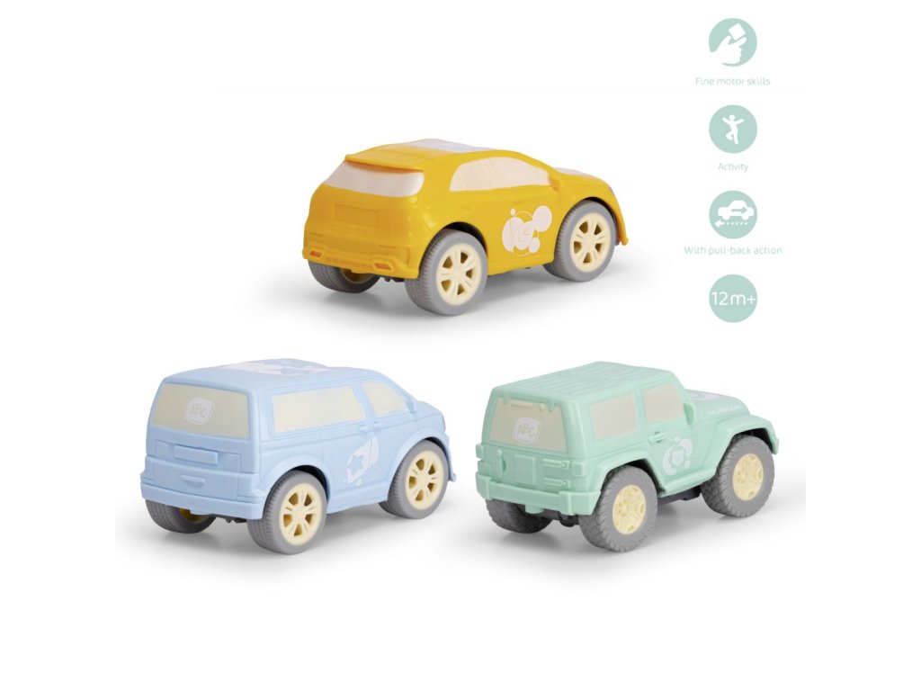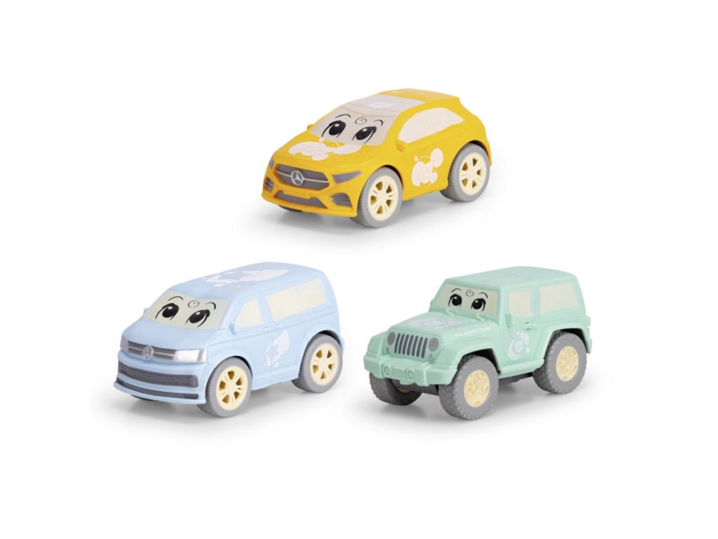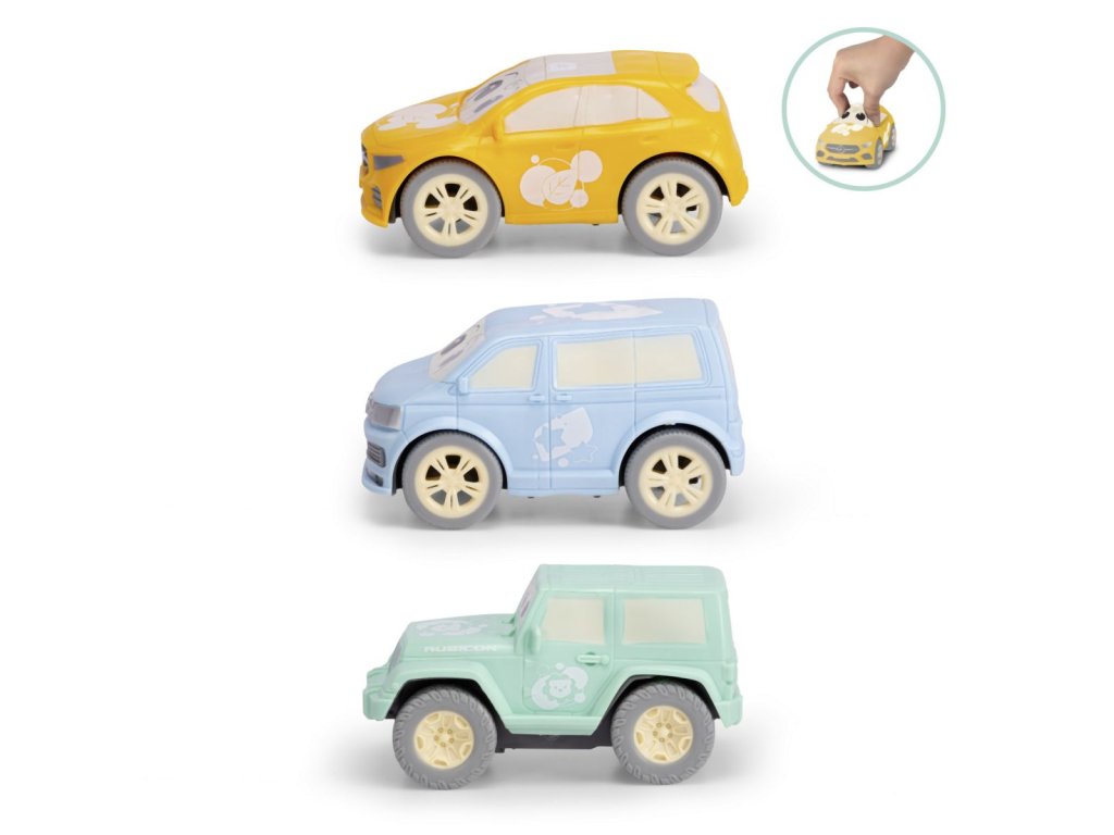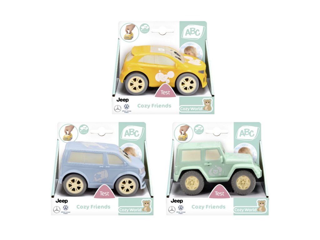 Veselé autíčko pro nejmenší, na natažení. Namalovaná očíčka a stlačitelné tělo. 3 druhy - Jeep, Mercedes, Volkswagen bus. Délka 11 cm.