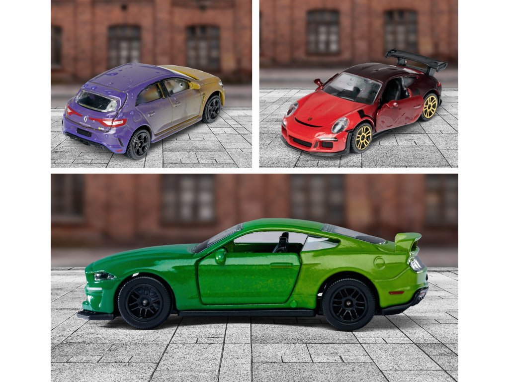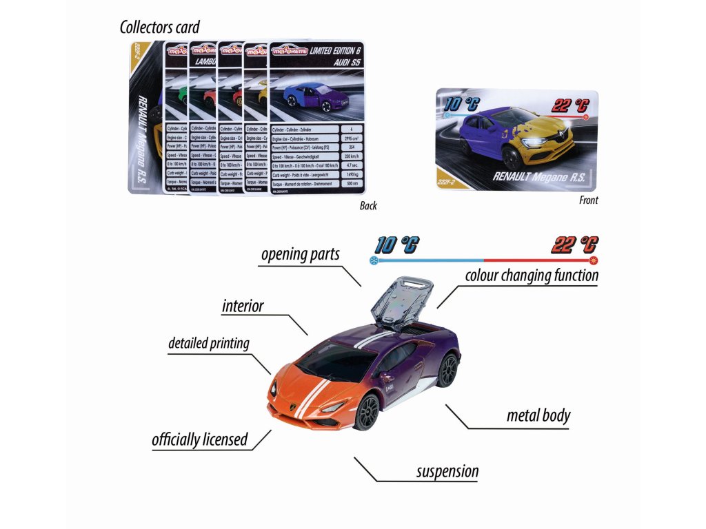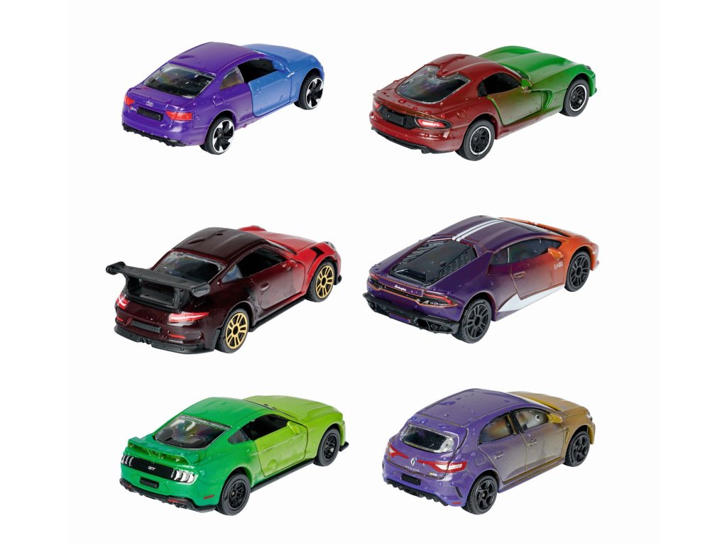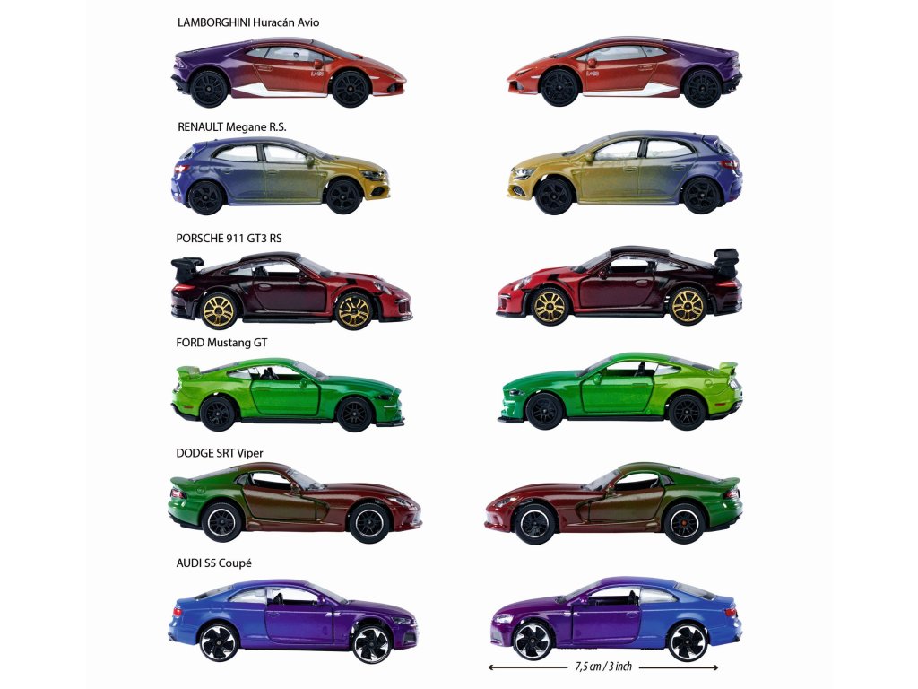 Limitovaná edice super metalických vozidel, 6 různých kovových modelů na volnoběh s otočnými koly a odpružením. Modely: Dodge Challenger SRT Hellcat, Ford F-150 Raptor, Lamborghini Huracán Coupé, Bentley Continental GT V8 S, Nissan GT-R Nismo GT3, Mercedes-Benz G 500. Dlouhá životnost díky prémiovému kovovému podvozku. Kovové designy s neotřelou chromovou úpravou . Otevírací díly . Obsahuje sběratelskou kartu se speciálním hologramovým efektem. Délka 7,5 cm.
