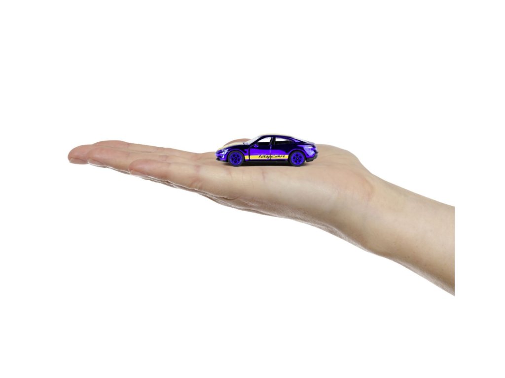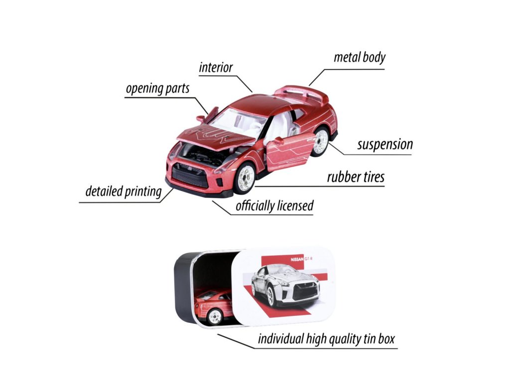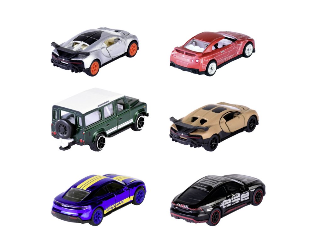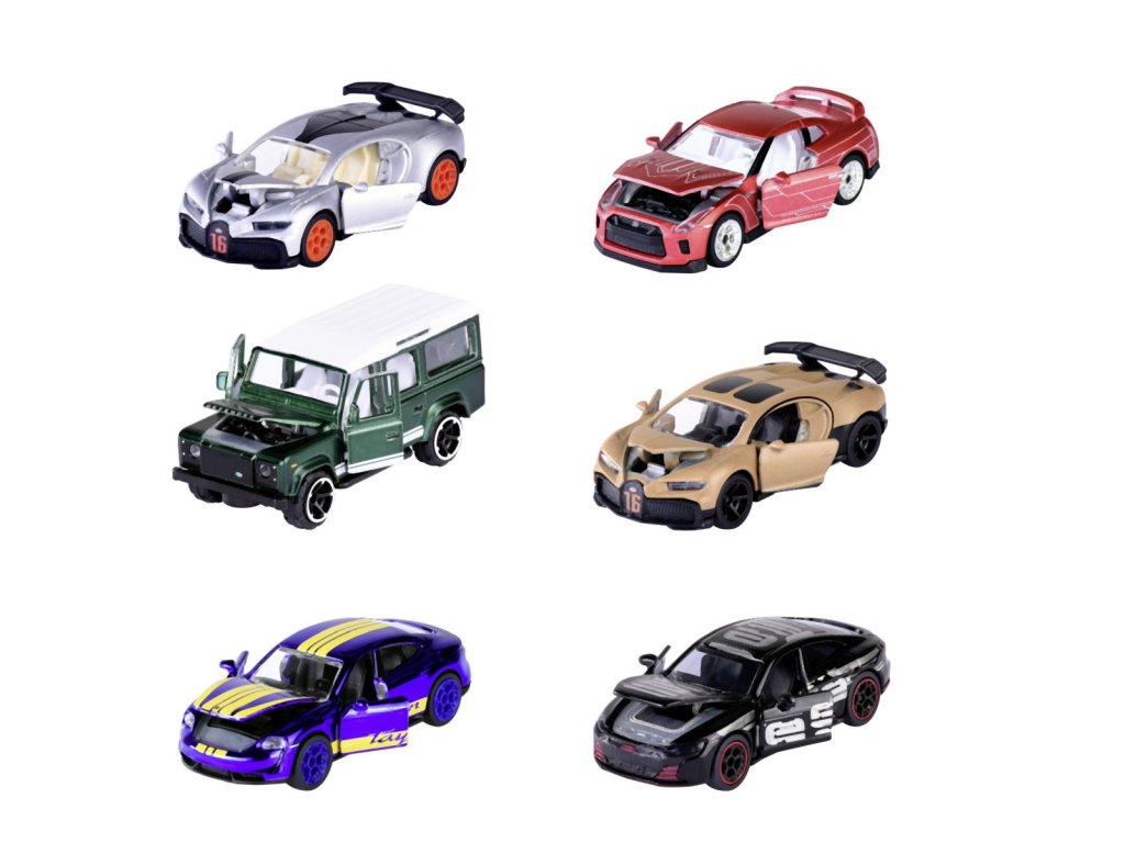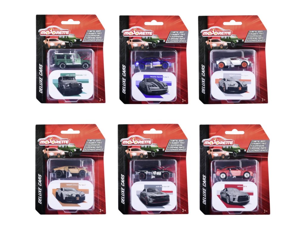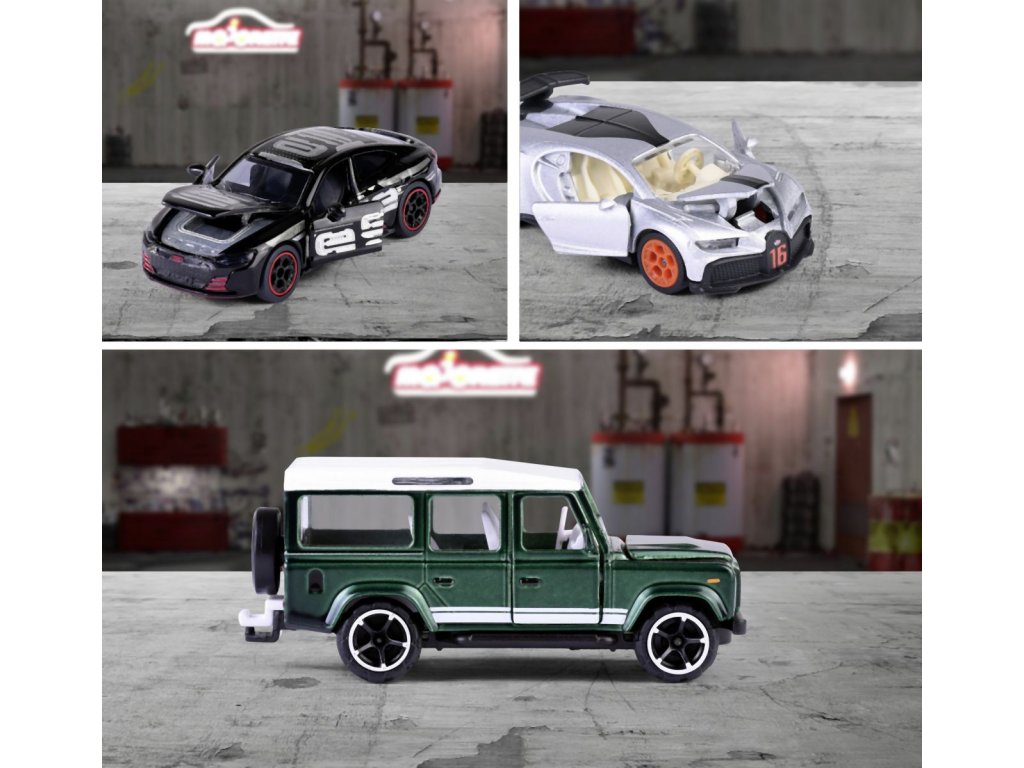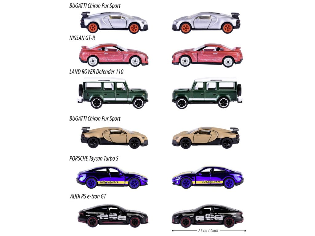 Kovové autíčko z kolekce Deluxe Cars na volnoběh. S více otevíratelnými částmi (dveře/kapota).V kolekci je 6 druhů autíček: Audi RS e-tron GT, Bugatti Chiron Pur Sport stříbrné, Bugatti Chiron Pur Sport bronzové ,Nissan GT-R Porsche Taycan Turbo S, Land Rover Defender 110. Sběratelská plechová krabička je součástí. Délka autíčka 7,5 cm. V měřítku 1:64.