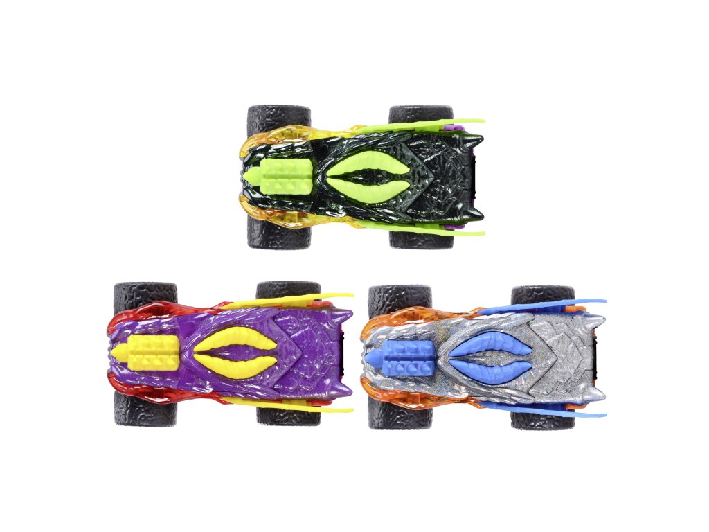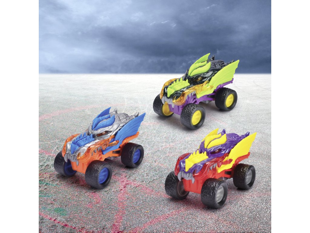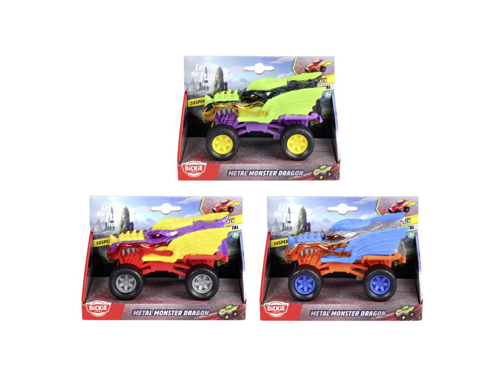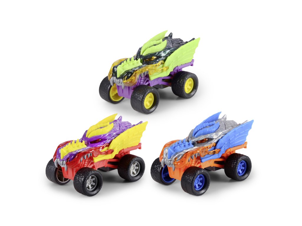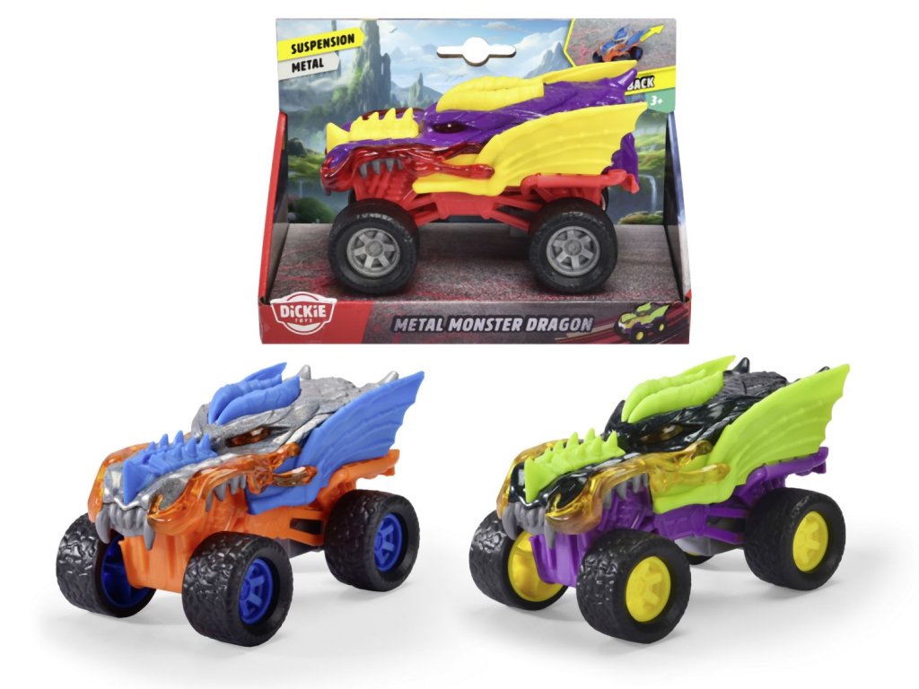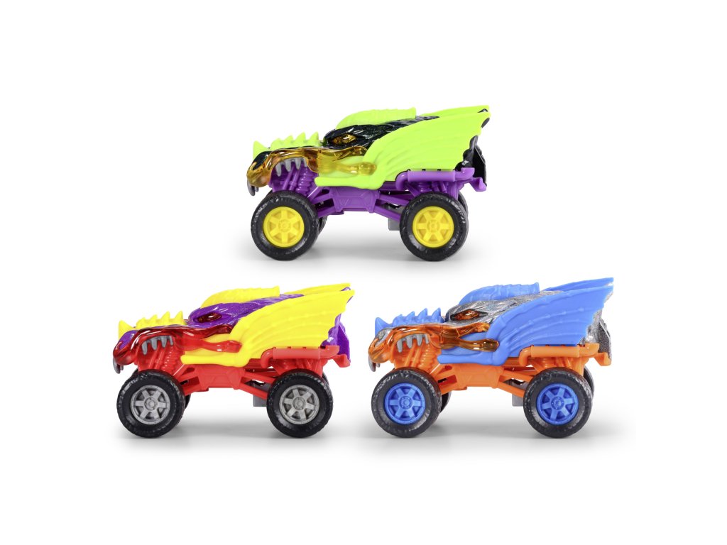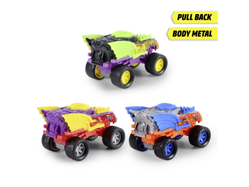 Auto Monster Dragon do terénu s kovovým tělem na natažení, gumové pneumatiky. Délka 15 cm, 3 barevné variaty.