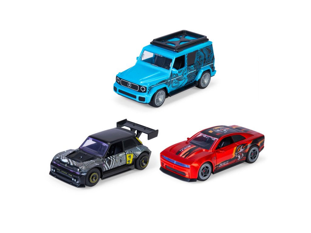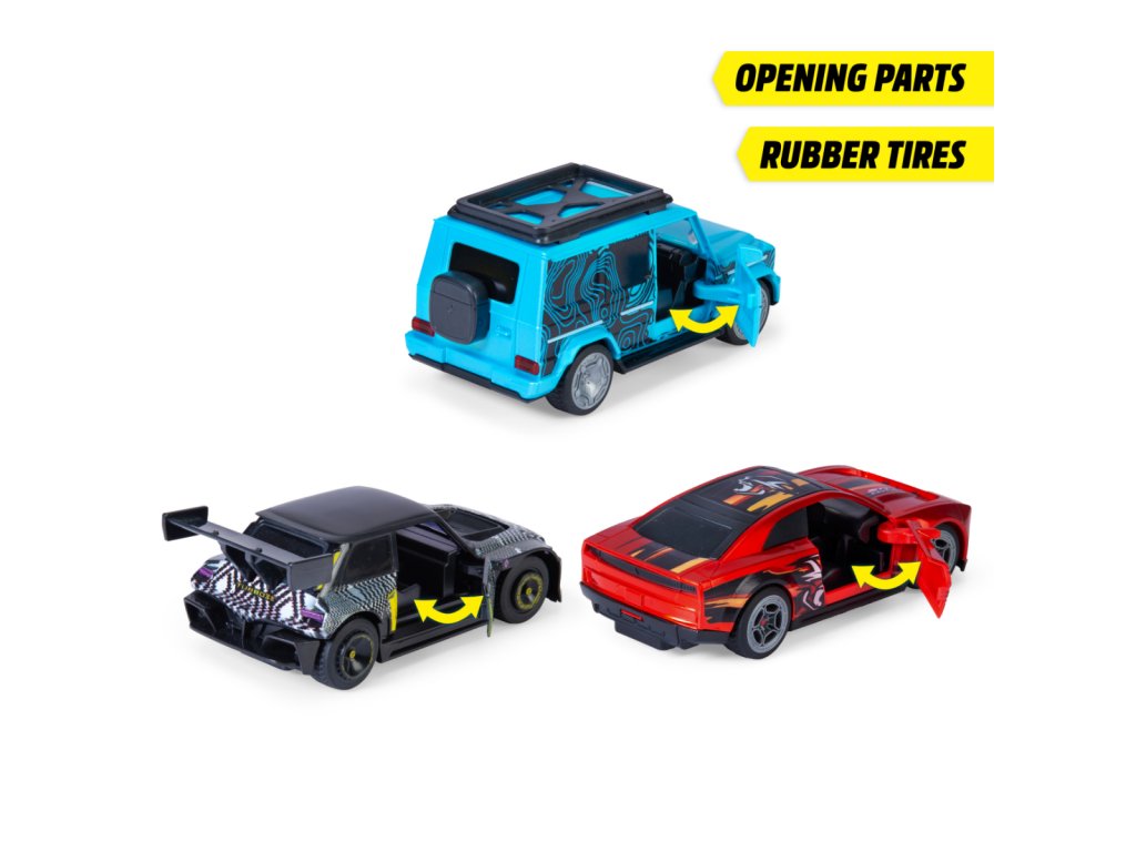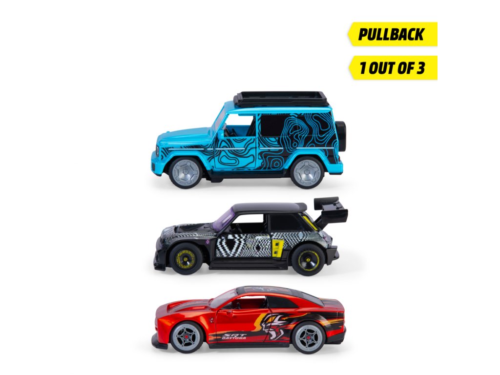 Auto Pullback Racer na setrvačník, otevíratelné dveře s gumovými pneumatikami. 3 druhy - MB, Dodge a Renault. Délka 15 cm.