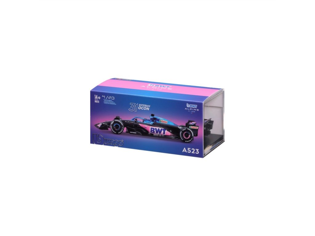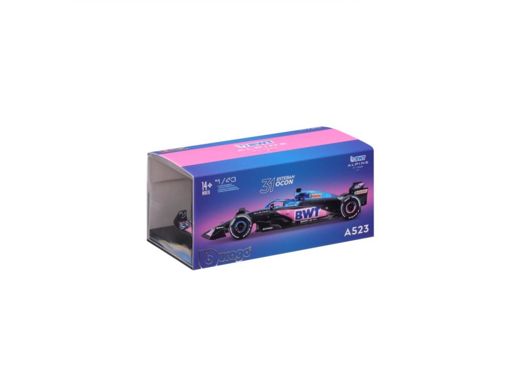 Kovový model formula - Bburago 1:43 RACE Formula F1 - BWT Alpine F1 Team A523 (2023) #31 (Esteban Ocon) - s řidičem v dekorativním boxu