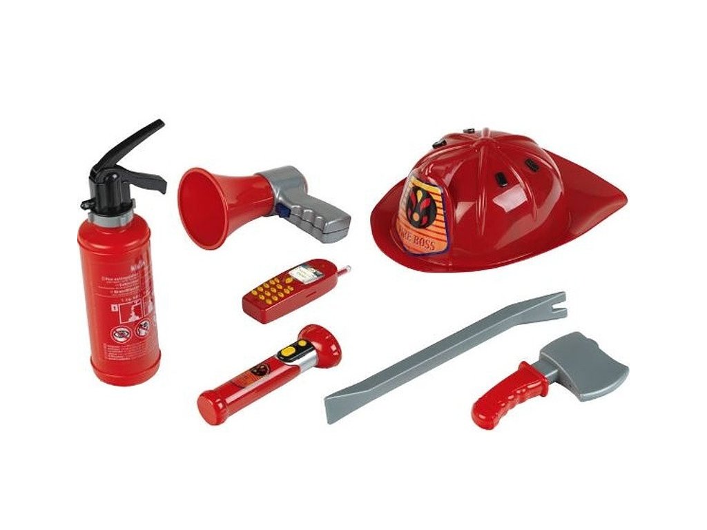 Dětská sada pomůcek vhodná pro malé hasiče. Sada obsahuje 7 kusů – helma, hasičák, svítilna na baterie 1,5V AA R6 (nejsou součástí), páčidlo, sekera, megafon dětský na baterie 1,5V AA R6 (nejsou součástí) a mobilní telefon. Vhodné pro děti od 3 let.