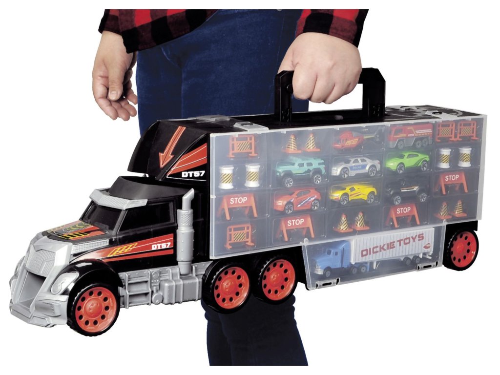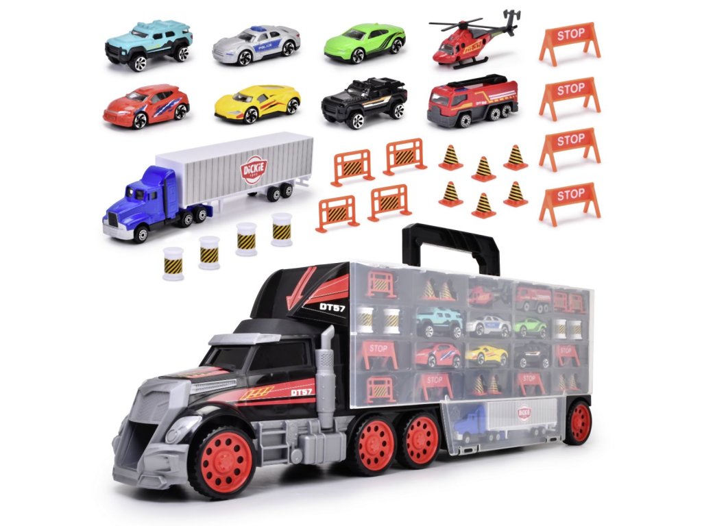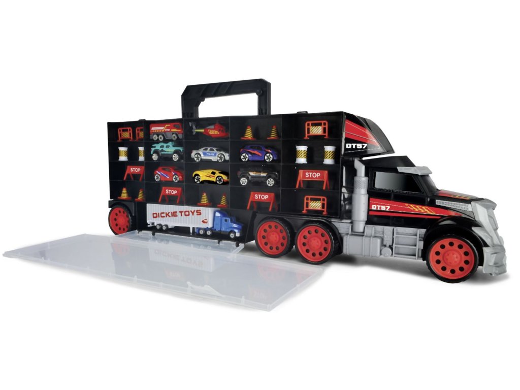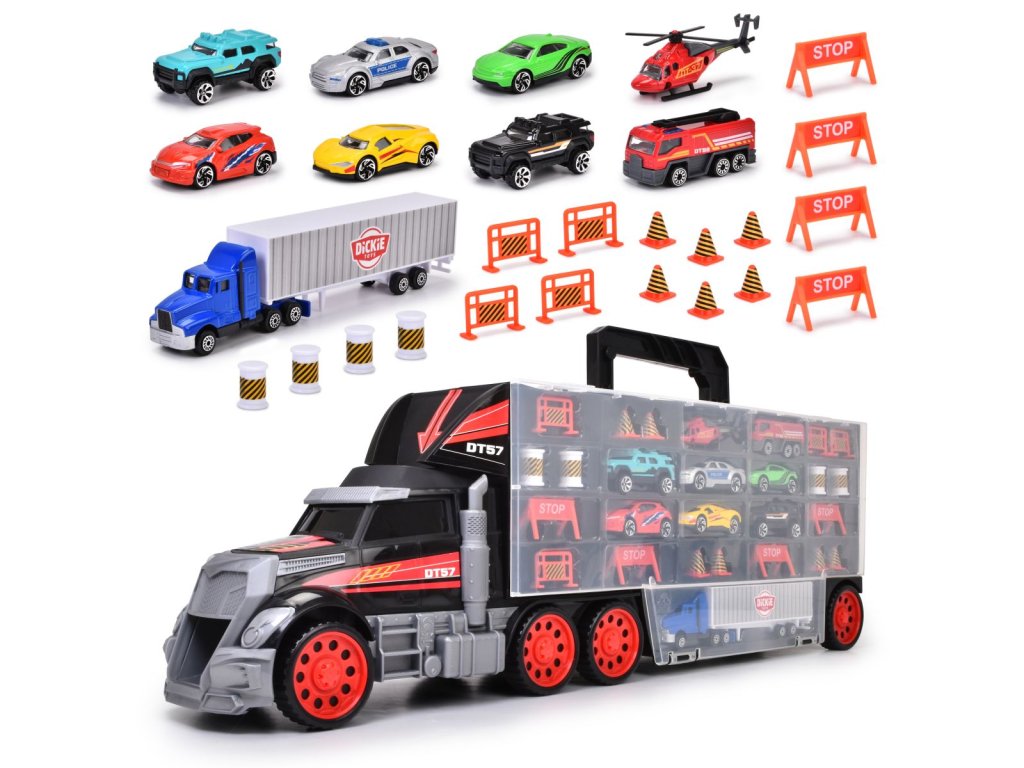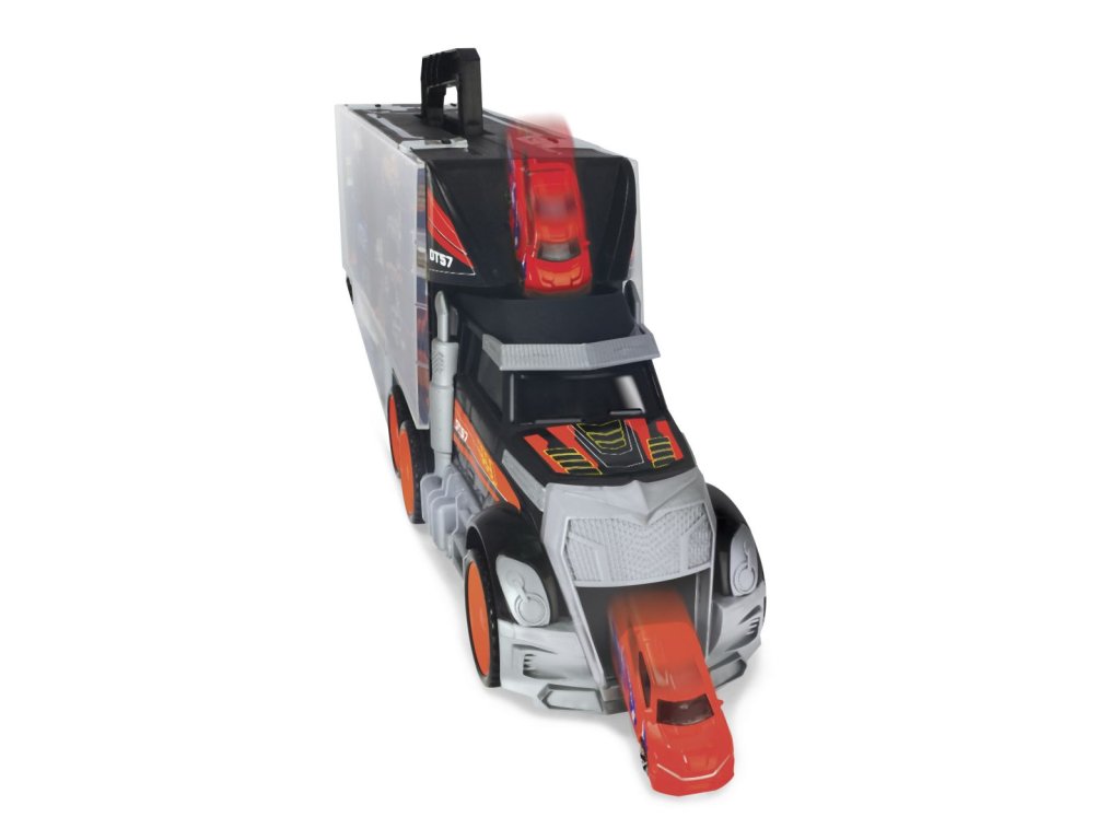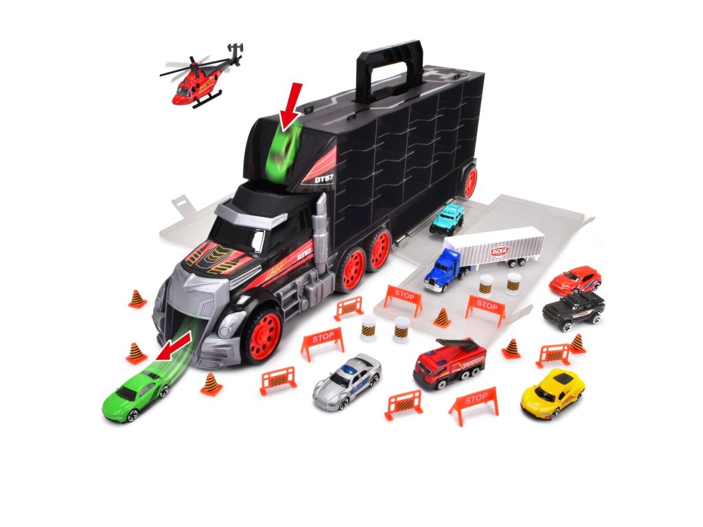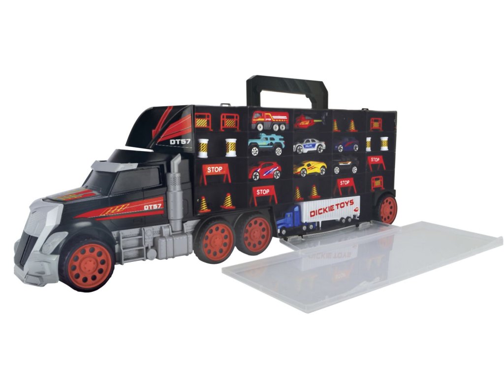 Velká souprava s příslušenstvím ve tvaru kamionu, s rukojetí. Včetně 7 kovových autíček, nákladního auta a vrtulníku. S manuální vystřelovací funkcí z kabiny kamionu. Délka 62 cm.